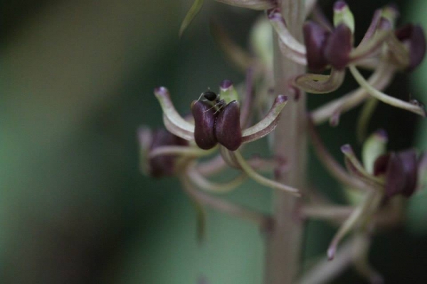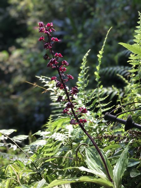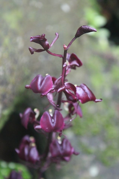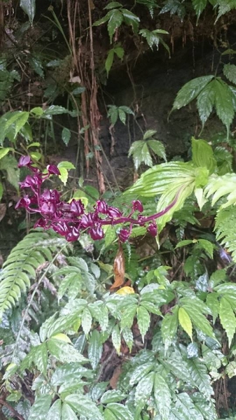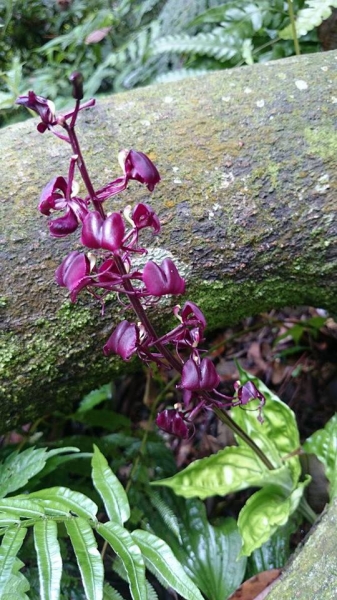 - 花莖頂生 ,直立 ,總狀花序 ,著花約 10餘朵 ;花暗紫色 ,花期 3- 4月