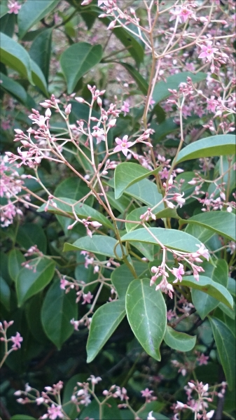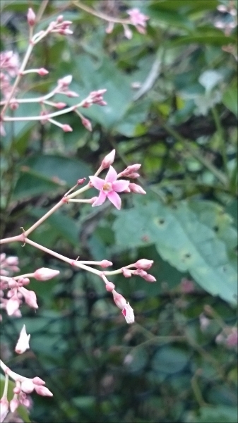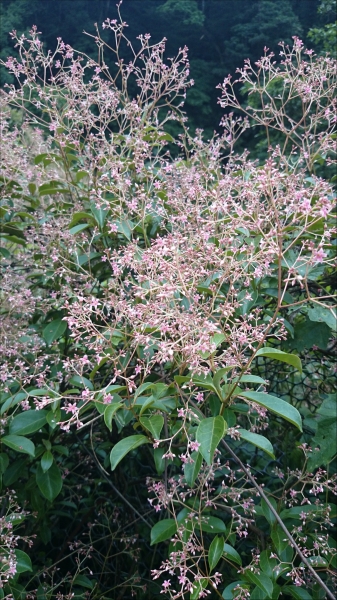 - 聚繖狀圓錐花序,頂生,花多數,花萼細小,粉紅色,深五裂,腺體五枚,花冠闊鐘形,淡紅色,五裂,裂片倒披針形