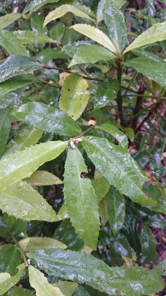 - 單葉,互生,具短柄;葉片長橢圓形、倒披針形或倒卵形,葉基銳形或楔形,葉尖銳尖,葉緣為疏鋸齒緣,上表面光滑,下表面脈腋被毛,上下表面主脈均凸起