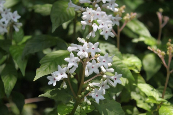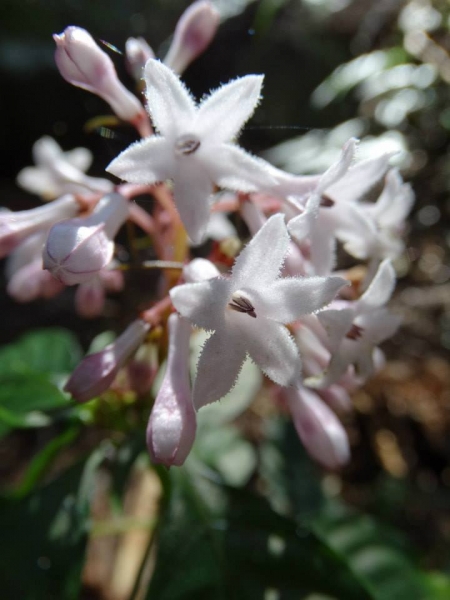 - 白色略帶粉紅色漏斗狀花冠,先端5裂,內側有毛。花朵頂生,聚撒花序,雌雄同株。每朵小花約長1~1.5cm,小花梗長1mm