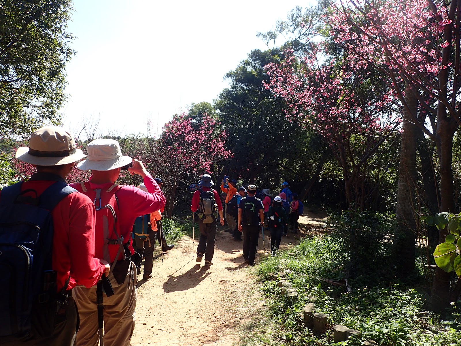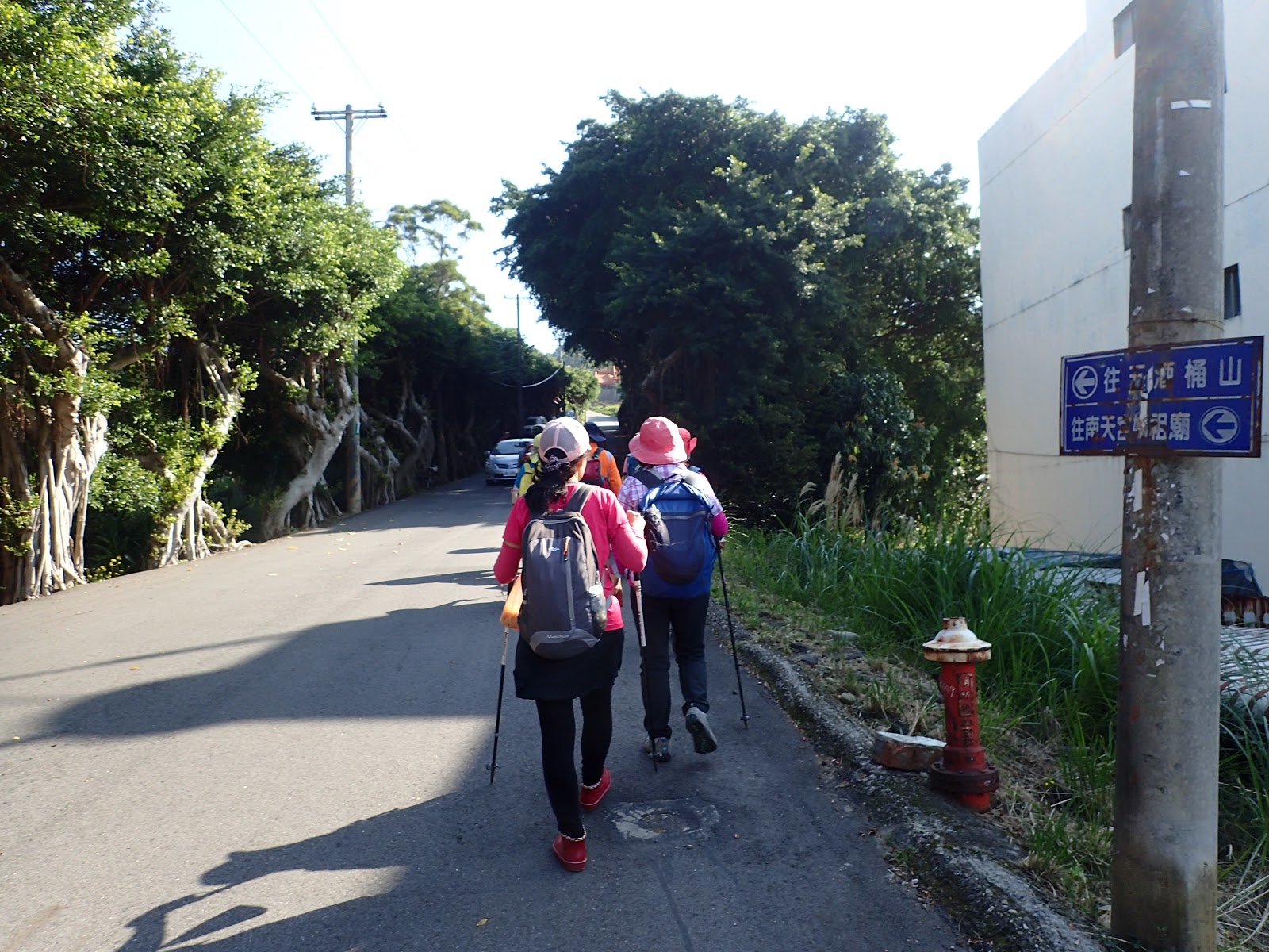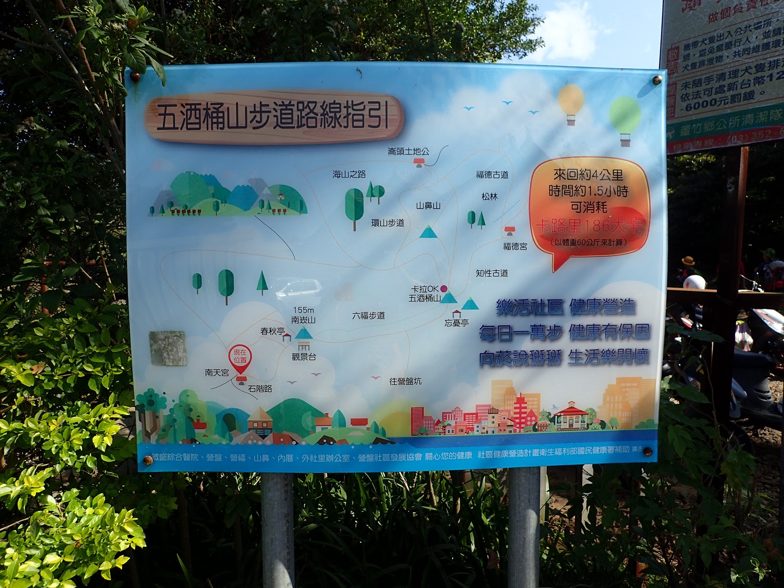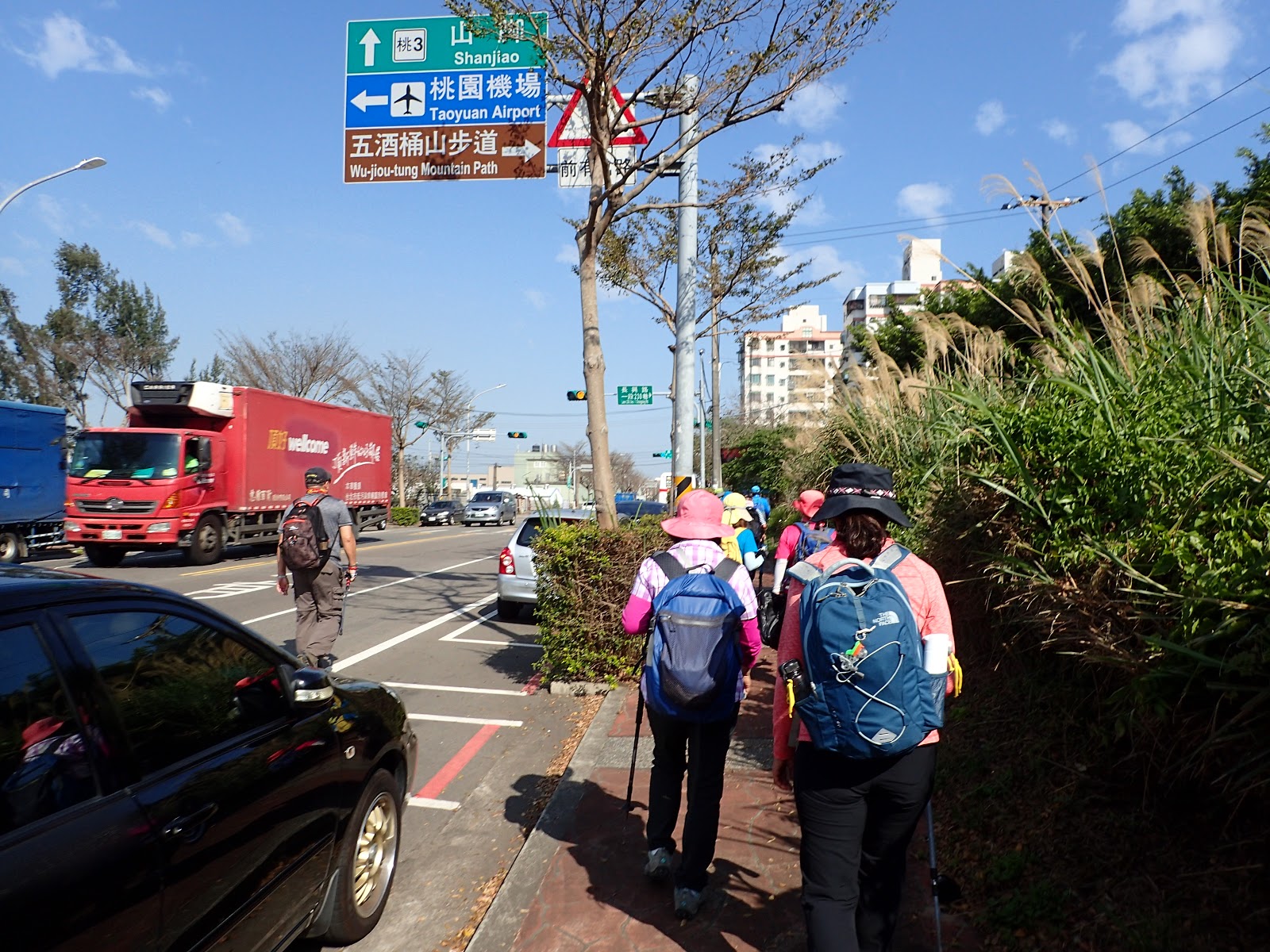 行程路線:六福路右轉長興路1段至230巷後再右轉上山>南天宮>南崁山>五酒桶山>山鼻山>崙頭福德宮>環山步道>營盤坑古道>搭952返北