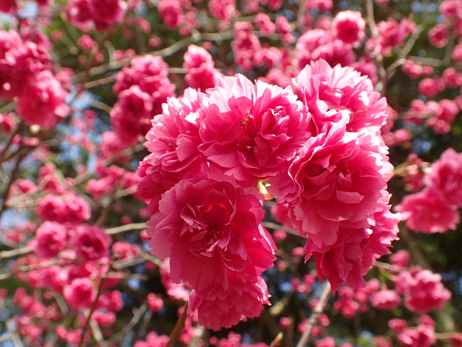 一棵棵繽紛綻放的八重櫻, 千嬌百媚在豔陽下各具迷人姿態