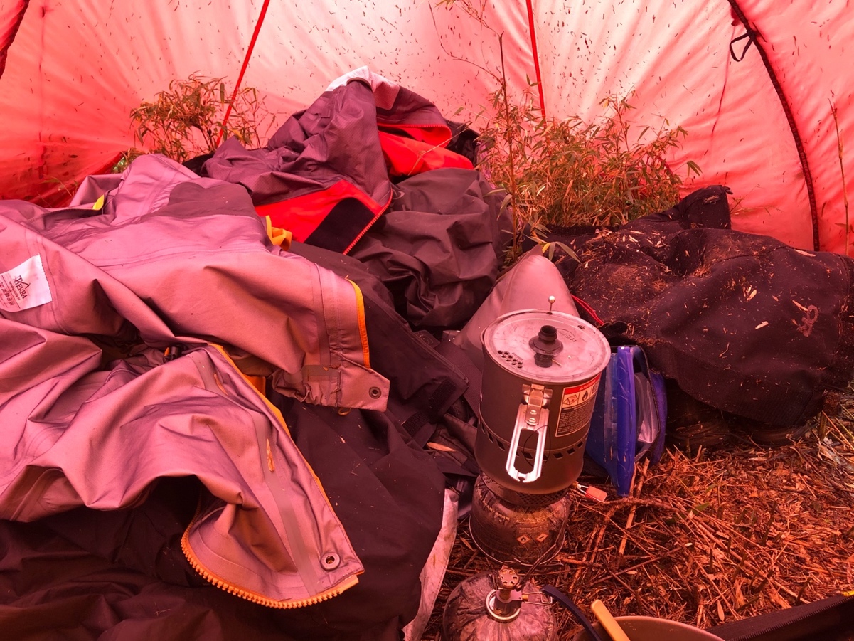 之前打算帶的雙人帳,基本上只有睡覺的空間,沒辦法放下背包,也一定很難在內部煮飯,但因為有了這個超大前庭,即便下雨的時候,也能窩在睡袋裡面煮飯,不必擔心空間不夠,要跑出去淋雨煮飯。更可以將包包、鞋子都放在帳篷內部,讓寶貝的裝備不用風吹雨淋!有一個遮風避雨的前庭,真的讓我們在惡劣的環境中,能夠過得相對舒服一點,不用因為空間太小,將濕掉的衣服放在內帳裡面,而是可以把所有濕掉的裝備,擺放在前庭,既不會讓這些裝備繼續淋得更濕,又能保持內帳的乾燥!