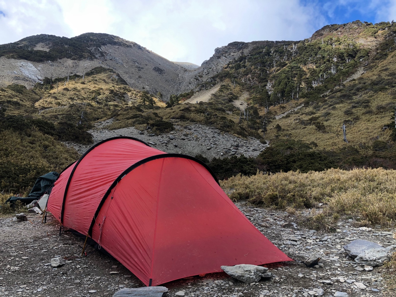 出發前,帳篷的選擇的確也是讓我們苦惱了一陣子,因為我們是冬天走,實在不想要為了輕量化,只帶了外帳來遮風避雨;也因為打算要一起吃飯,不想要準備很輕量的單人帳來使用。原本已經想要折衷方案,就是帶輕量雙人帳,帳篷就是睡覺用。另外再帶一小塊外帳,拿來搭天幕放背包跟煮飯用。後來有幸跟百岳合作,他們很大方地出借帳篷之王 Hilleberg 的隧道二人帳給我們使用,我們當然二話不說答應啦,平常可沒機會用到那麼高級的帳篷誒哈哈