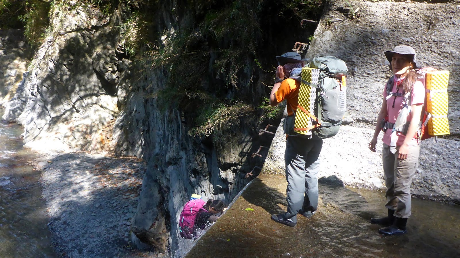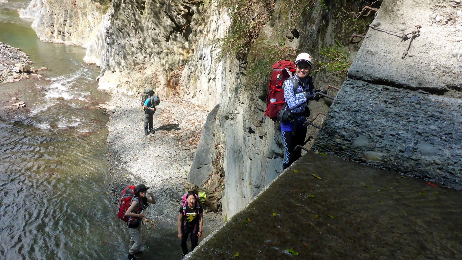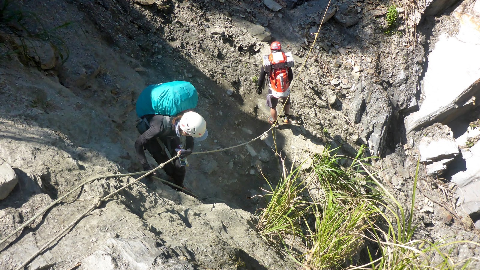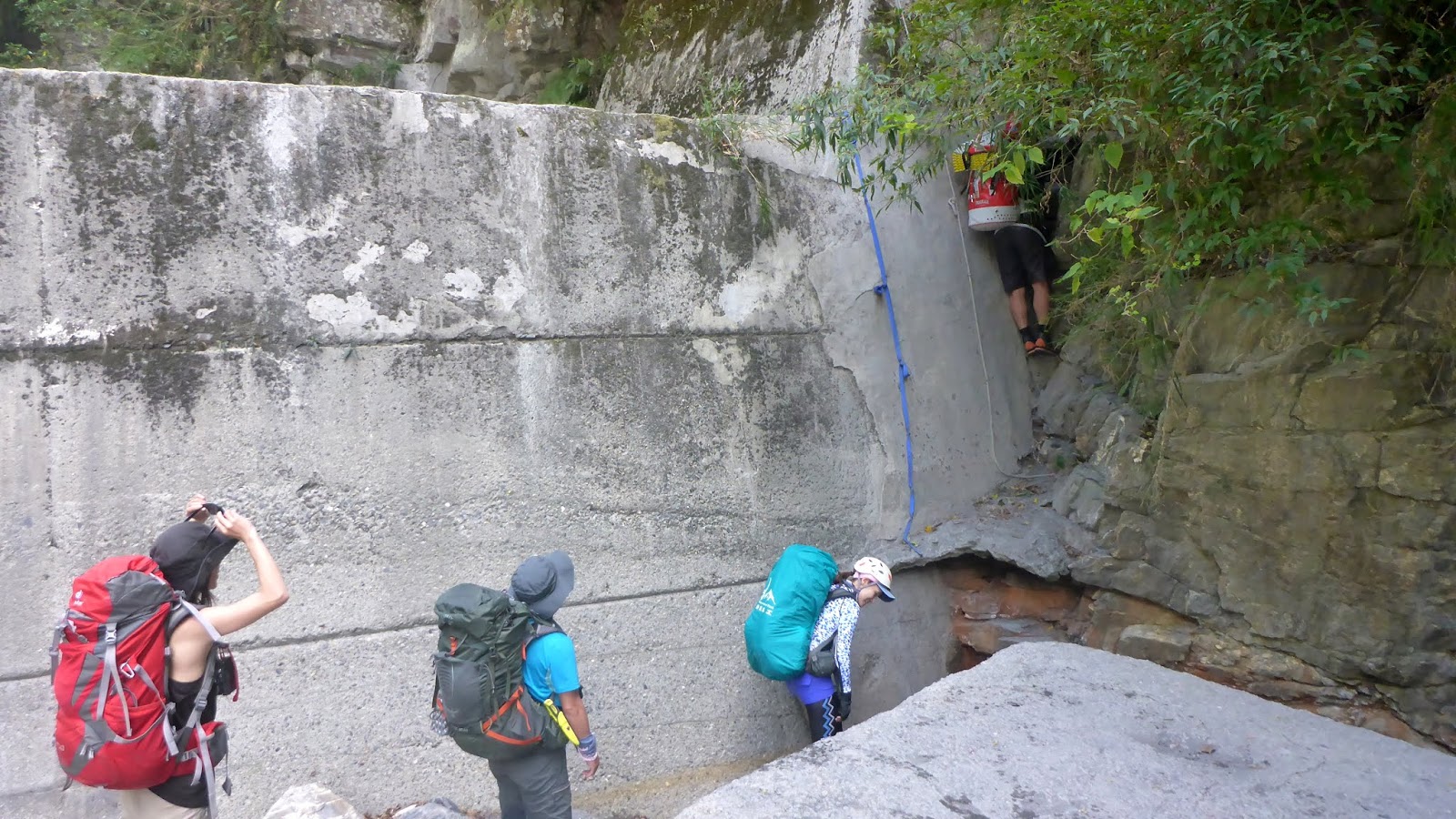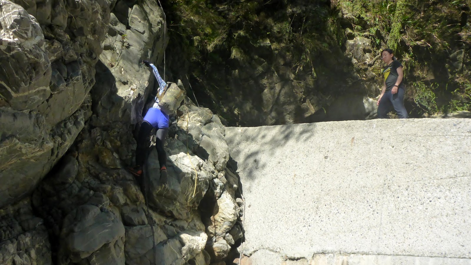 一開始的踩點落差高也有點滑,我們採人包分離的方式,降低徒手攀爬的風險,因為這摔下來真的不是開玩笑的。