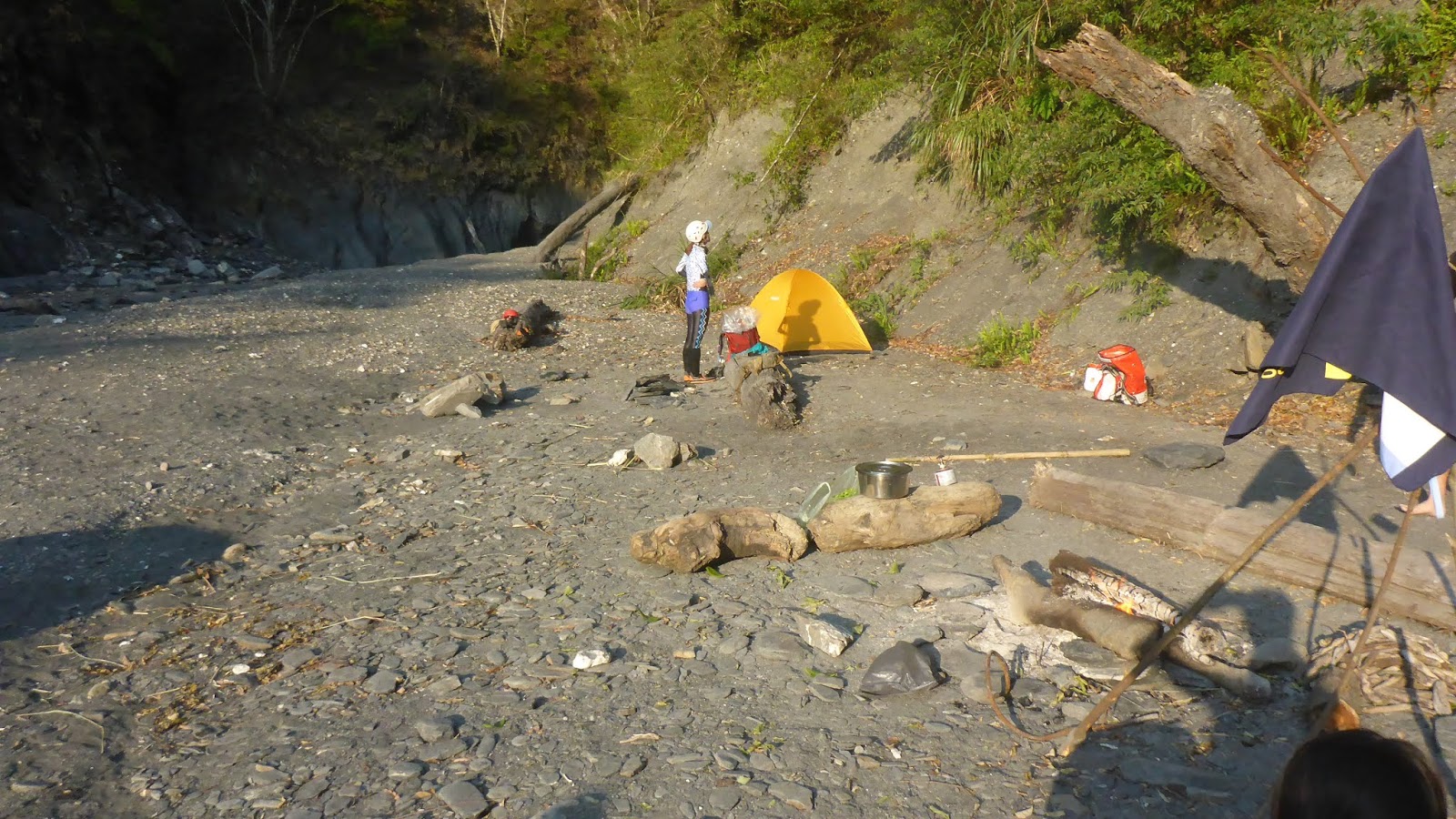 原本想在溫泉邊紮營,但發現地不怎麼平,維哥說前面沙洲有很多木頭可燒,地又平,往回走3分鐘到外頭的大沙洲紮營,有一堆材可燒,當然不能缺營火,搭好帳篷維哥就開始玩火了。