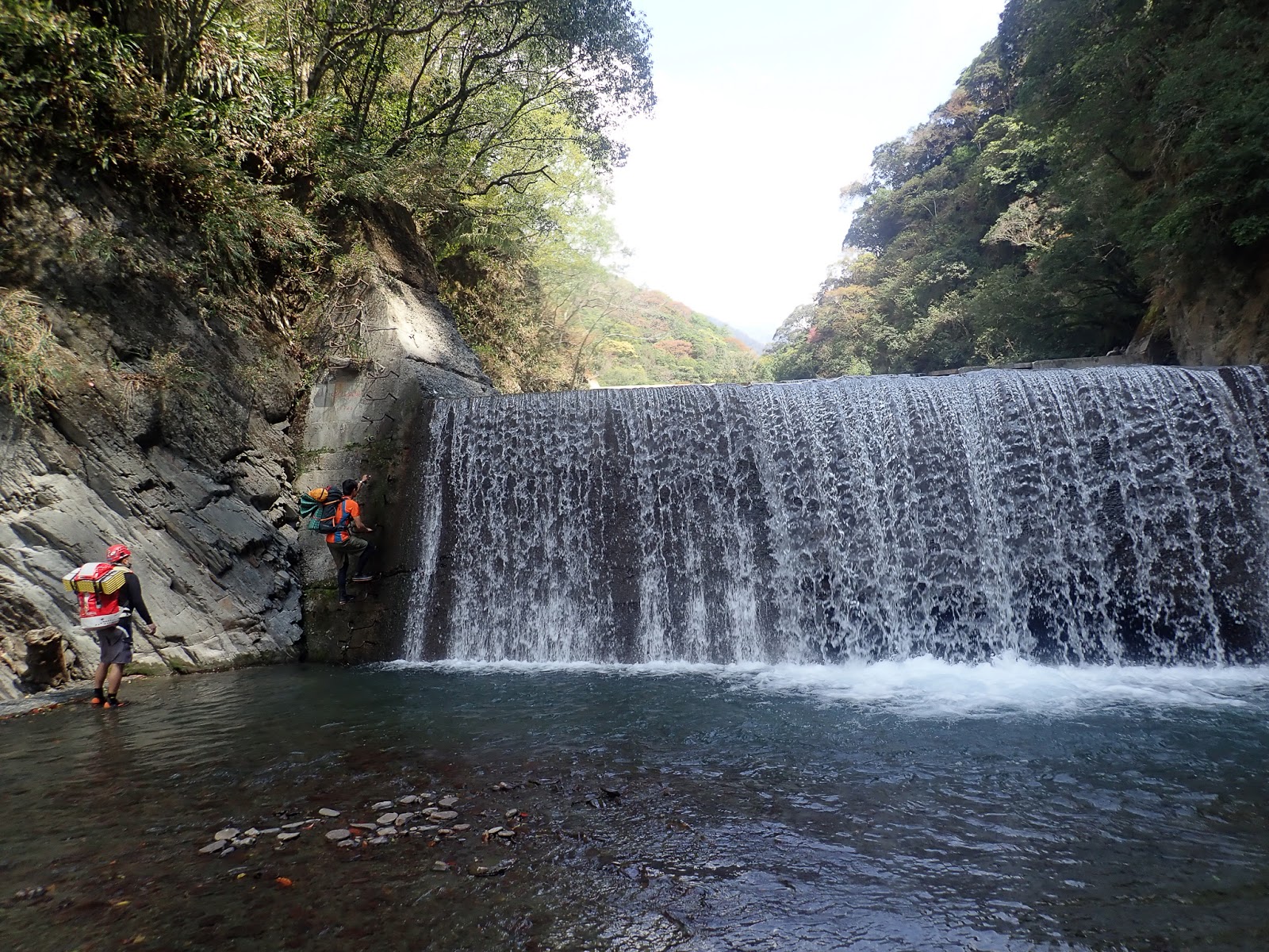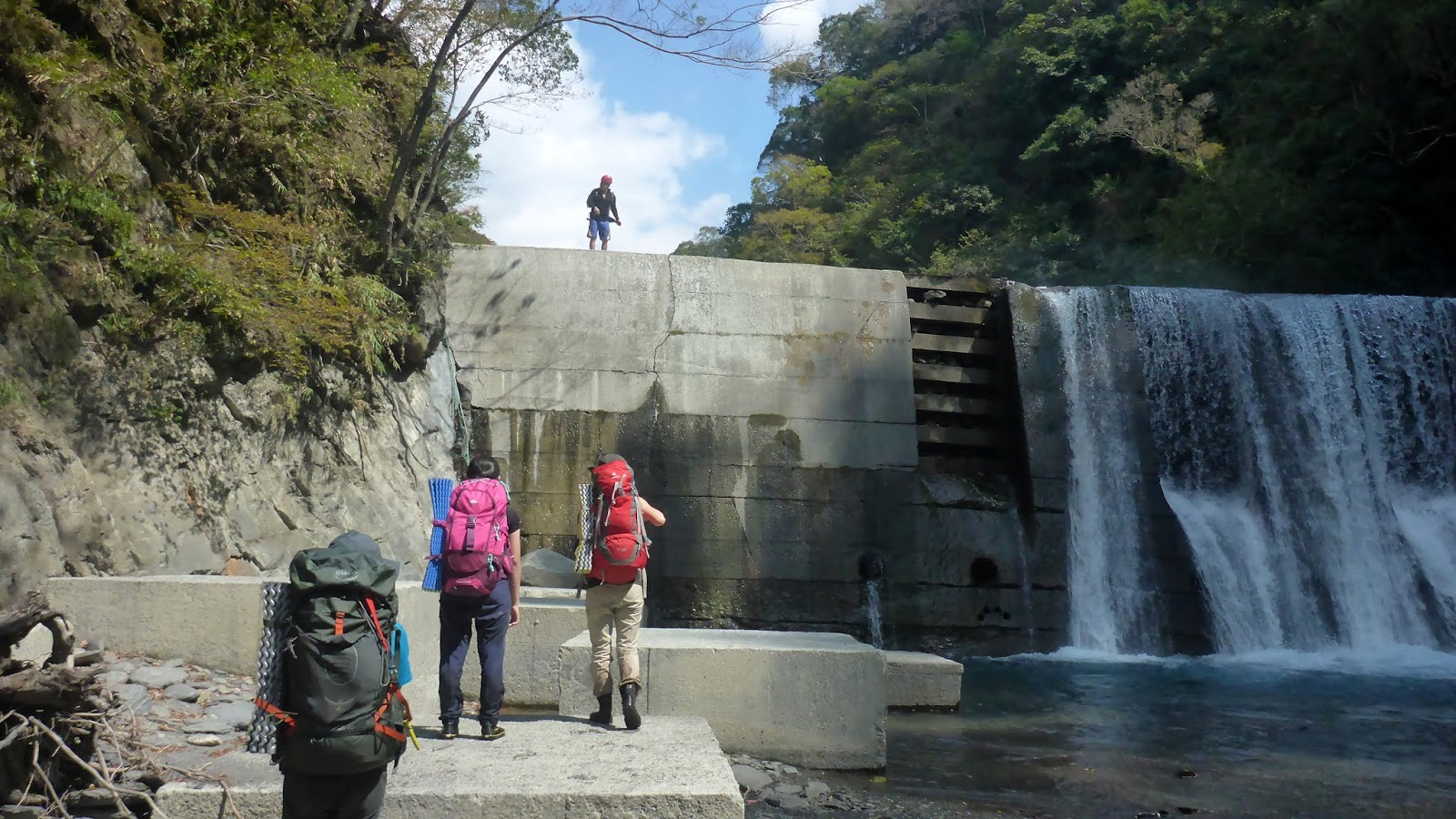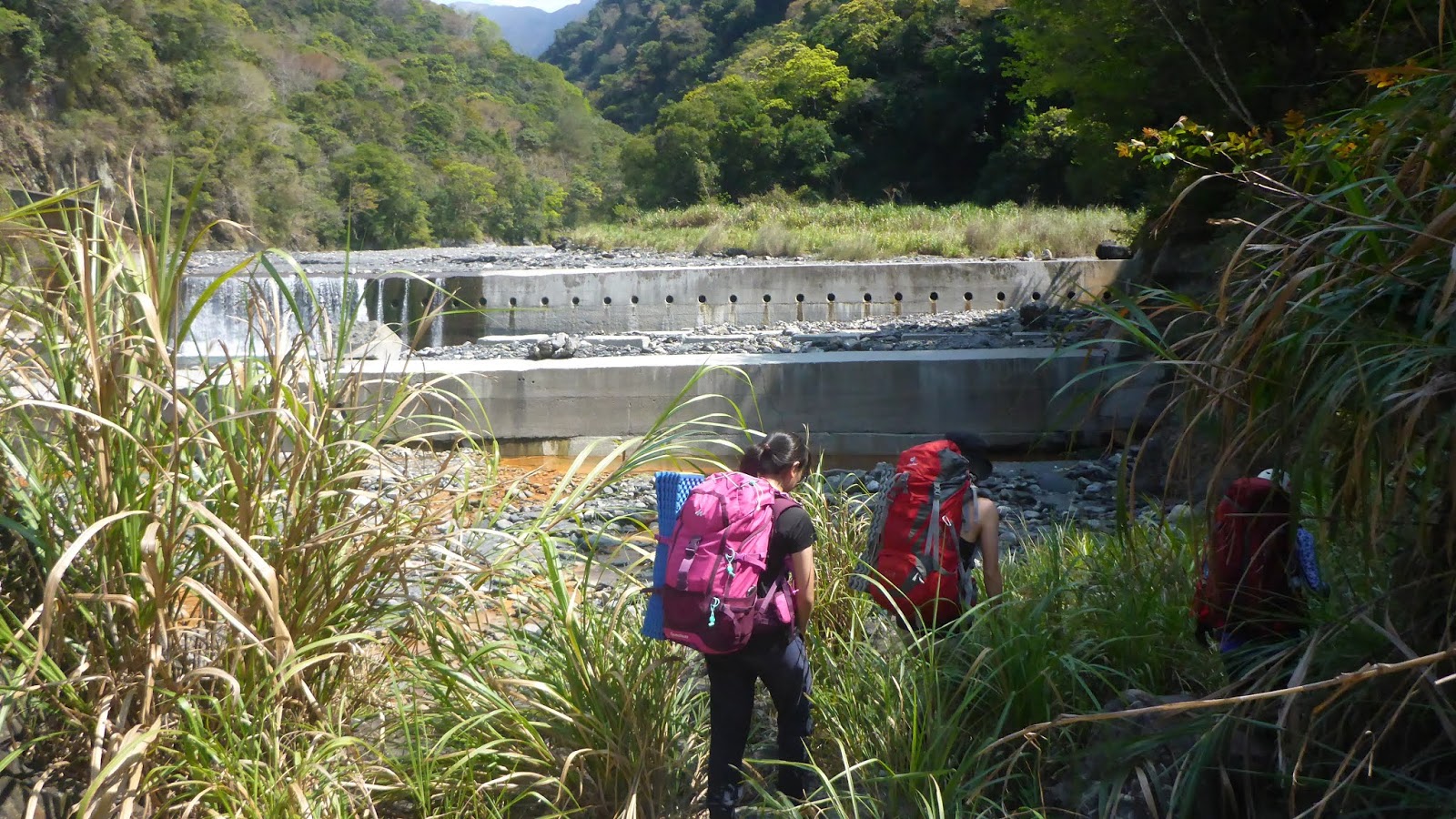 此行一共三處合計六道攔沙壩,每一座都相當有高度,第二、四、五、六道攀爬要小心,頗有難度,要過夜有大背包的人,建議帶繩把人包分離攀爬較為安全。