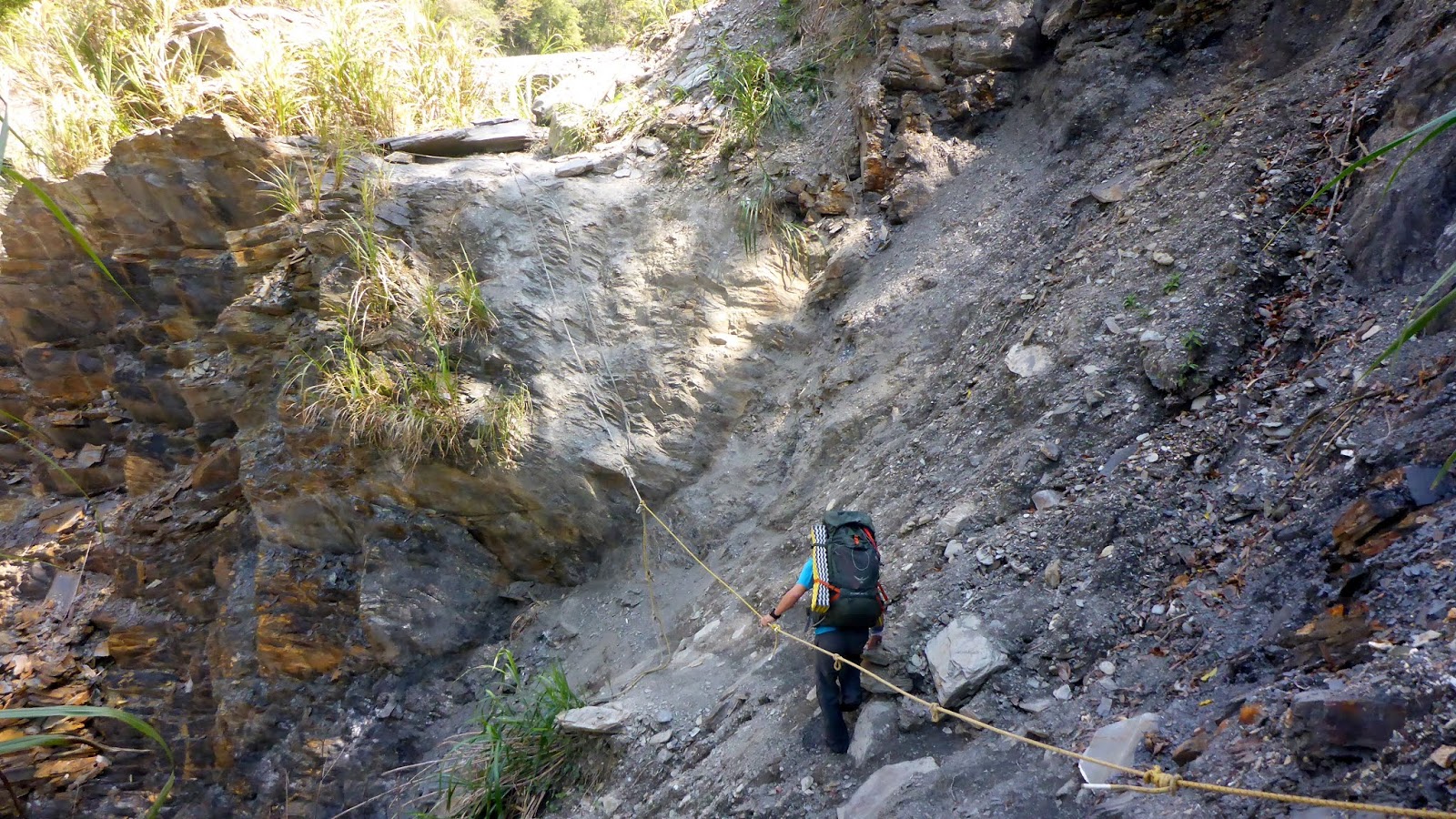 上了高繞路之後,馬上遇到一處崩塌地,這應該是近兩年內新崩塌的,雖然有綁繩,但通過還是要當心,這裡沒什麼容錯空間,失足了傷害會很大。