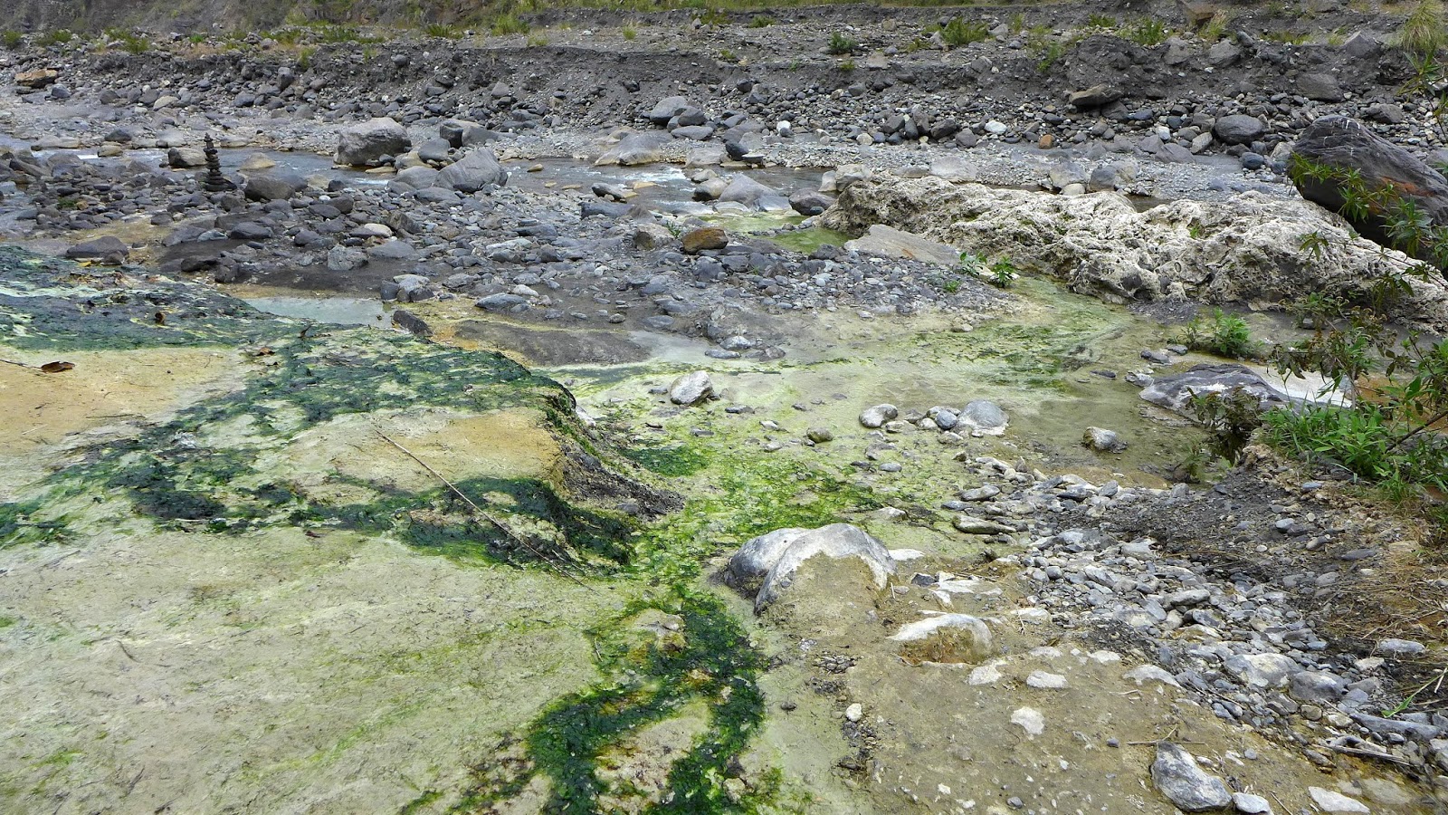 營地旁更高的溫泉露頭,下方有拉帆布築池