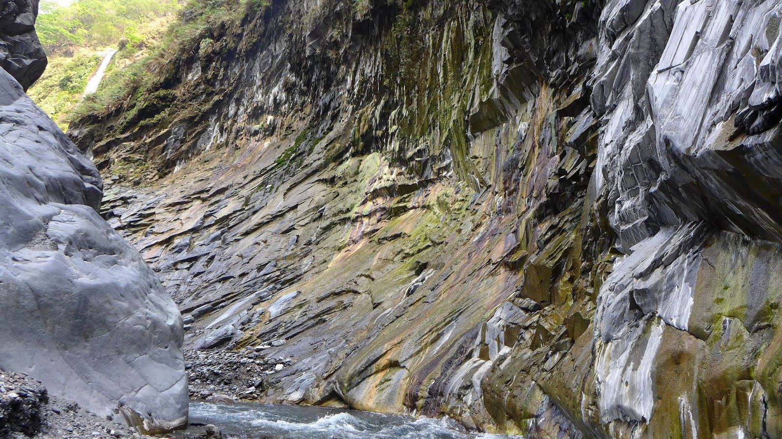 接下來到通過10米瀑的這一公里,有著峽谷絕壁、瀑布及溫泉彩壁,彩壁規模範圍非常大,還有那節理分明的單面大峭壁,真的讓人大開眼界,水流也是今日裡頭最具挑戰的,只要渡溪沒站穩就會被沖走,我眼鏡也因為在其中一次渡溪人被沖倒,獻給丹大溪了QQ。