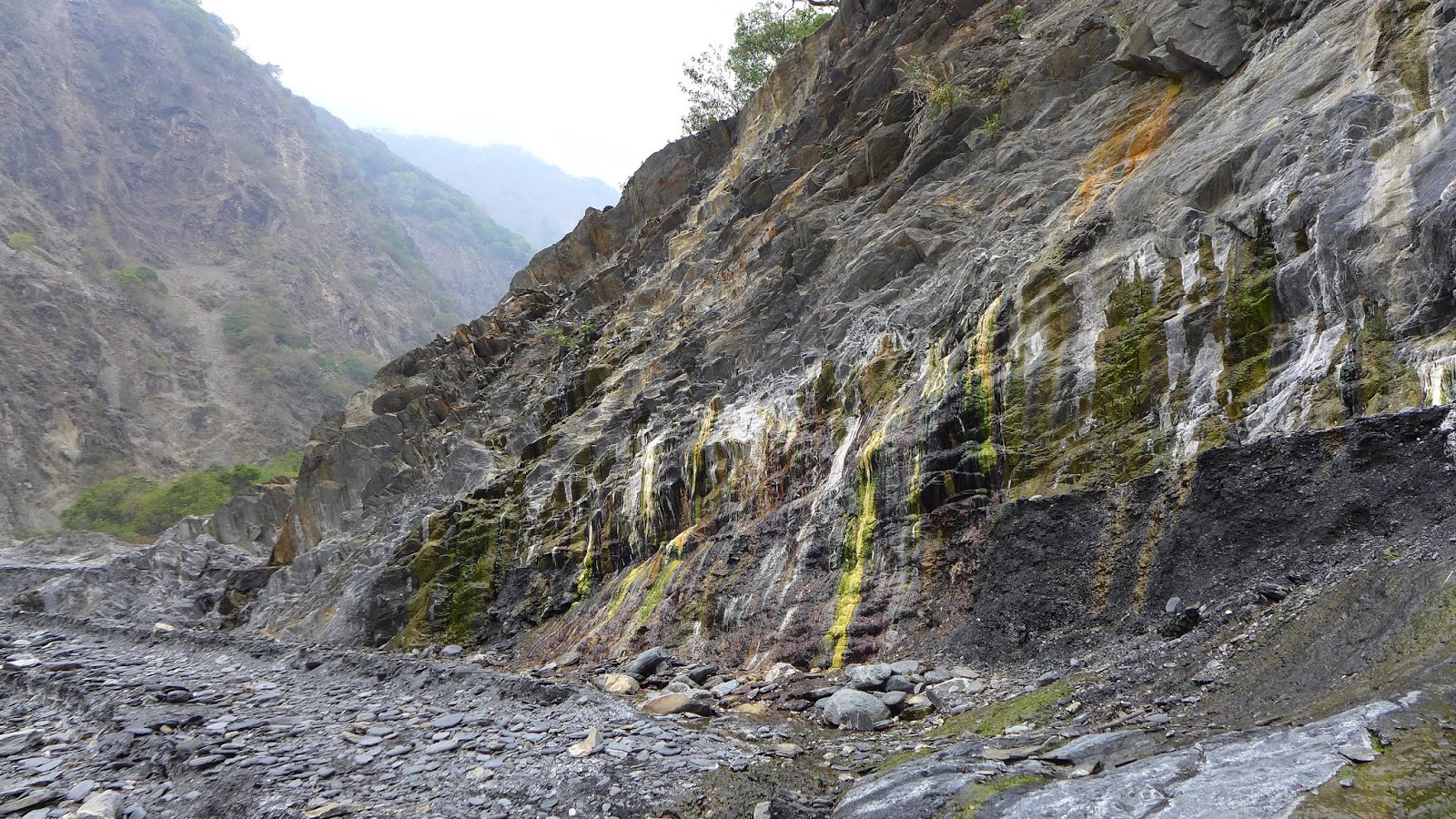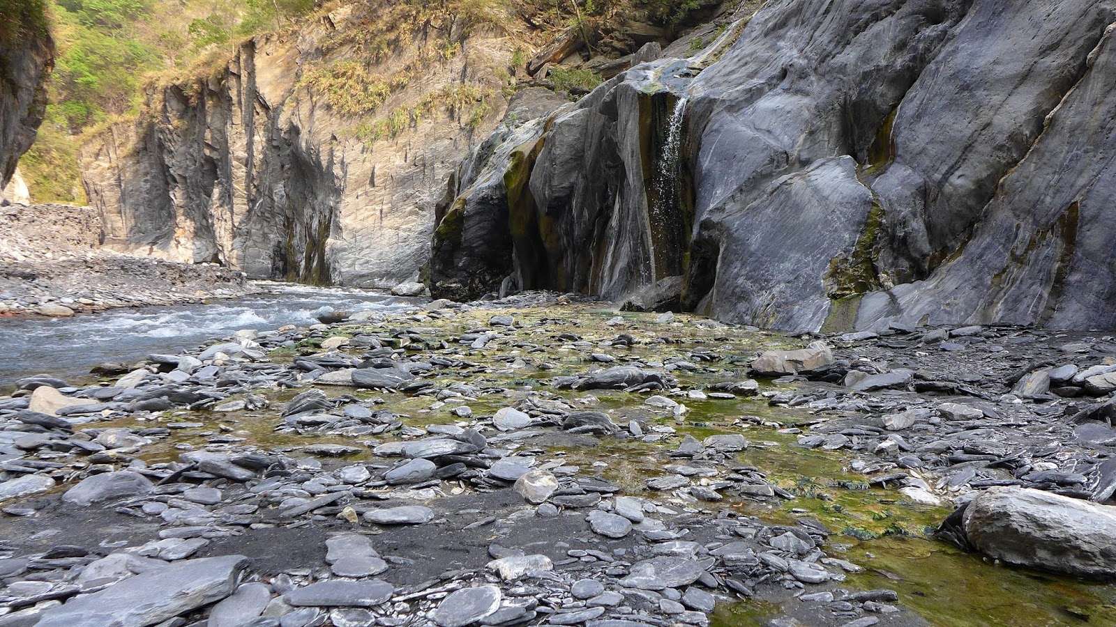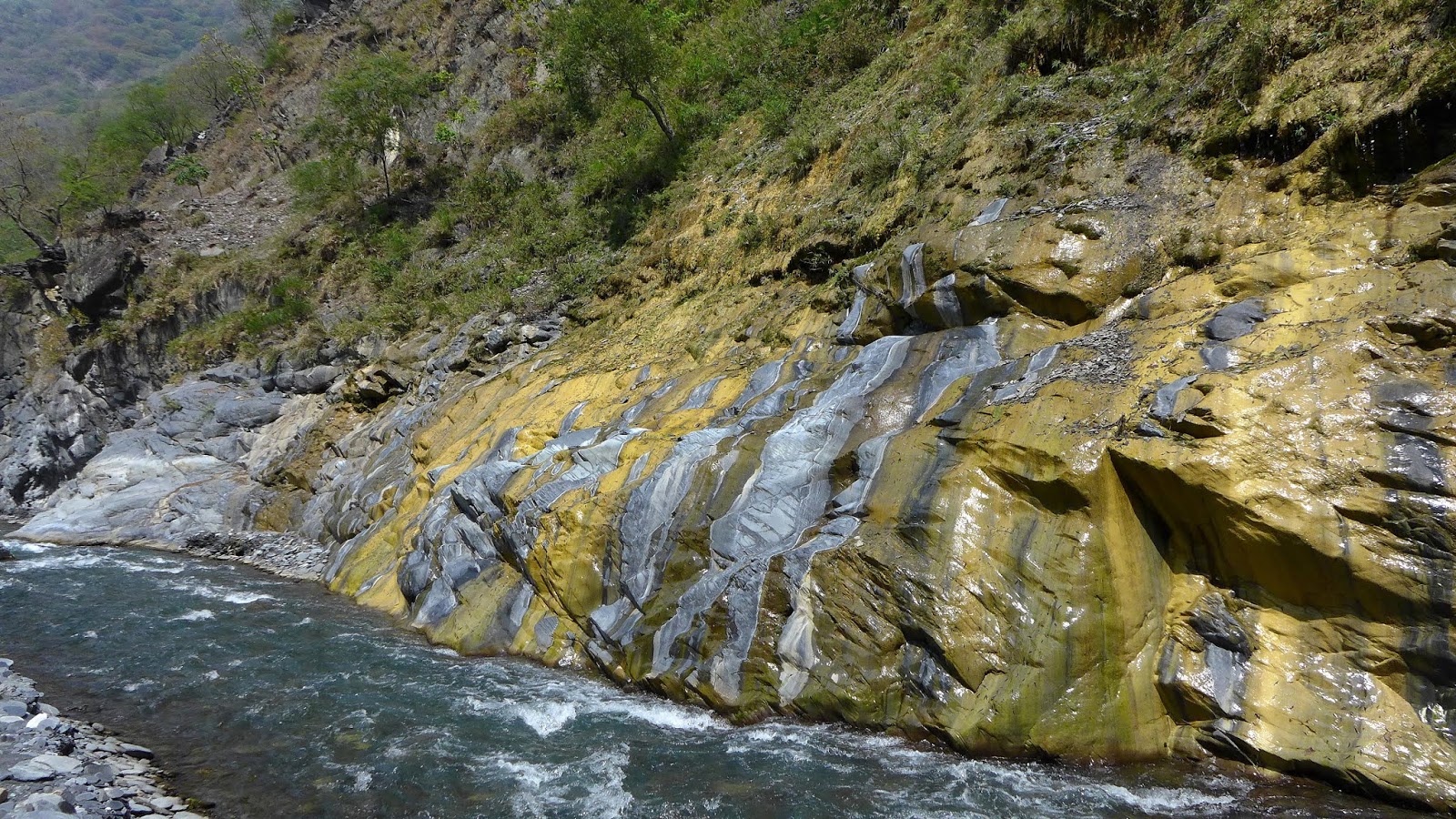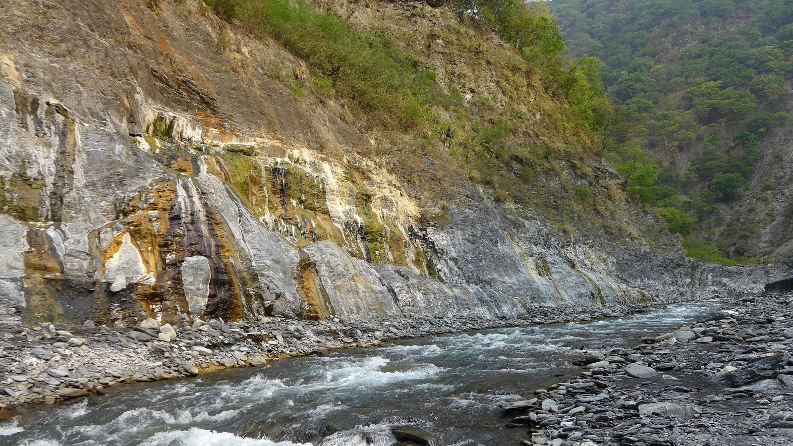 加年端溫泉主露頭位於河階之上,隨著里程越來越接近17K,開始注意山壁附近腹地,過了不久似乎看到遠方有一大片堆疊有如蛋糕般的溫泉壁,近點一看確定是了,GPS還挺準的,真的是跟記錄上一樣的17K,我們抵達囉。