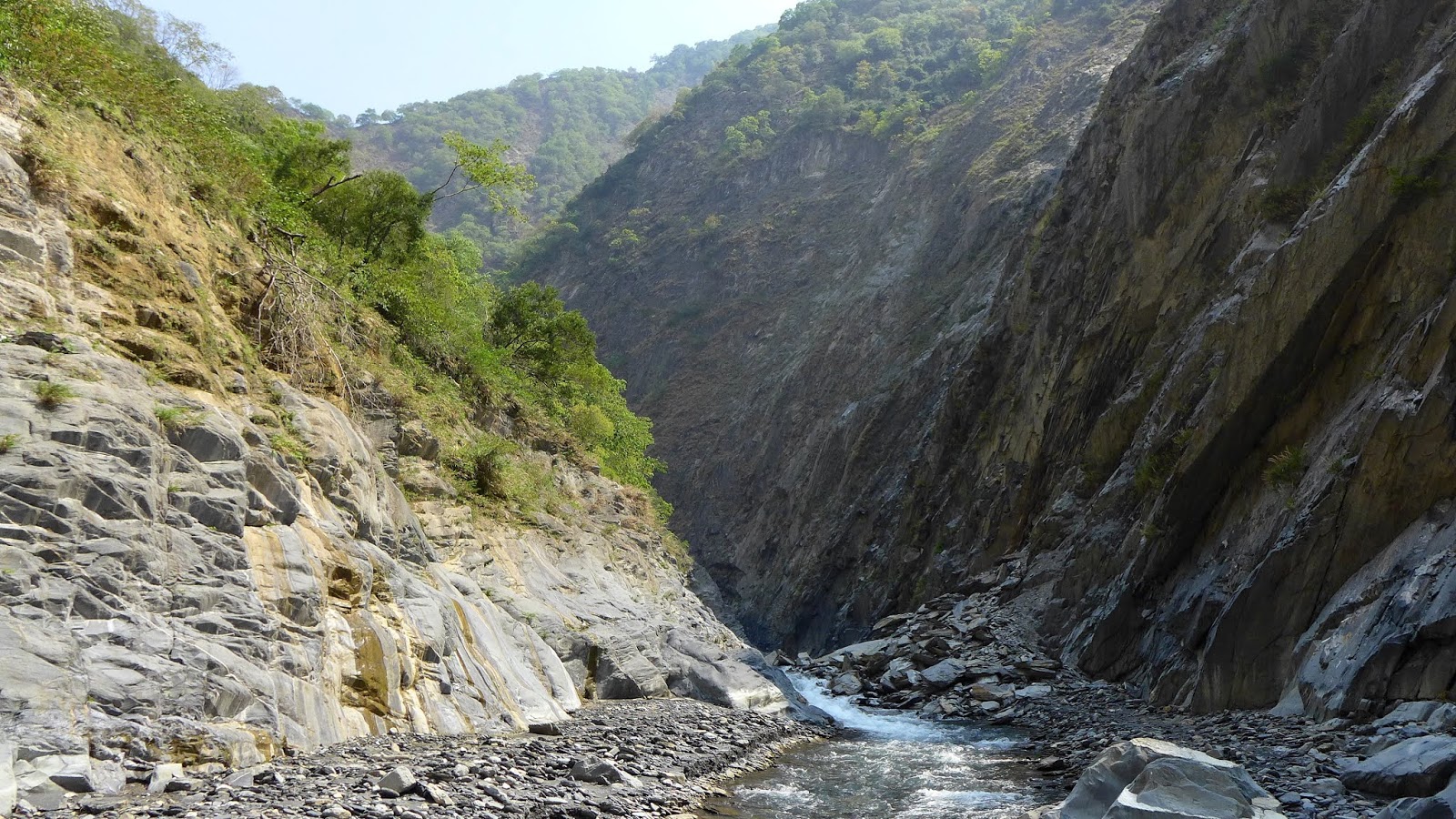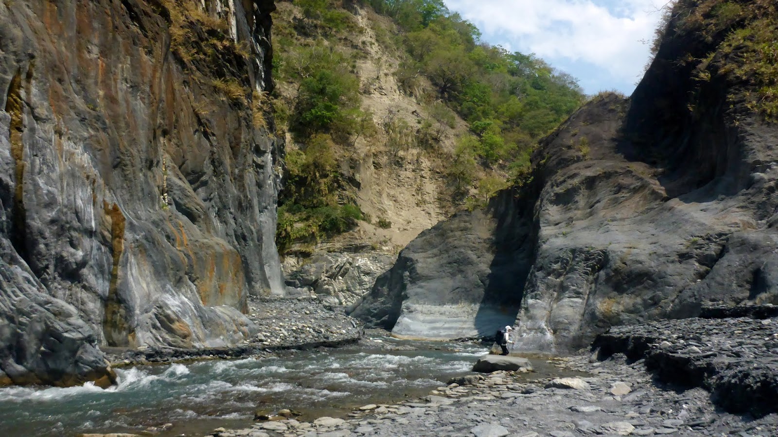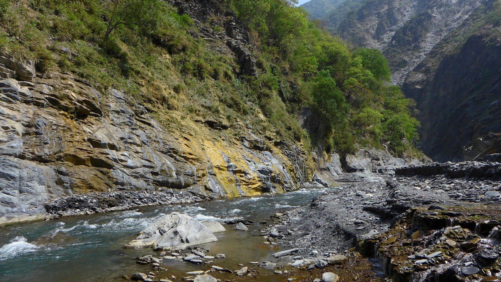加年端溫泉主露頭位於河階之上,隨著里程越來越接近17K,開始注意山壁附近腹地,過了不久似乎看到遠方有一大片堆疊有如蛋糕般的溫泉壁,近點一看確定是了,GPS還挺準的,真的是跟記錄上一樣的17K,我們抵達囉。