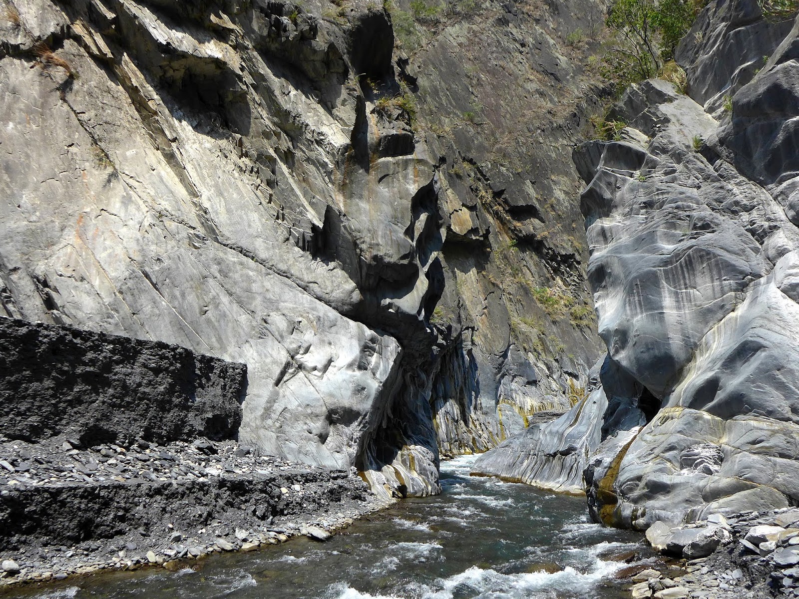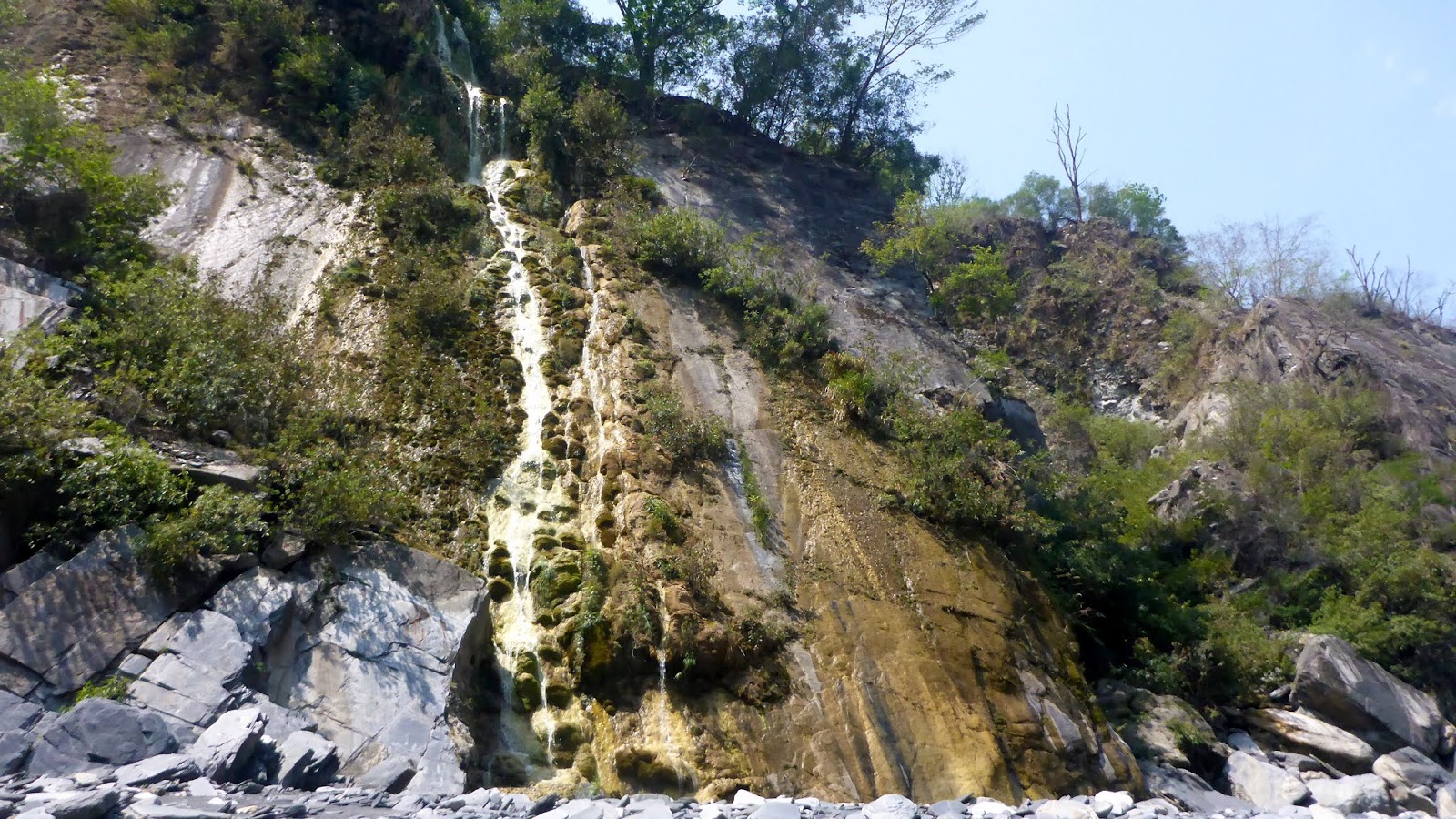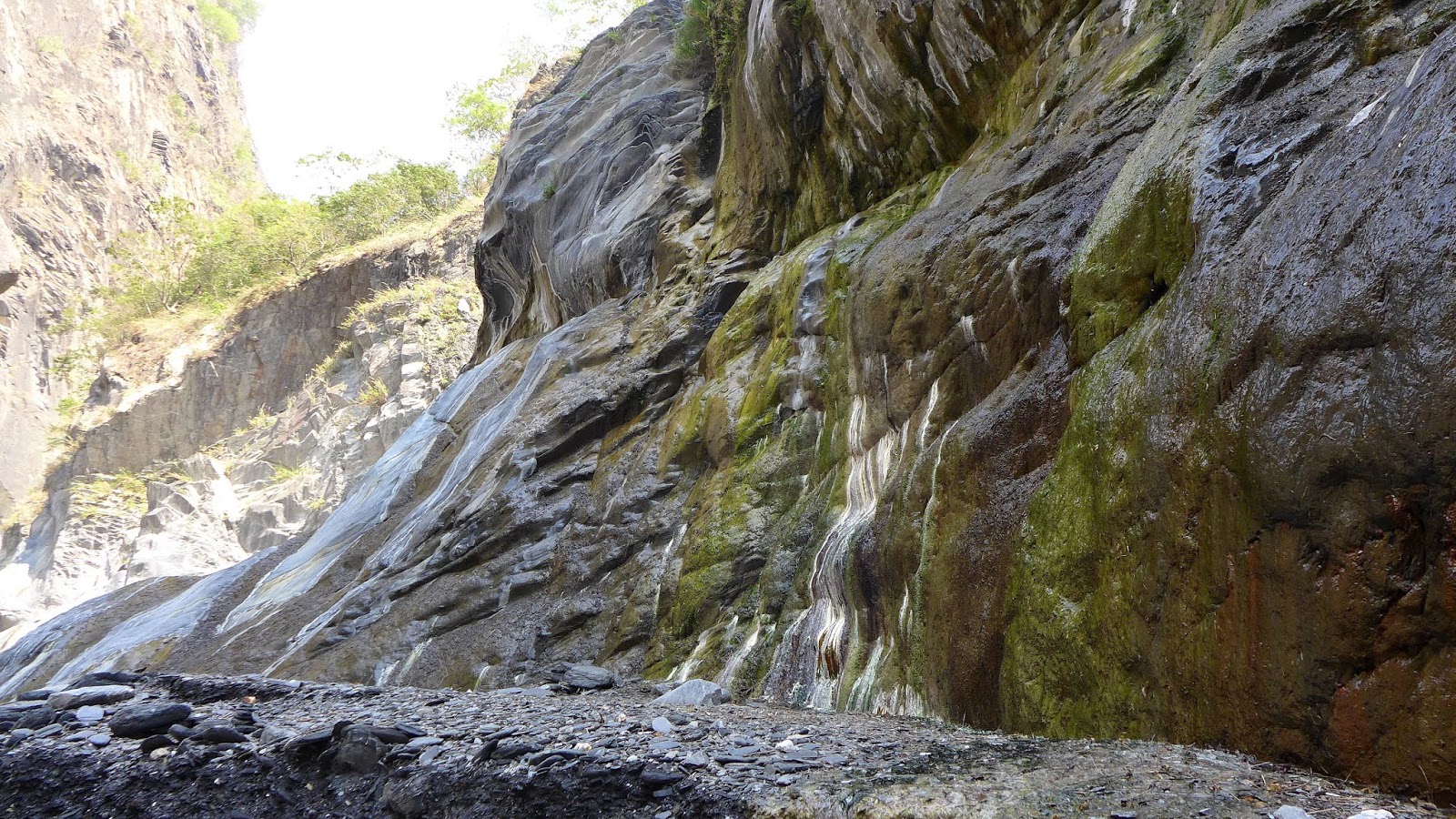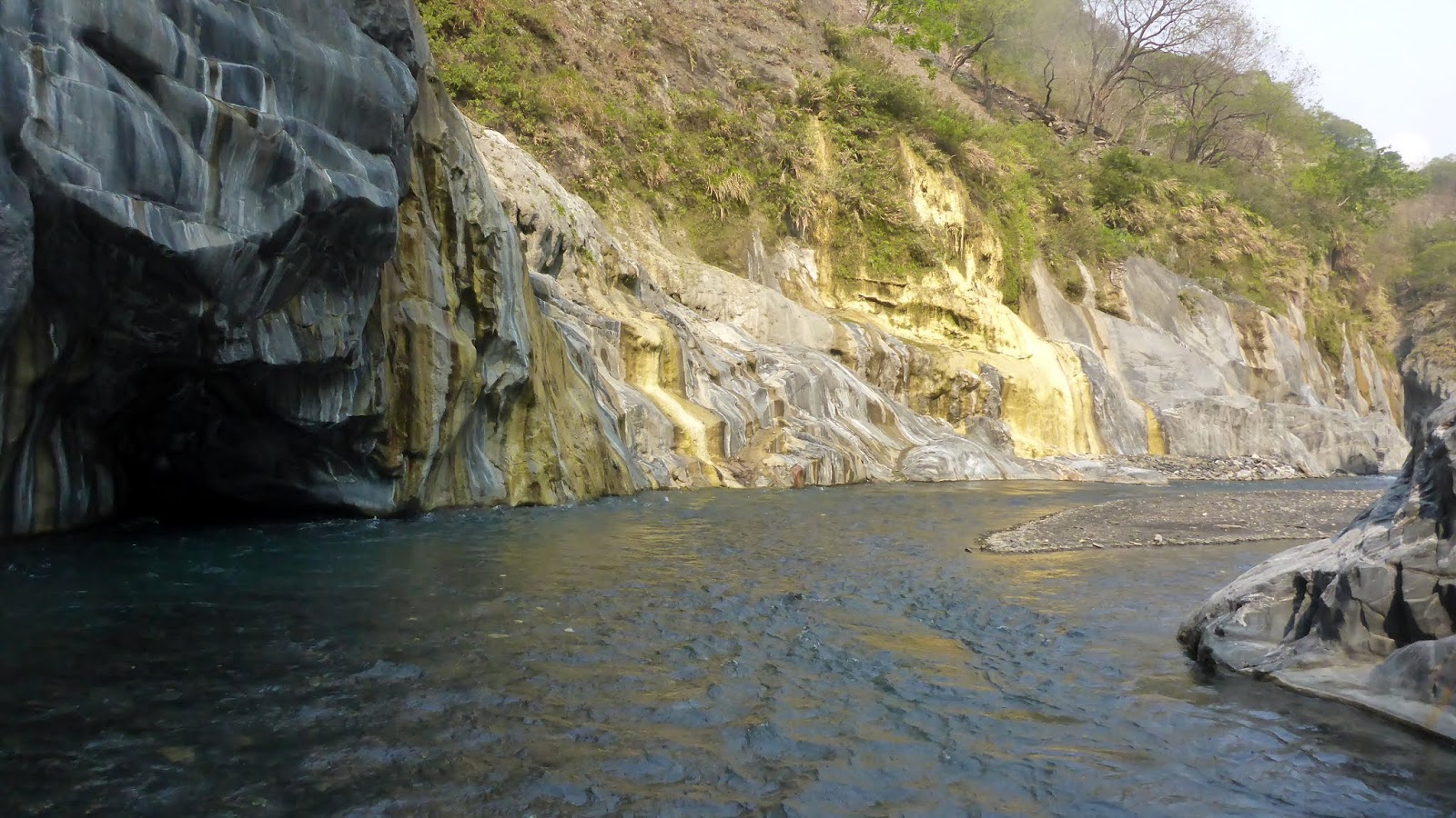 加年端溫泉主露頭位於河階之上,隨著里程越來越接近17K,開始注意山壁附近腹地,過了不久似乎看到遠方有一大片堆疊有如蛋糕般的溫泉壁,近點一看確定是了,GPS還挺準的,真的是跟記錄上一樣的17K,我們抵達囉。