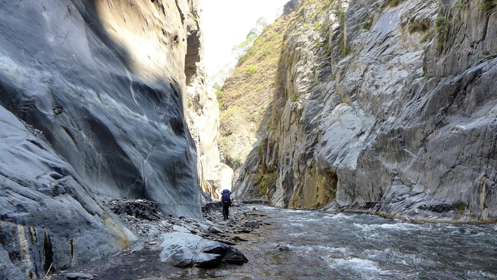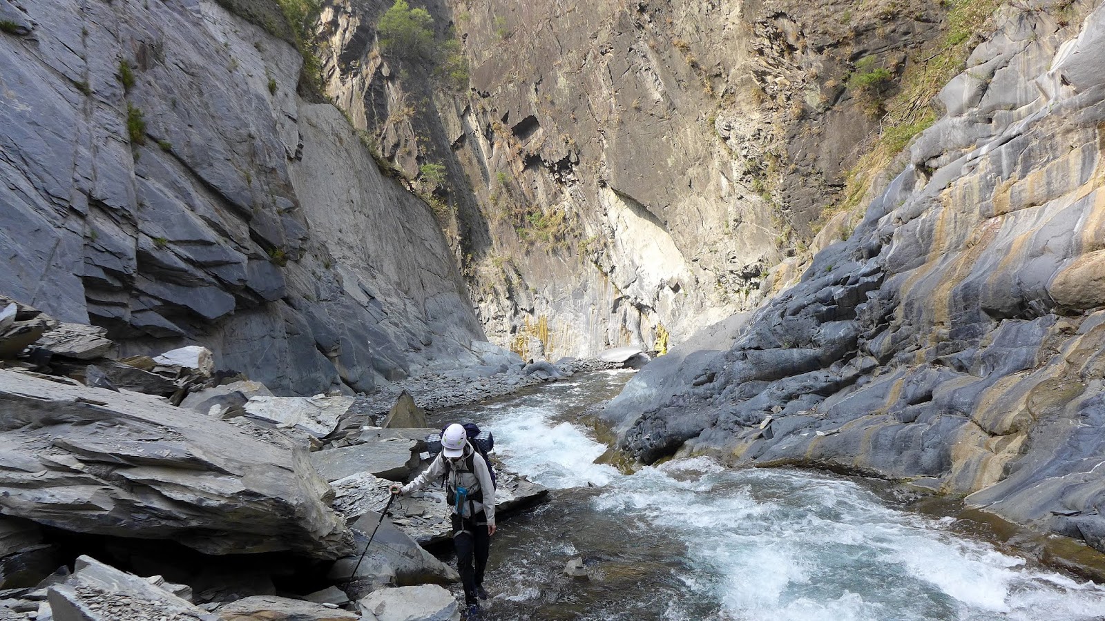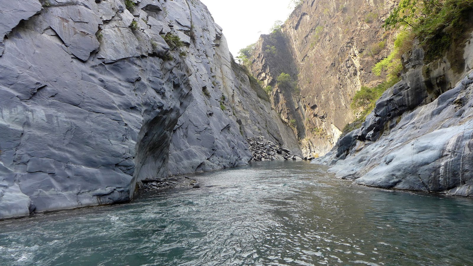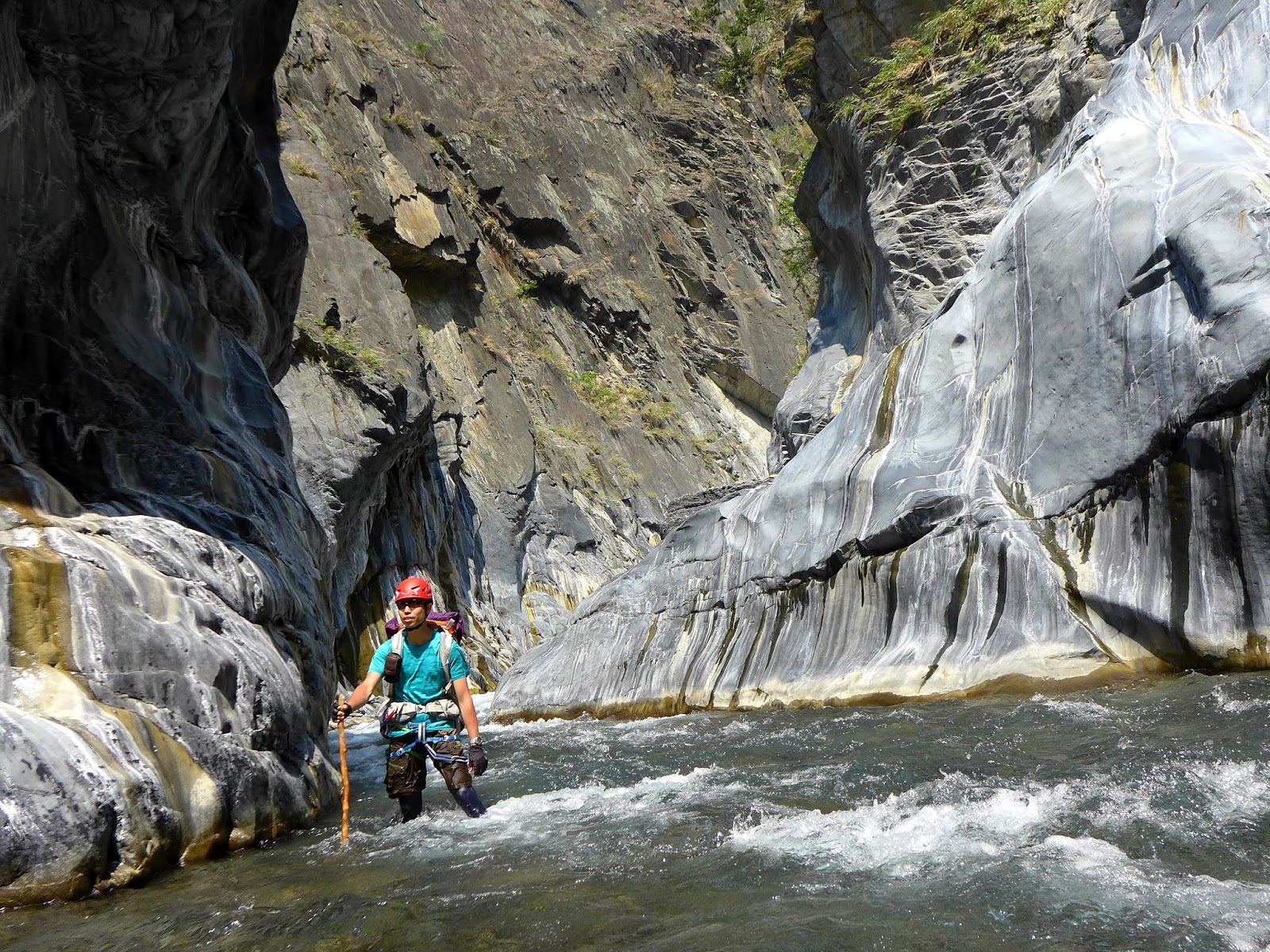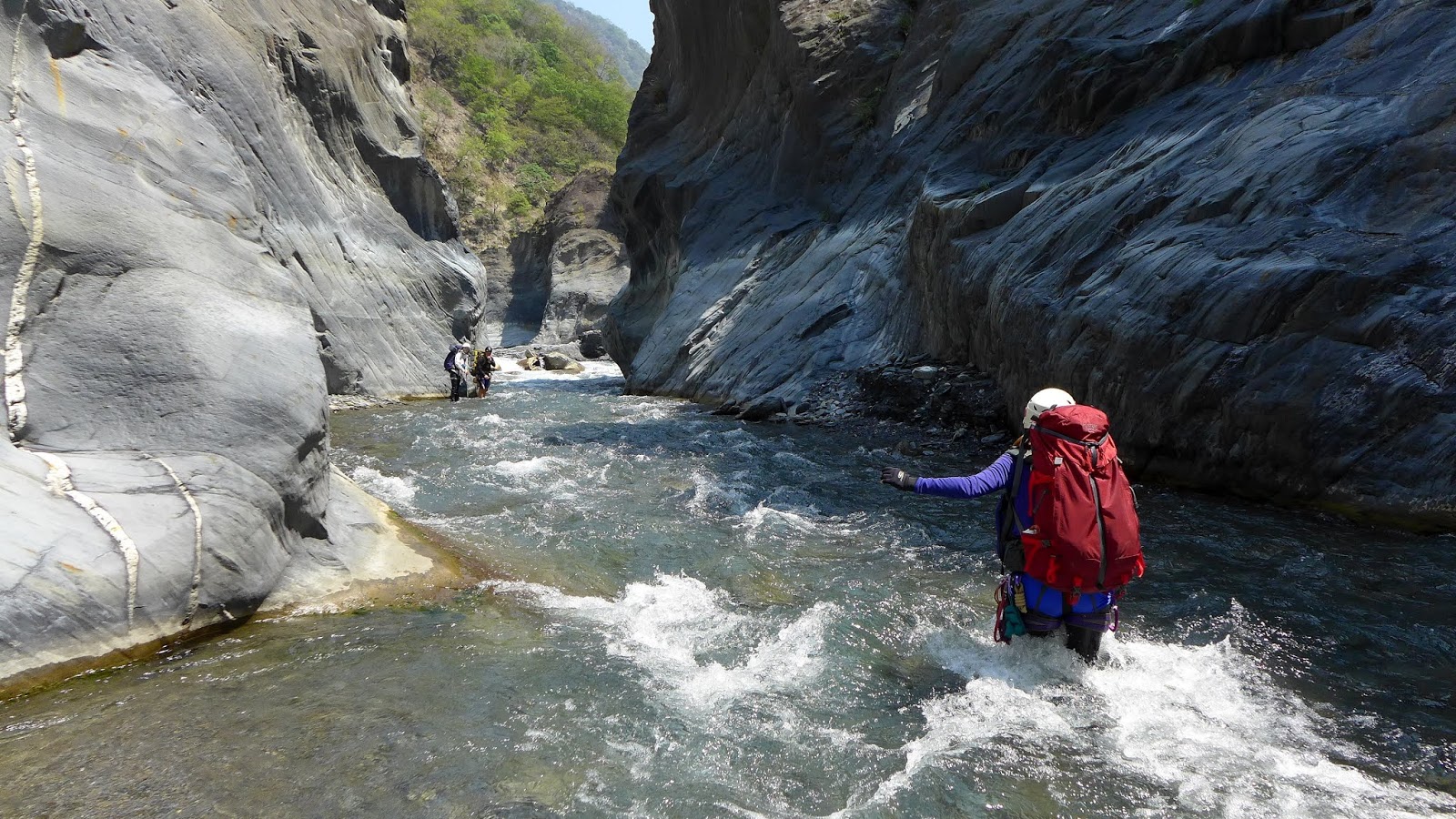 通過剛那片彩壁再走一段距離,是今天第一道真正的峽谷窄河道,無法高繞必須直接水路行進,但這邊還算好走,不難通過。