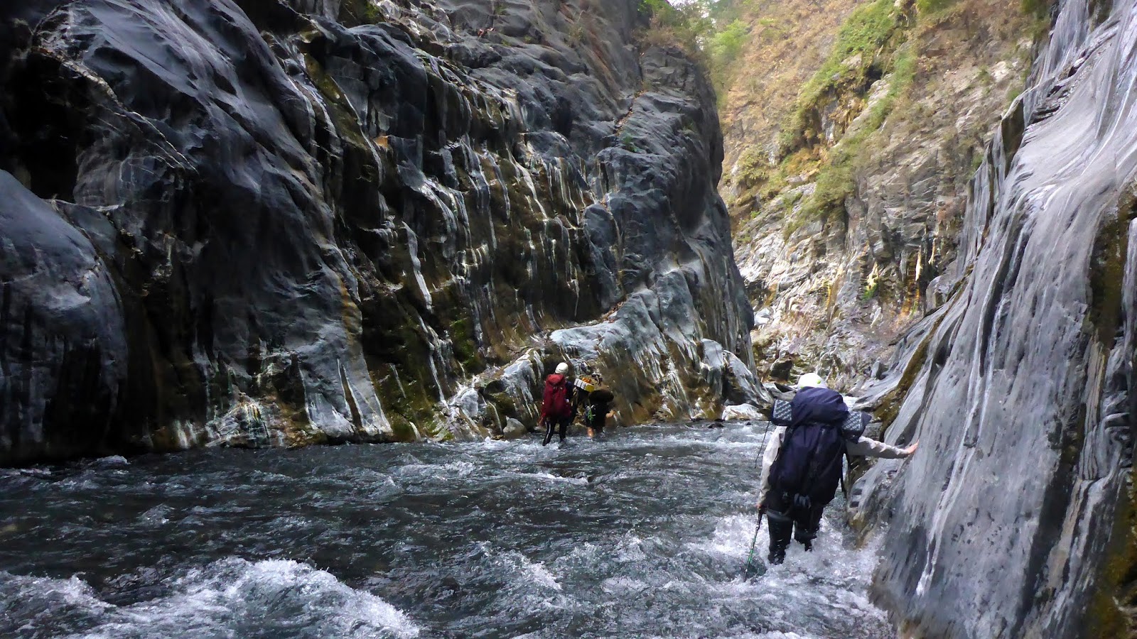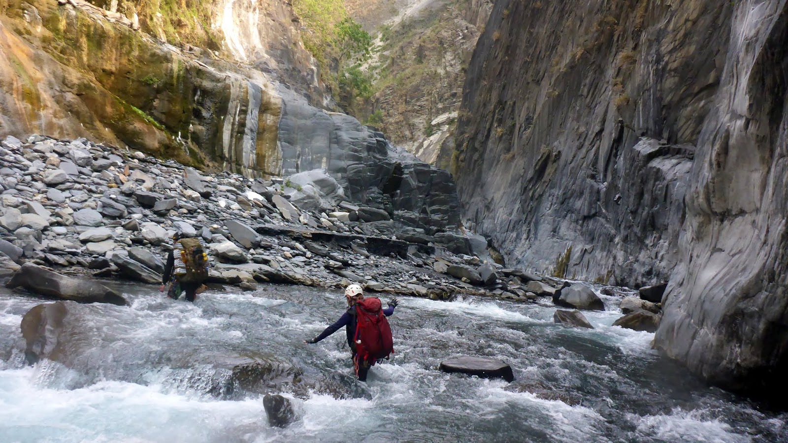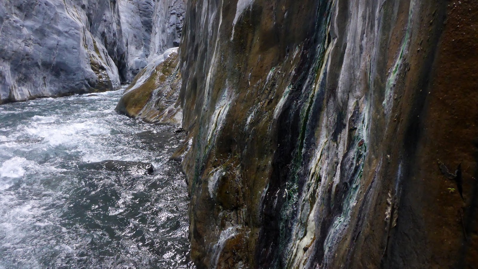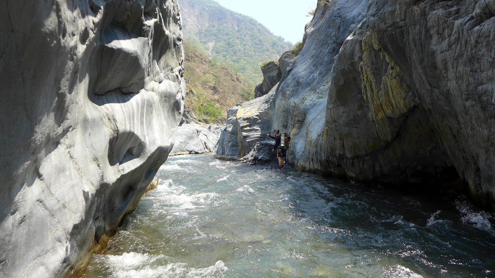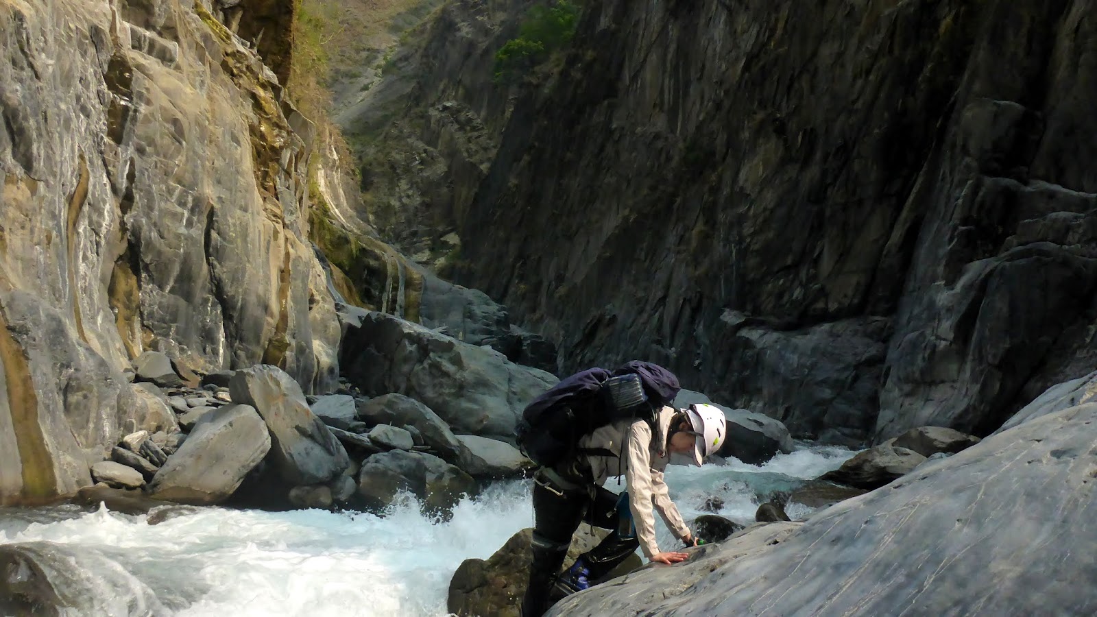 通過剛那片彩壁再走一段距離,是今天第一道真正的峽谷窄河道,無法高繞必須直接水路行進,但這邊還算好走,不難通過。