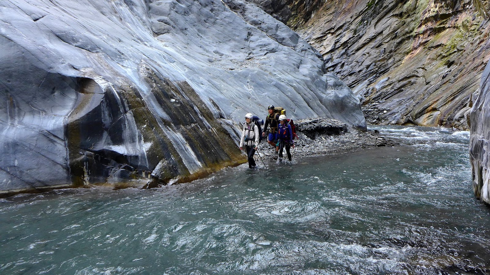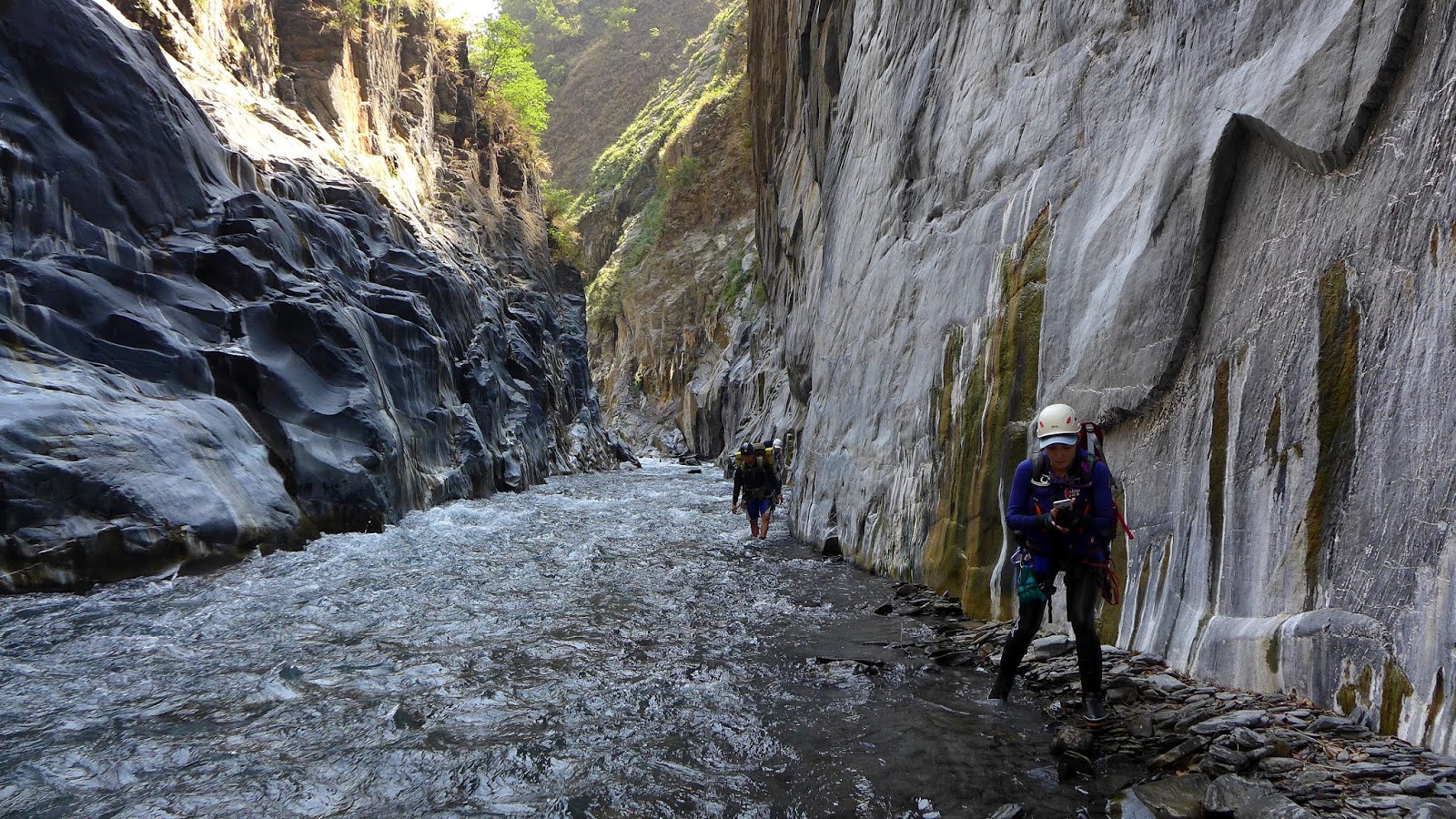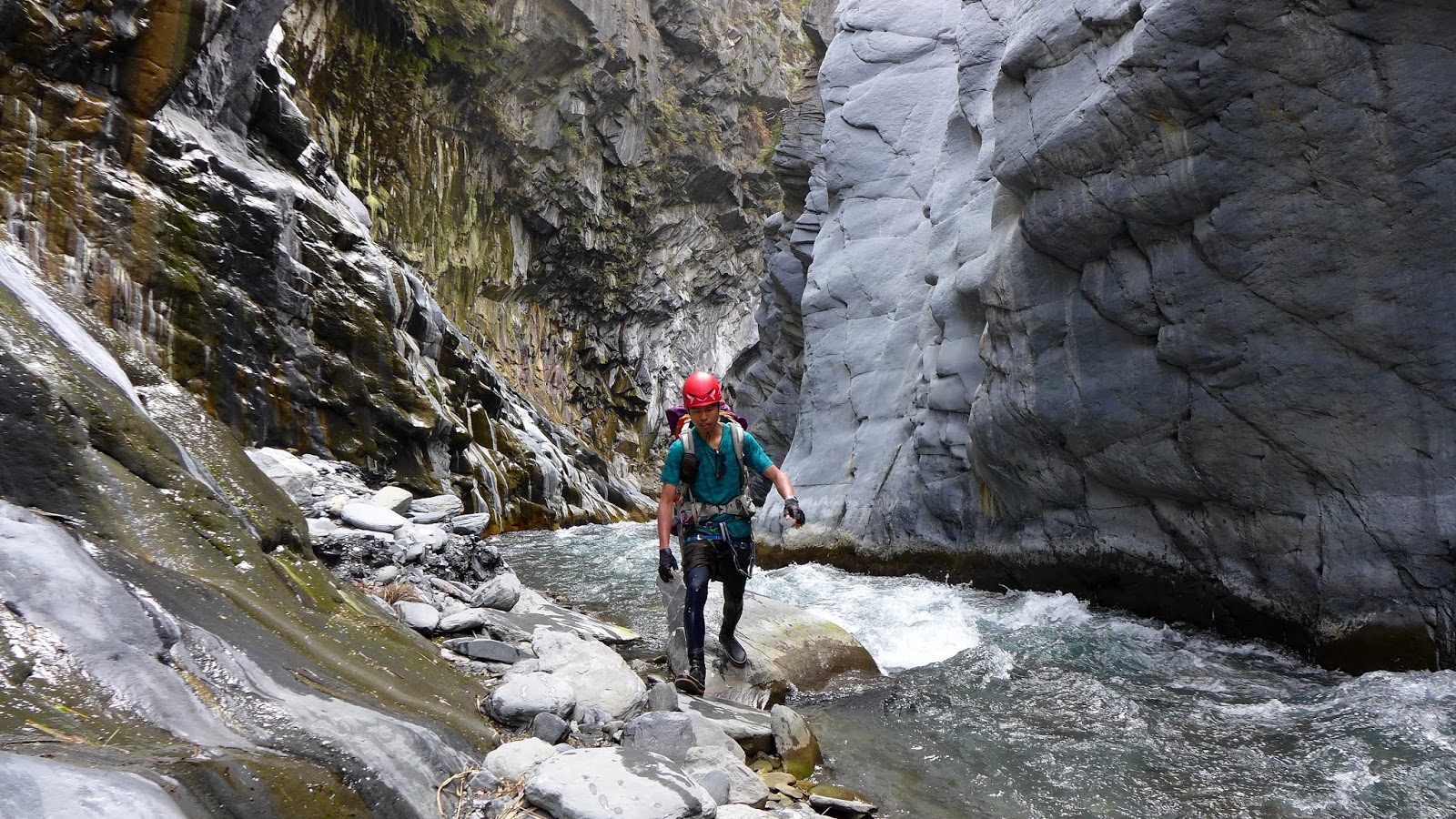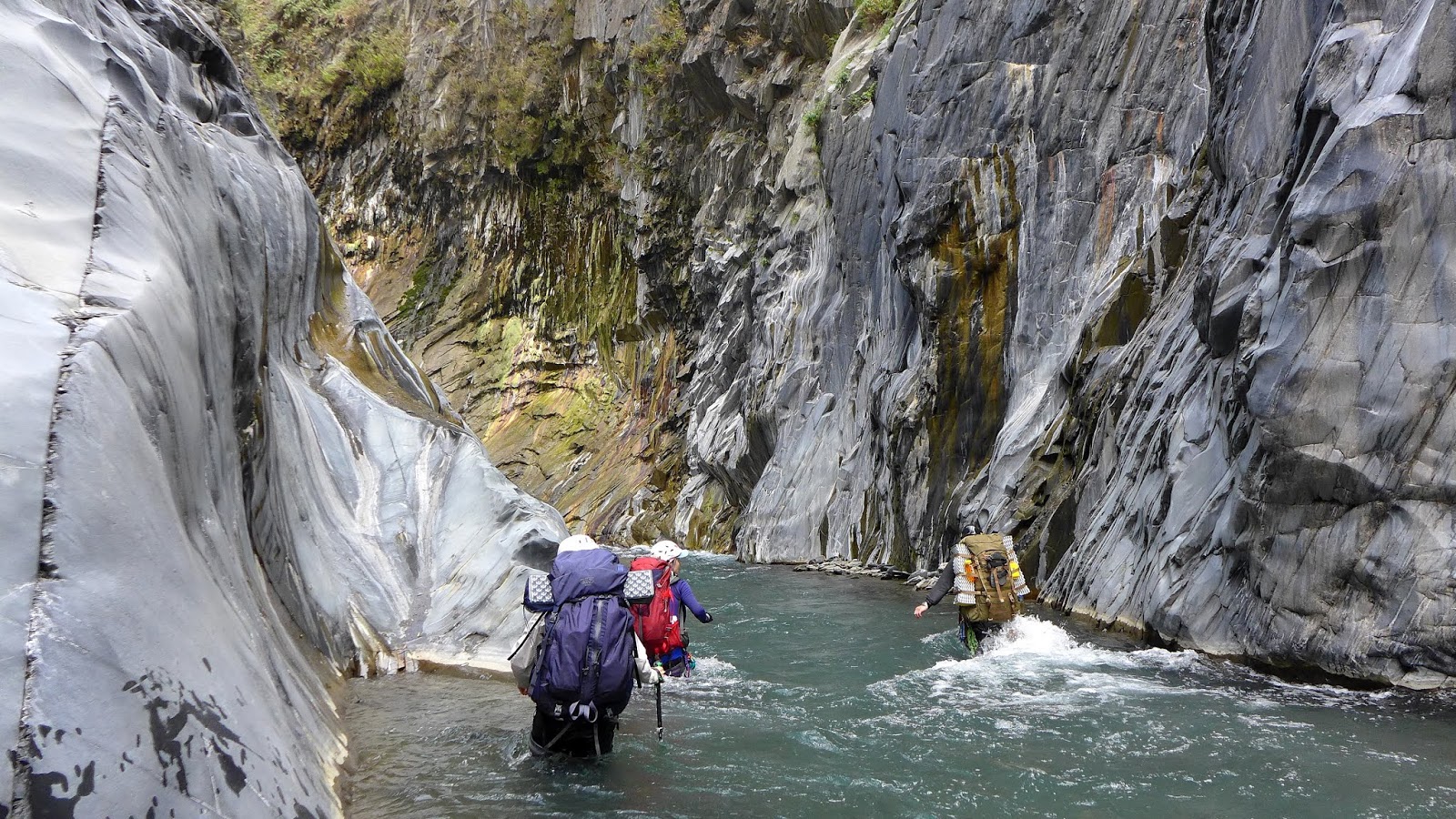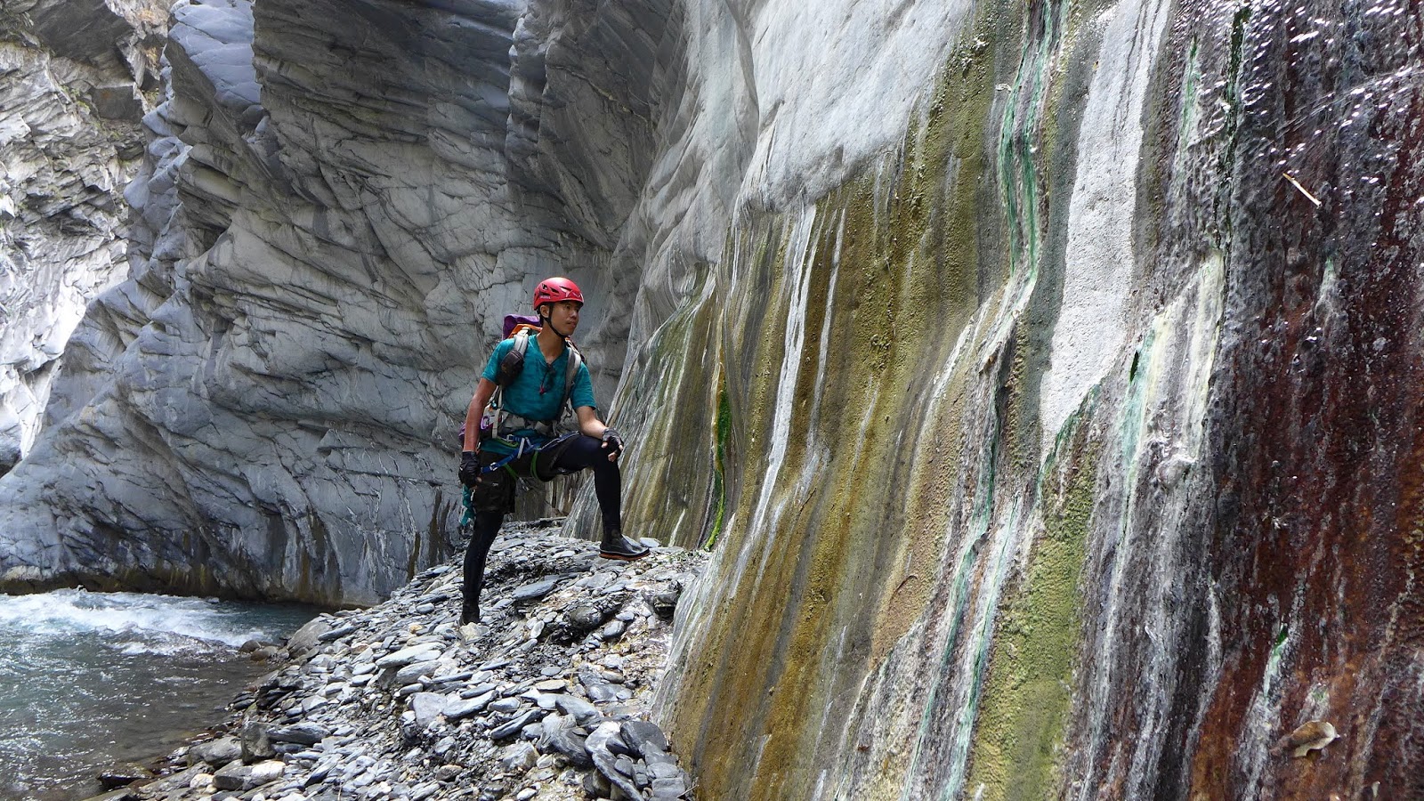 通過剛那片彩壁再走一段距離,是今天第一道真正的峽谷窄河道,無法高繞必須直接水路行進,但這邊還算好走,不難通過。