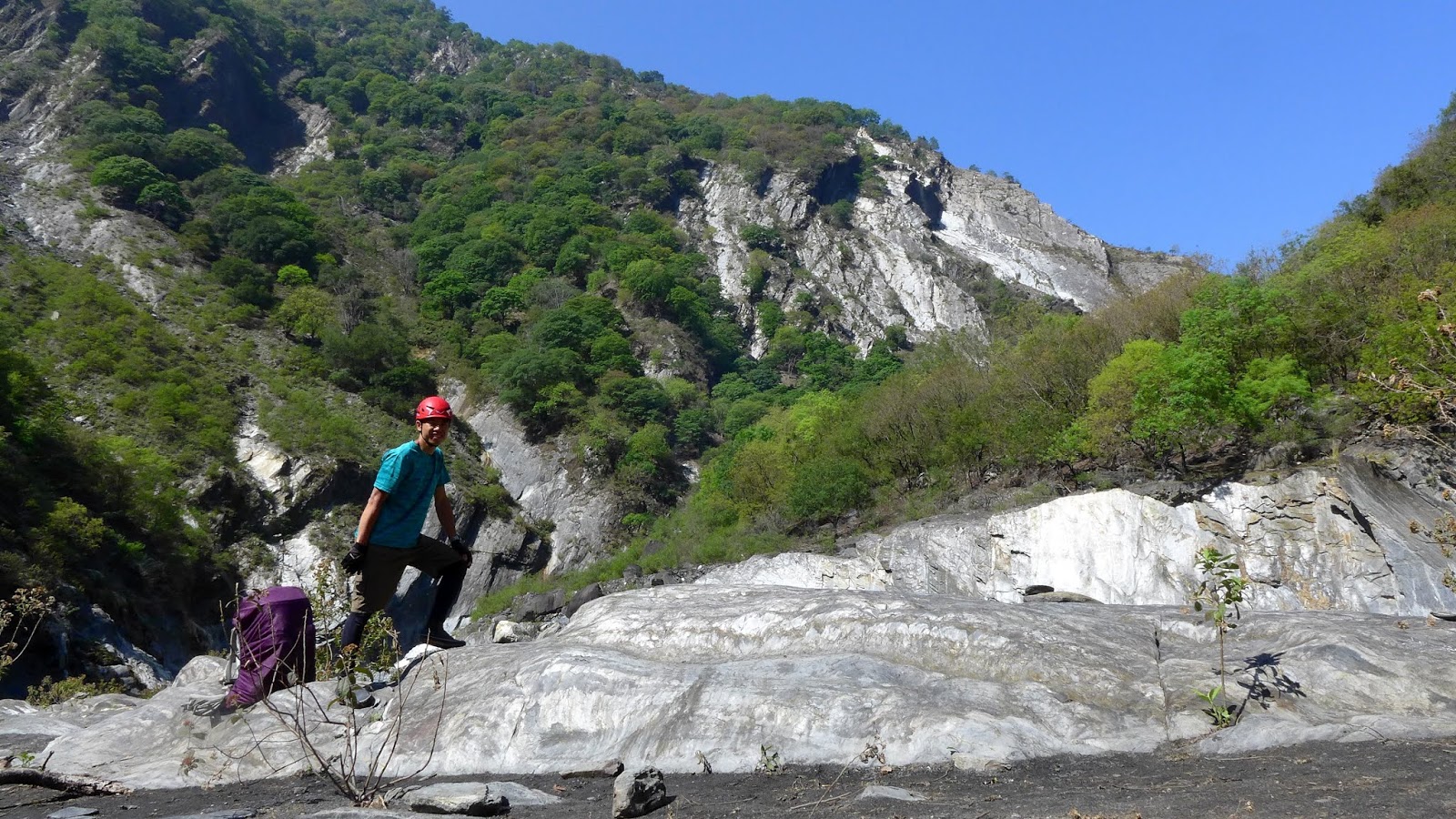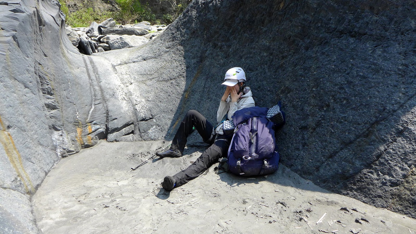 抵達10米瀑前找到一處地方休息,通過10米瀑後今天的關卡就告一段落了,10米瀑是因崩塌形成的,雖然有人留下扁帶,不過仔細探索一下,手腳點蠻明確的,就算不用繩也不難爬,經歷前面的峽谷,反而覺得這道10米瀑沒有特別困難。