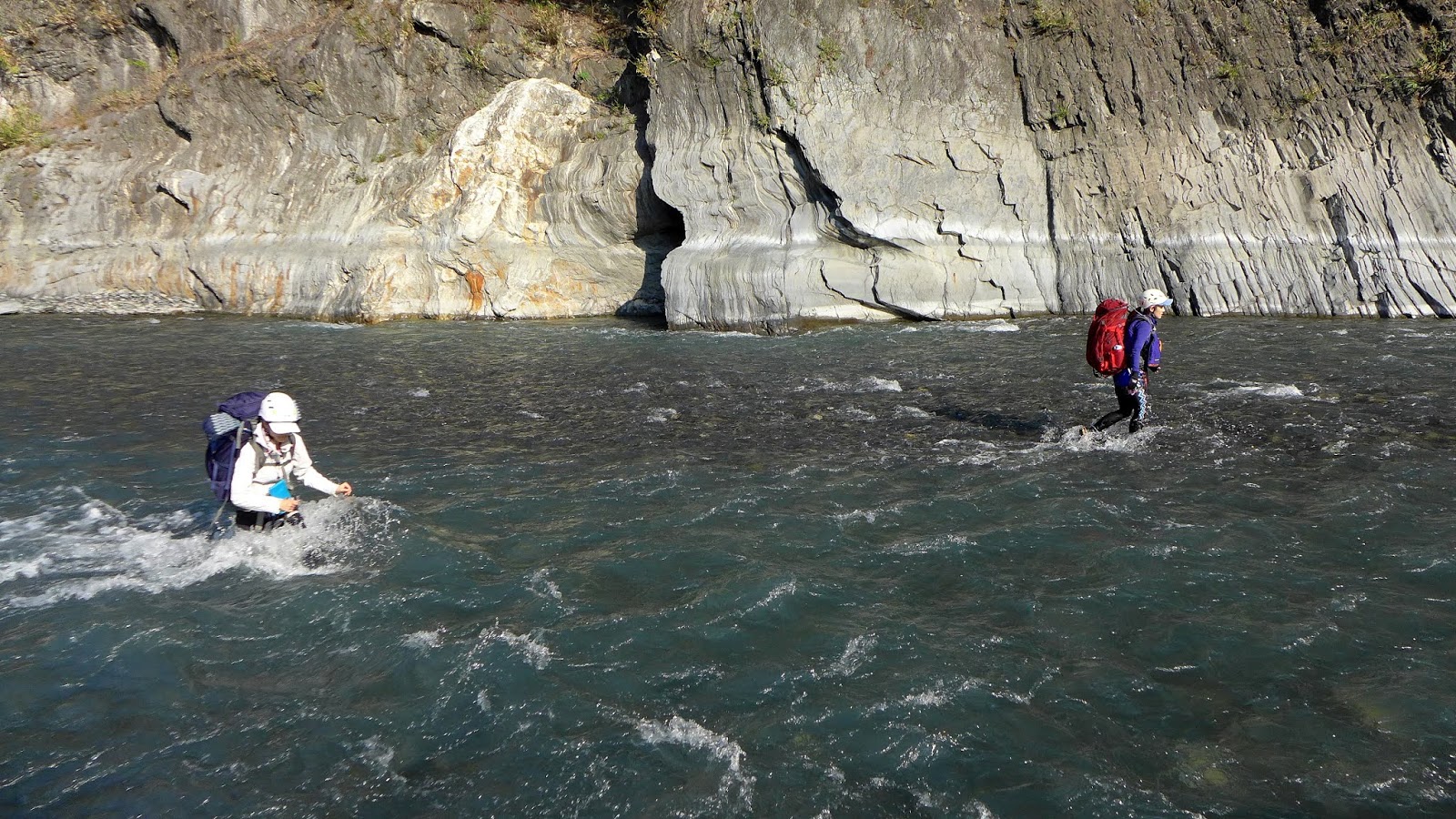 剛開始渡丹大溪,真覺得不得了,雖然過溪不成問題,但水位有些地方還是達到大腿高度,而且流速依然不慢,這都已經是大家口中說的難得超乾旱季狀態了呀,只要稍有不慎或選錯過溪點,一旦被沖倒,身上的大背包不但會讓人站不起來,更會連包帶人直接被水流漂走。