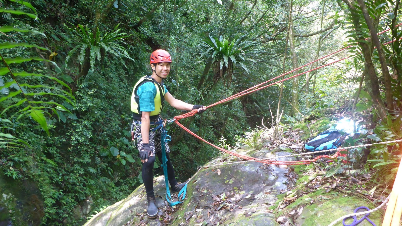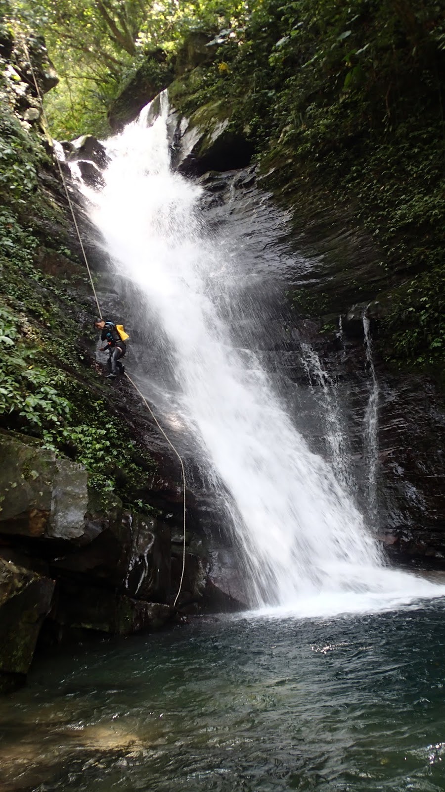 實際當然不會這麼歡樂,因為根本看不到下面狀況,加上滑瀑附近的地面實在有夠滑,架好繩子自己先下去看看,看好垂降路線,後面再依序一位接一位下。