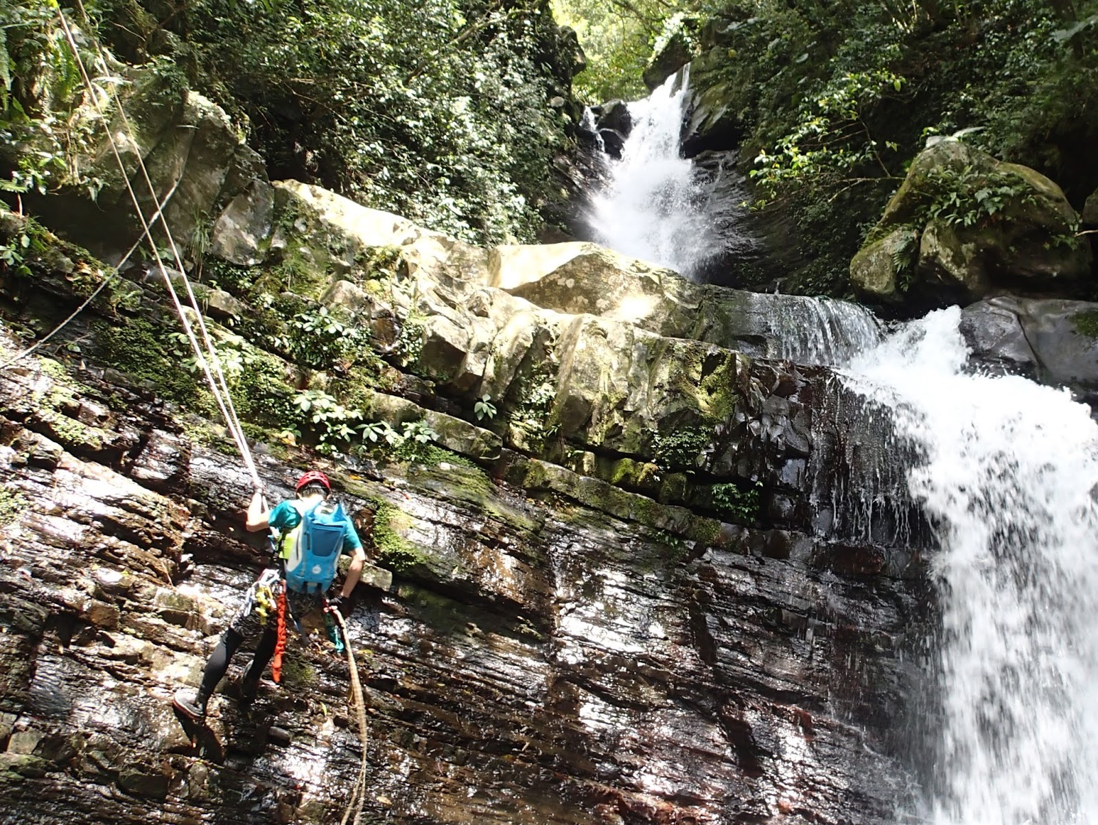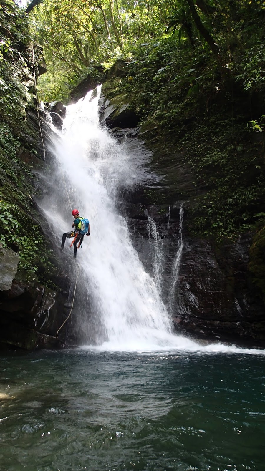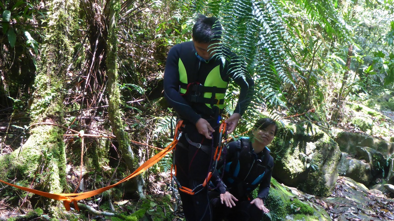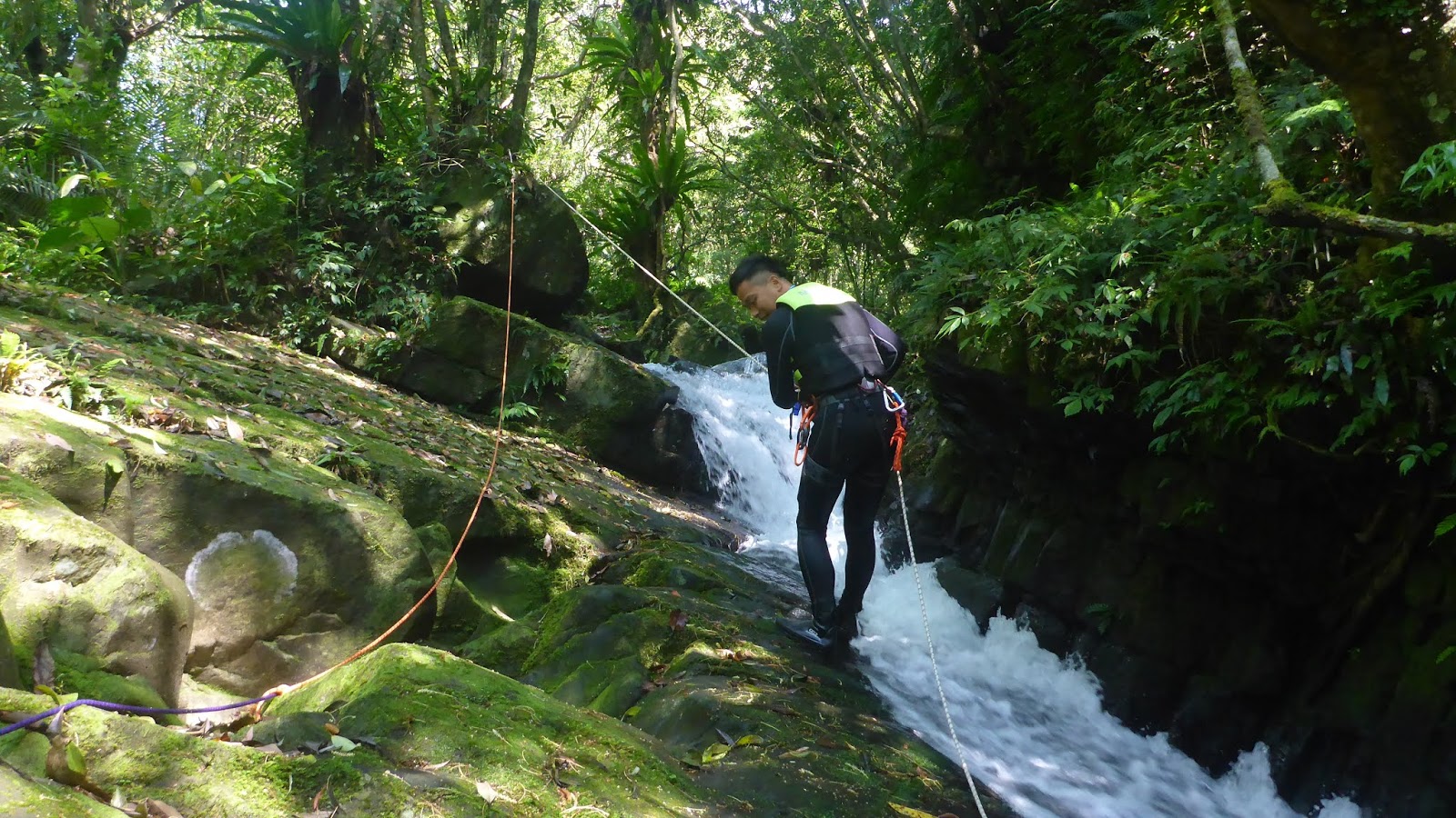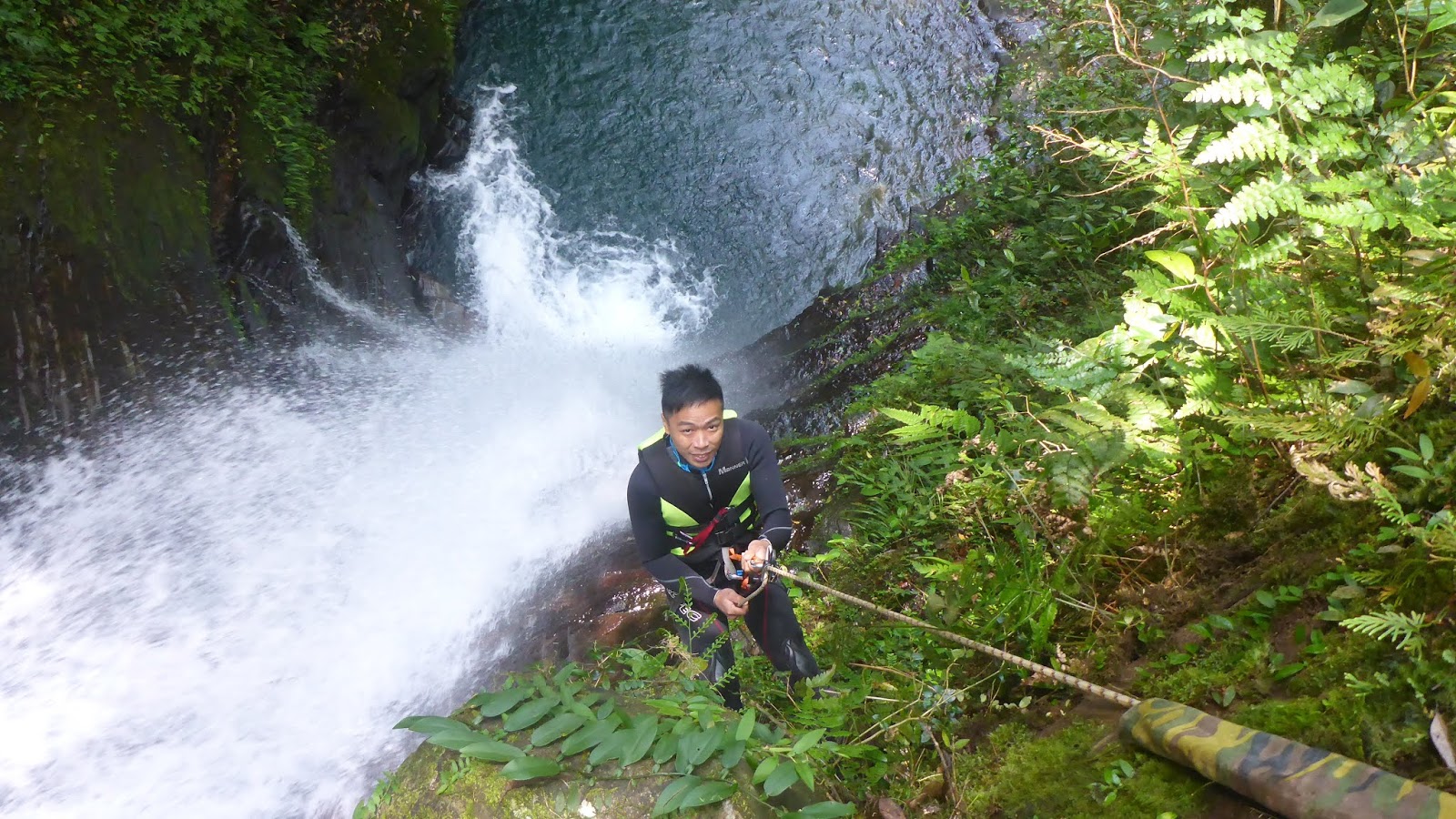 原本繩子都收好了,但下層還有一道瀑布,之前來什麼都沒有就靠一顆傻膽直接爬上爬下,不過地真的很滑,就算有別人現場的留繩,為了保險起見,還是決定再開繩垂降。