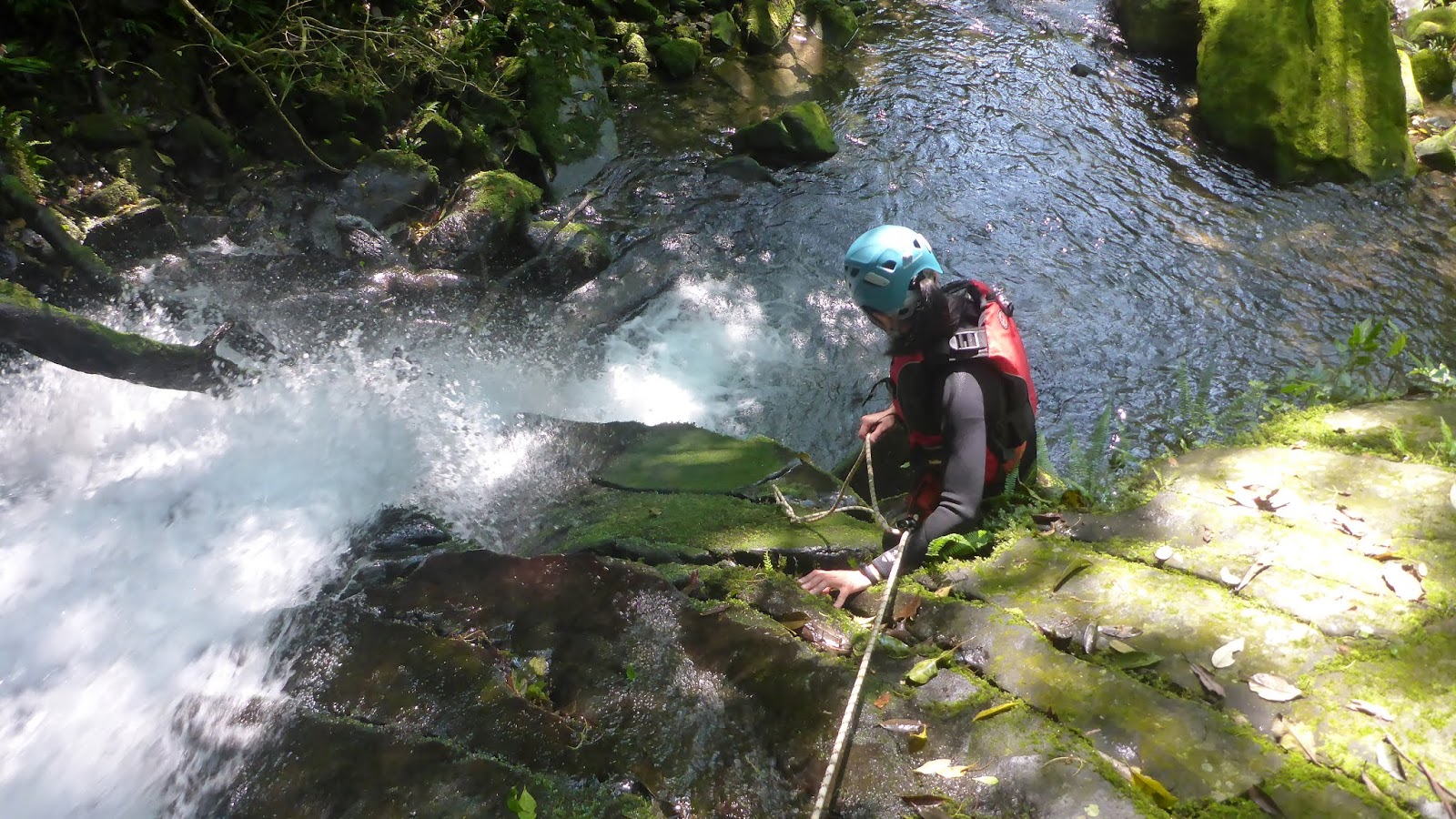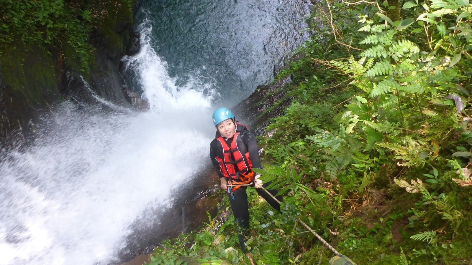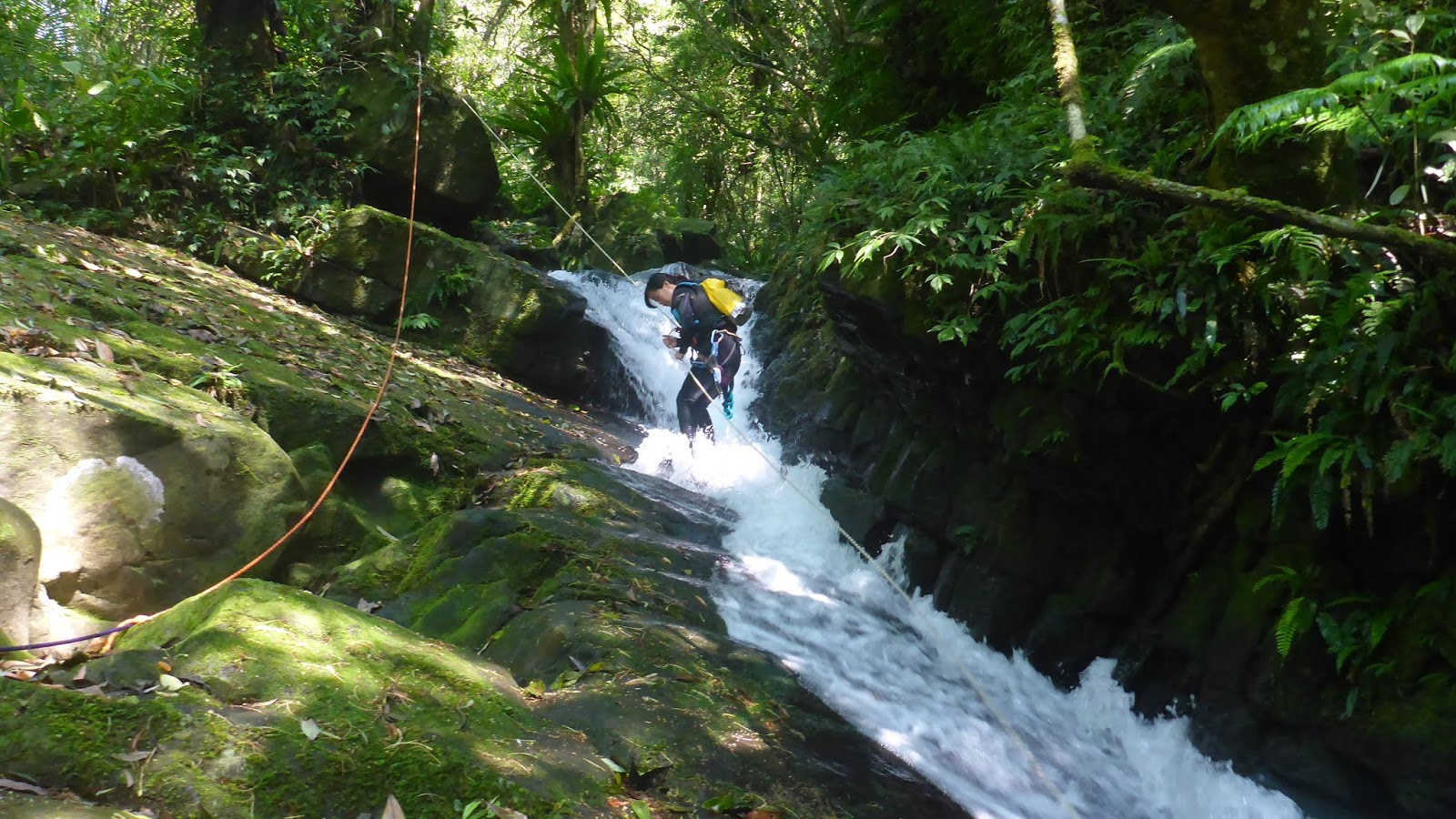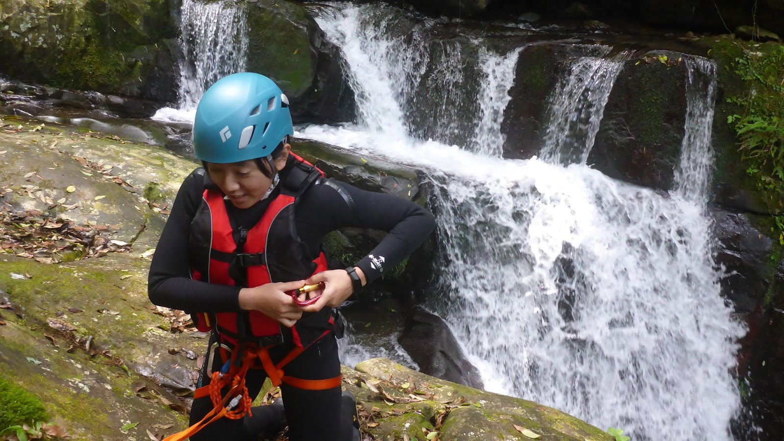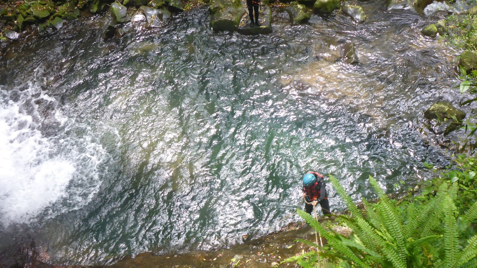 原本繩子都收好了,但下層還有一道瀑布,之前來什麼都沒有就靠一顆傻膽直接爬上爬下,不過地真的很滑,就算有別人現場的留繩,為了保險起見,還是決定再開繩垂降。