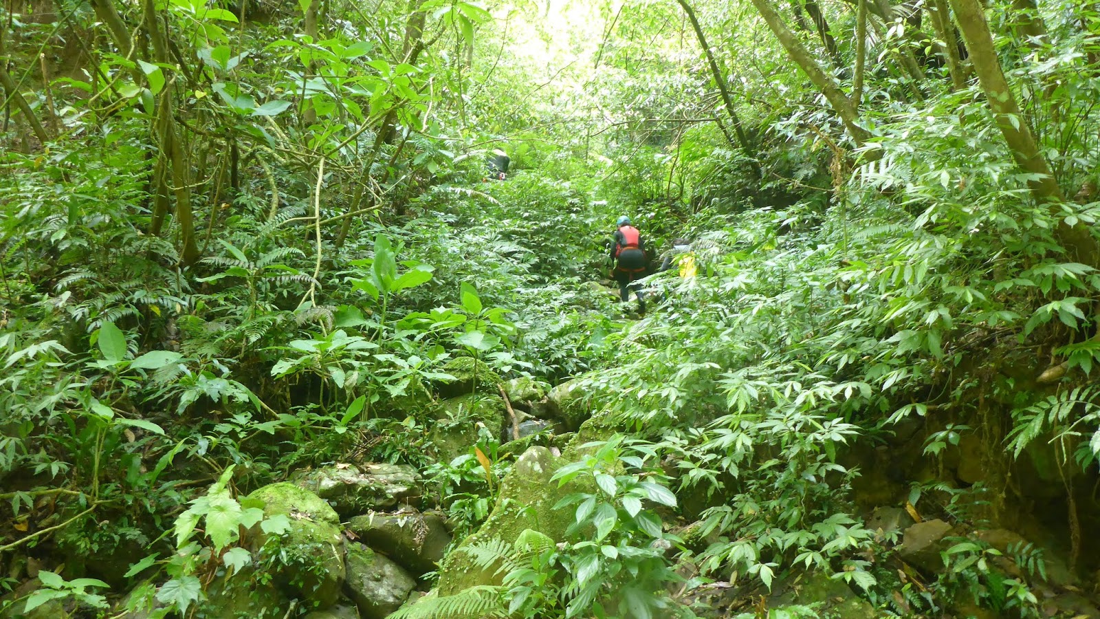 往下溯約50公尺左右,有一片斜壁附近就是上切路,真的找不到沒關係,繼續下溯到橋頭一樣可以回到馬路,久沒來有點忘了上切點在哪,讓隊友先稍等,我直接硬切上去回到馬路,再從正確下切點回溪谷喊隊友。