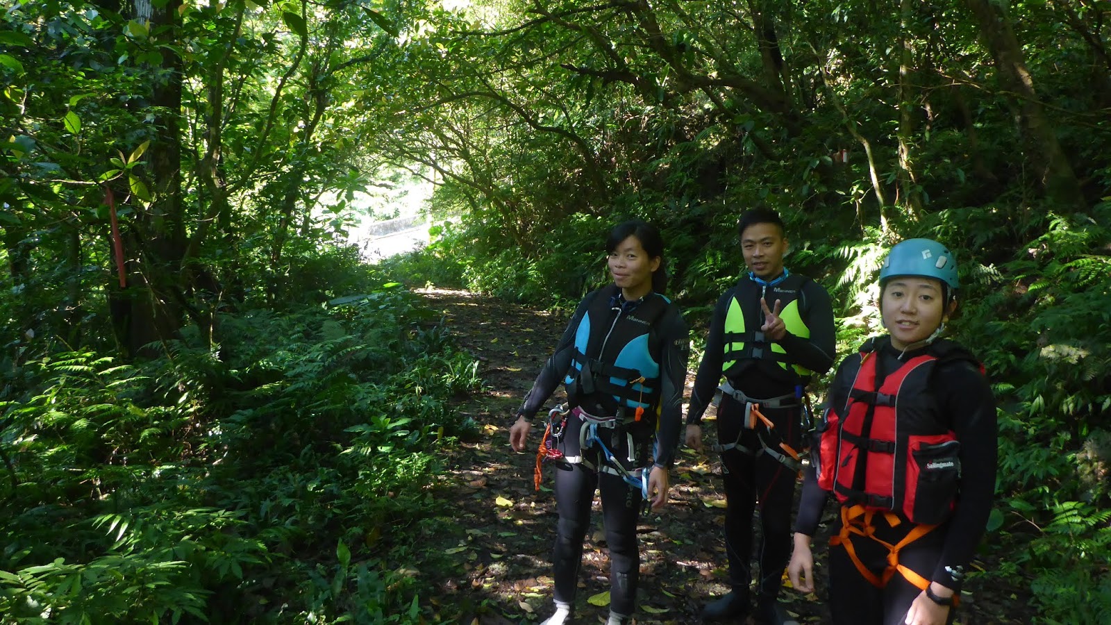 換奘的時候,先是兔子喊了一聲,阿!!!我忘了帶岩盔,小雞也忘了帶,哇哩勒...,好吧,今天溪谷距離很短就小心走還行,前一刻yoyo說還好我有帶岩盔,下一秒換她啊的一聲後:我吊帶忘了,本人..................(T.T),用扁帶在現場打一副穿上,大家都是常一起出來玩的朋友,知道他們不是故意的,但這狀況能避免就不要讓它發生,之後約團再多提醒了。