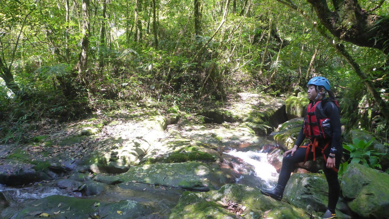 找處離溪不高的位置綁個繩就直接下切了,原本想說水會不會很冰,結果還好,覺得夏天宇內溪的水都還比這冰,下溯一路都是不難的小落差,但地挺滑,一路提醒小心慢慢走。