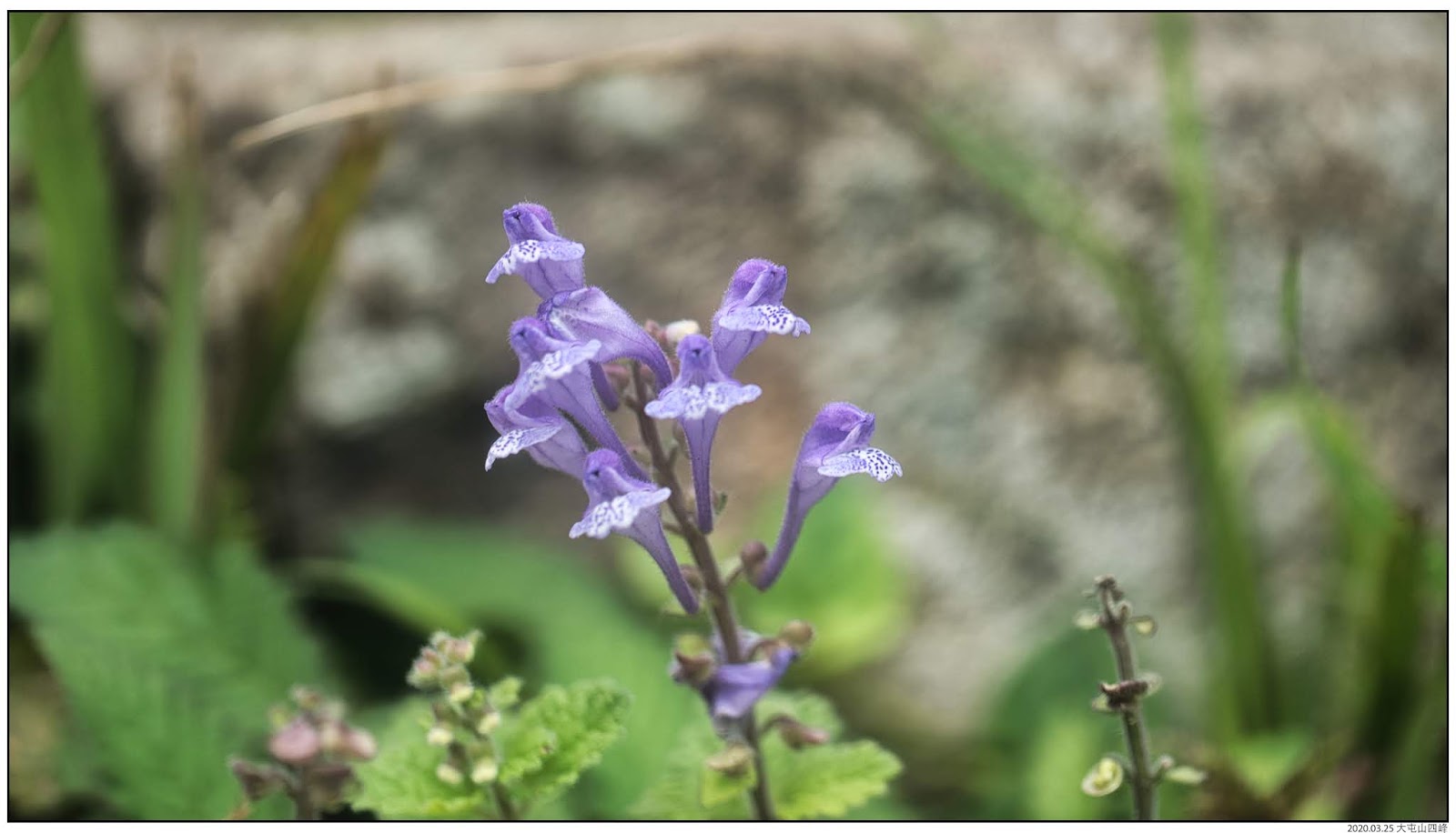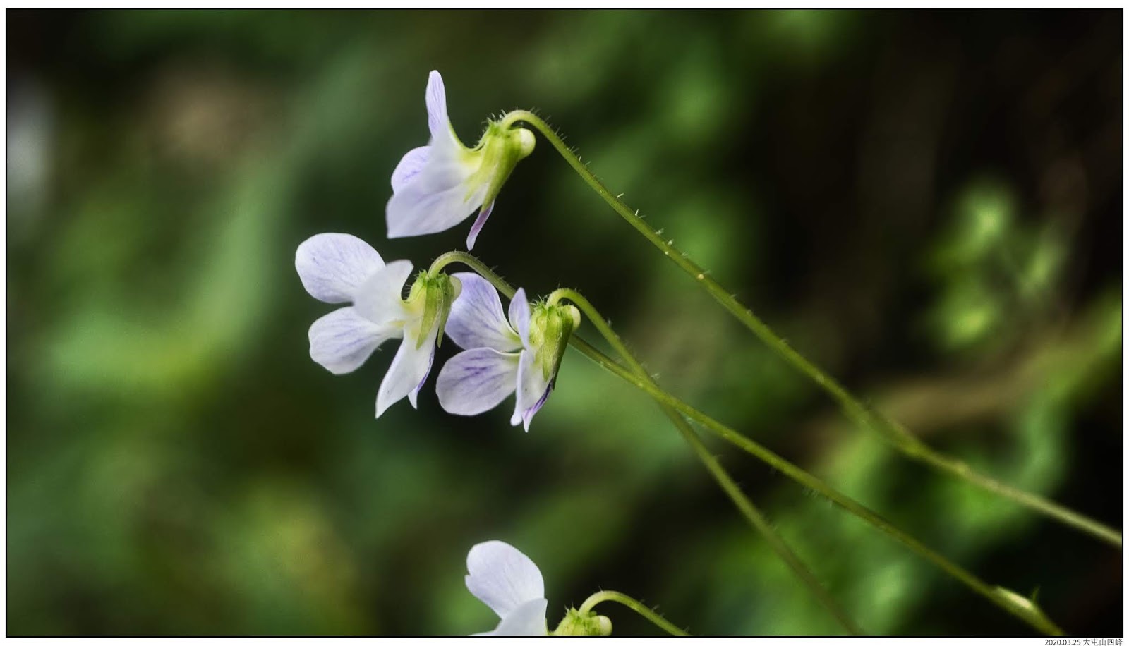 「唇形花瓣戽斗下唇」、「唇形花瓣上唇四瓣細長捲曲翅膀」,「小型菫菜」、「大屯山區」這四點。