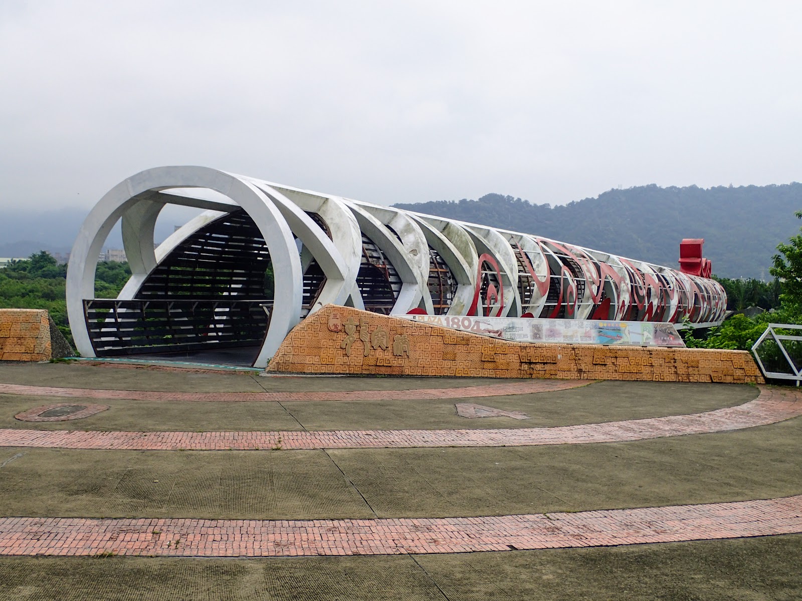 維基百科:三鶯龍窯橋又稱三鶯景觀橋, 位於臺灣新北市鶯歌區的行人單車專用的景觀橋, 跨越鶯歌溪, 連結新北市與桃園市單車路網, 於2013年啟用, 仿鶯歌龍窯橋體為龍身造型, 橋全長85公尺