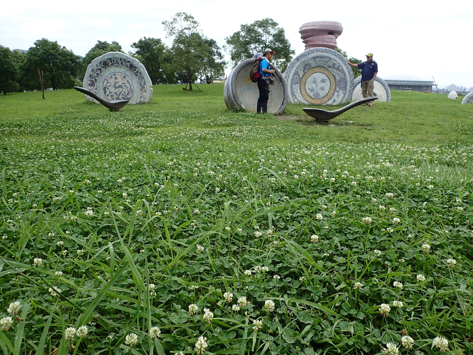 只見一整片青翠的草坪上有些大尺寸復古又帶著中國風的餐盤杯具, 看起來挺特別的, 眾人見獵心喜展開獵瓷行動