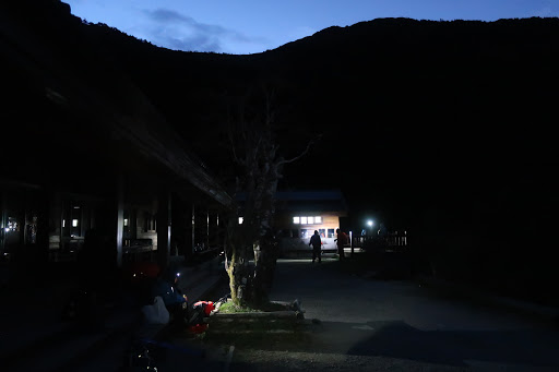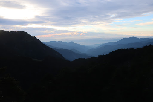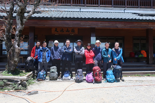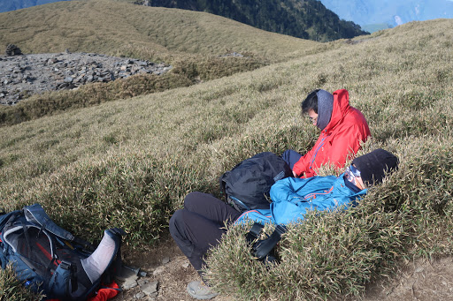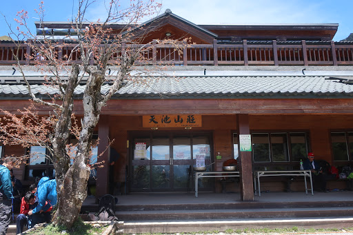 抵達天池山莊約4:30,開始大休煮水泡茶,歇歇腳順便吃早早餐。由於山莊還在整修,裡面黑矇矇一片,似乎只有睡工人。外面營地早搭滿帳篷,等到東方魚肚白,大家也開始動身準備起登。從走廊上看到許多已經用完的早餐,看來有更多人已經出發攻頂。從天池山莊後山路比較陡,但也不至於難走。抵達天池營地後會遇到叉路,一邊往奇萊南峰,另一邊往南華山,一般而言大家都會先選奇萊南峰再去南華山,因為這樣還能從南華山下光被八表再繞回天池山莊。