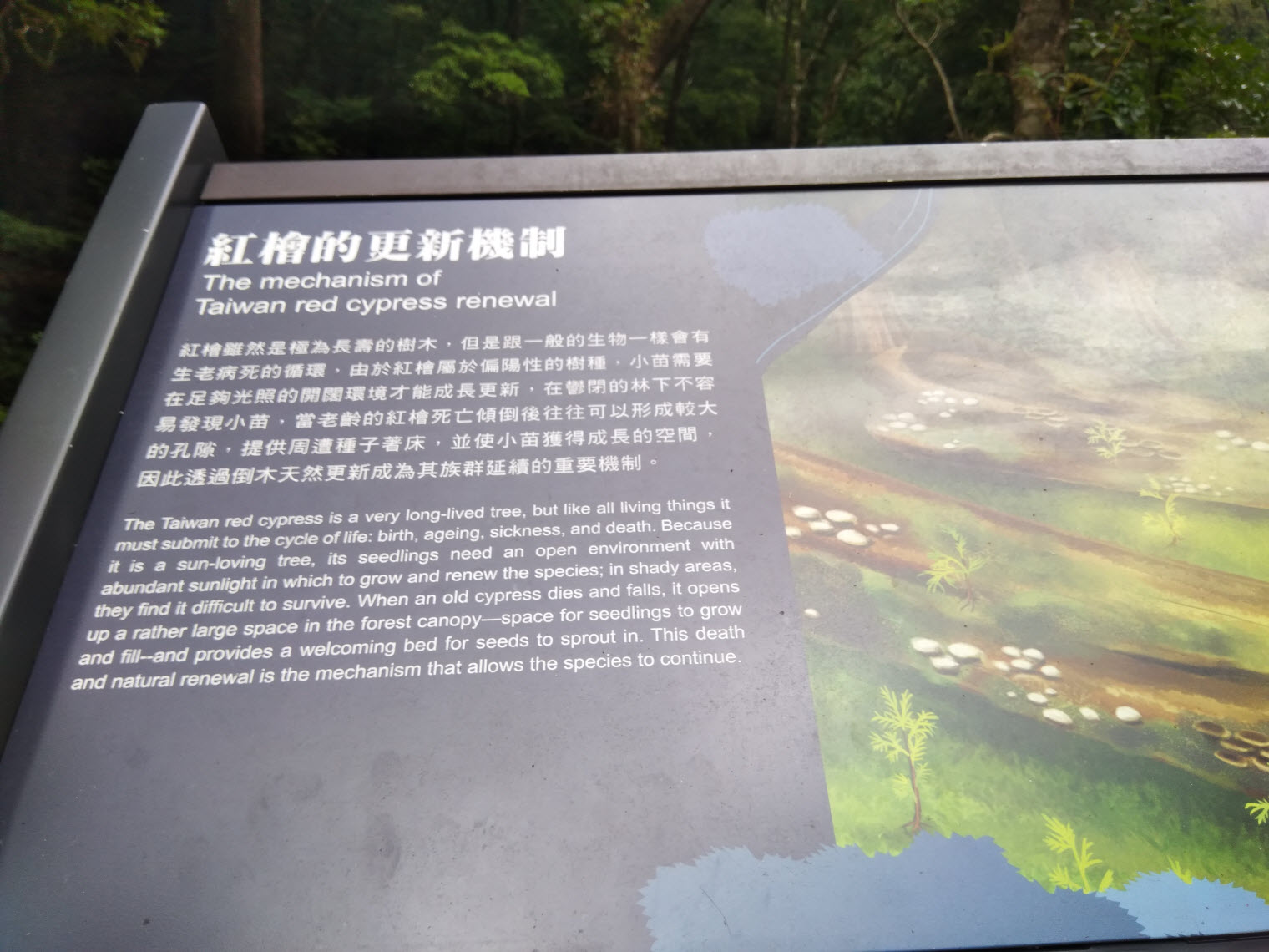 倒木上的導覽說明了自然界的更新機制,這個重大意義就是為後代提供了生機