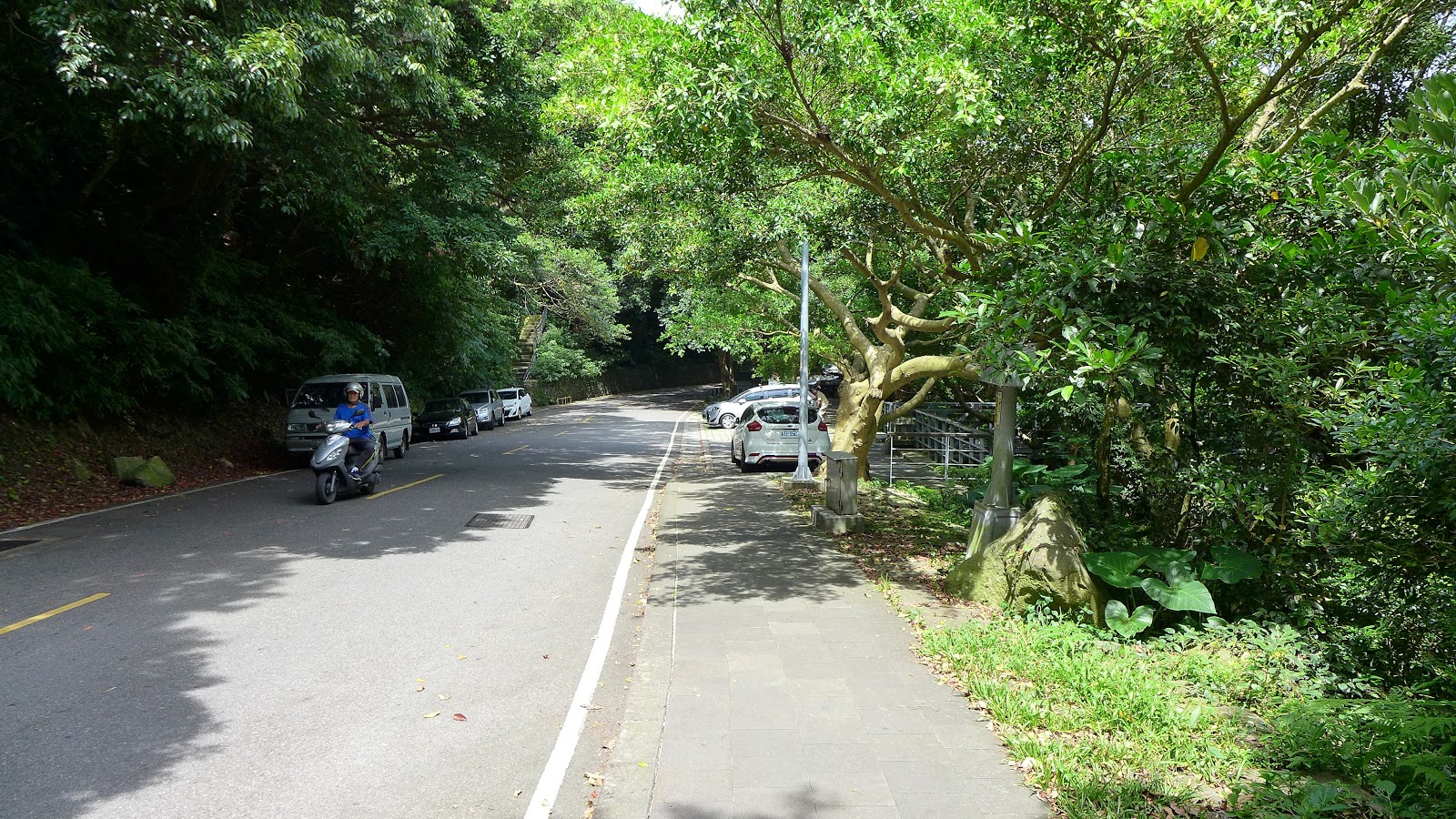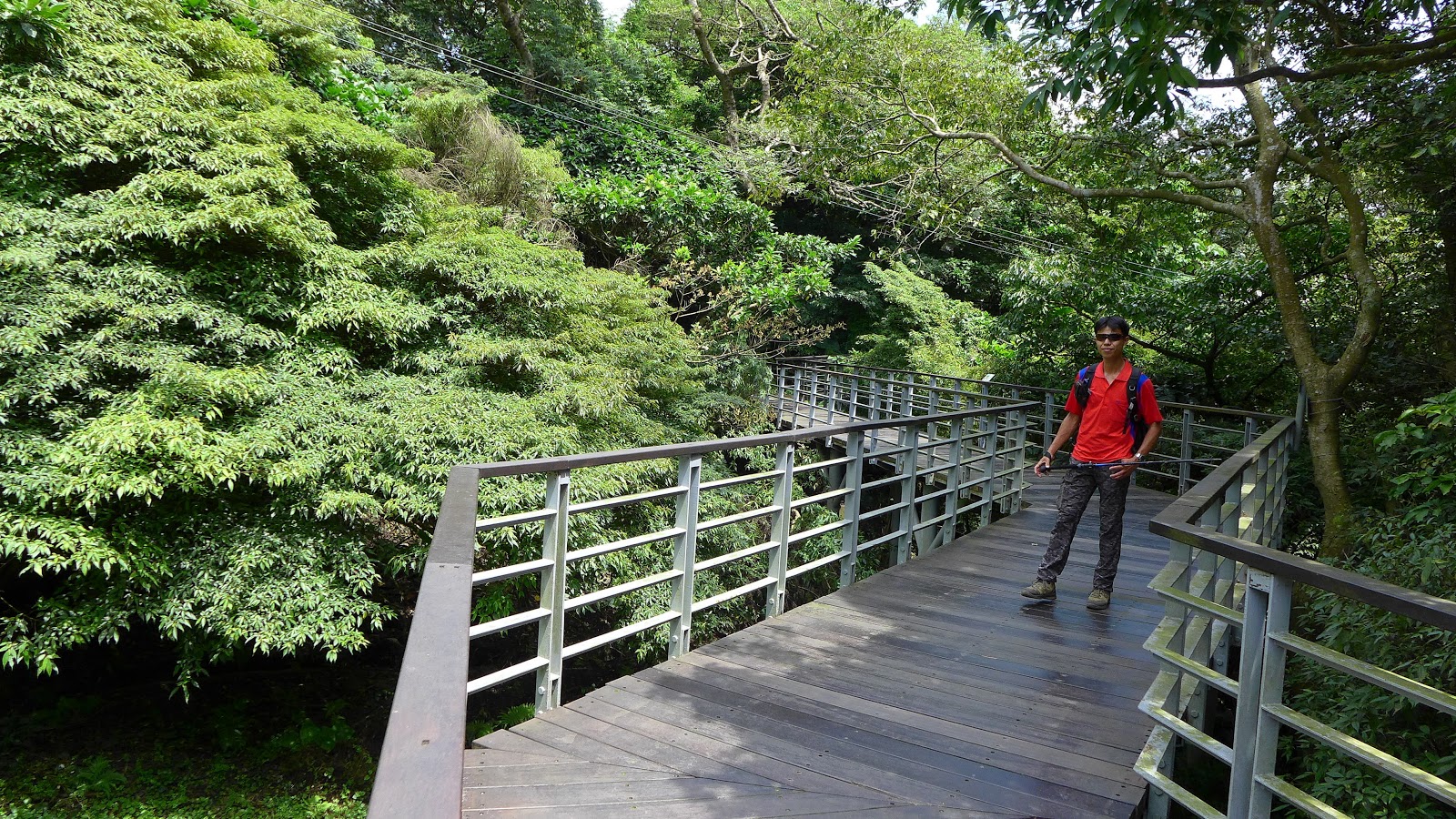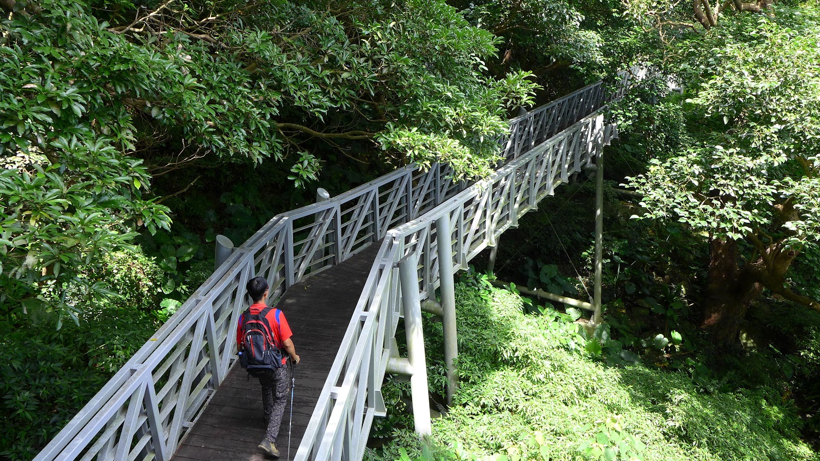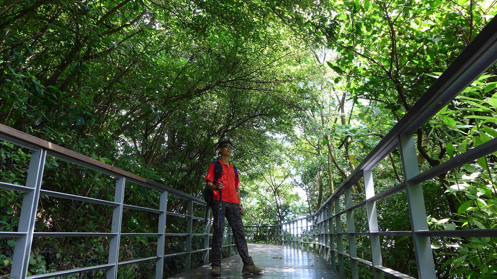 林稍步道行至開山園告一段落,接下來循道路前往硬漢嶺登山口,這條步道走起來很舒服,但有個小小感想,如果欄竿顏色設計上能更融入樹林,整體看上去是否會更加自然。