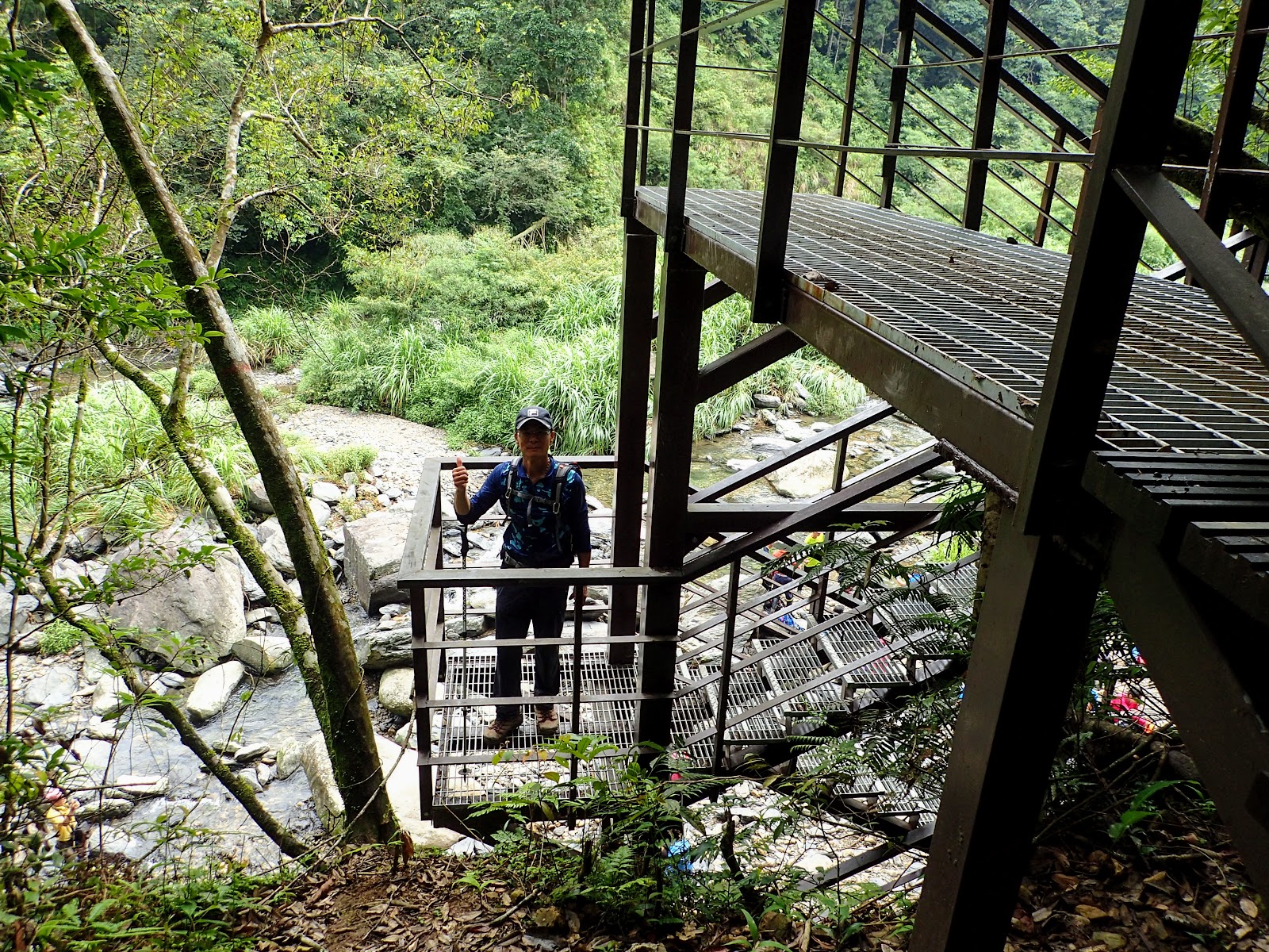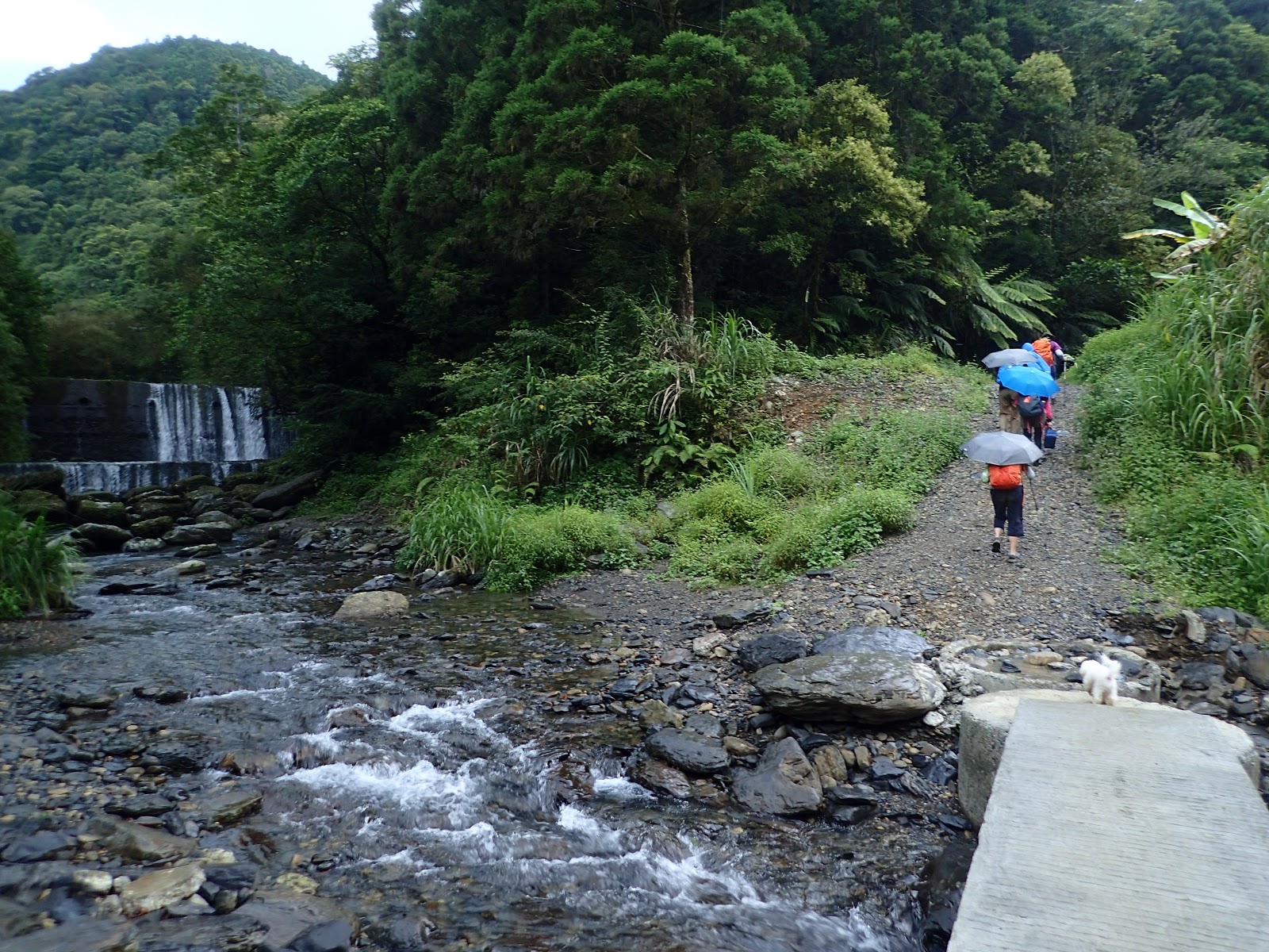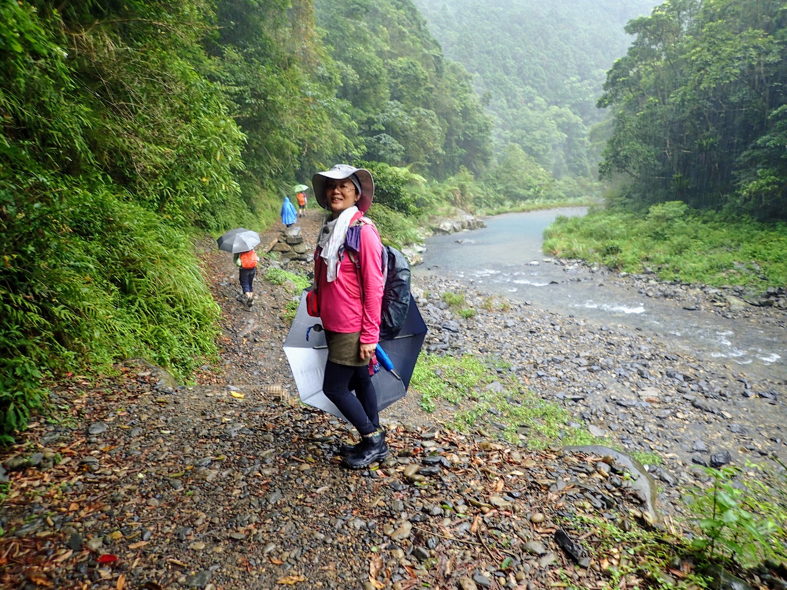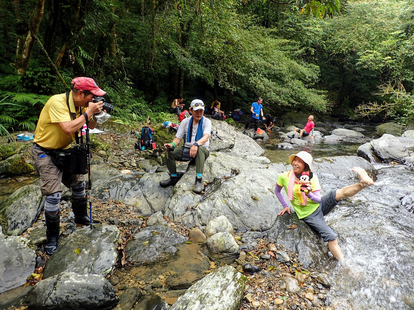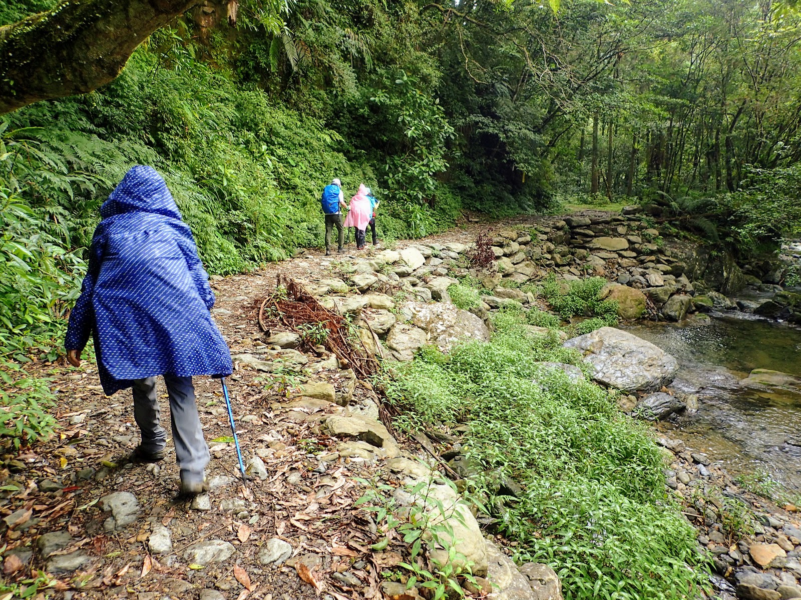 跟兩位休息的山友會合, 下溪邊拍拍照, 吃了好吃的豆乾, 喝了甘甜的茶後, 一起走回停車處, 途中雨漸大