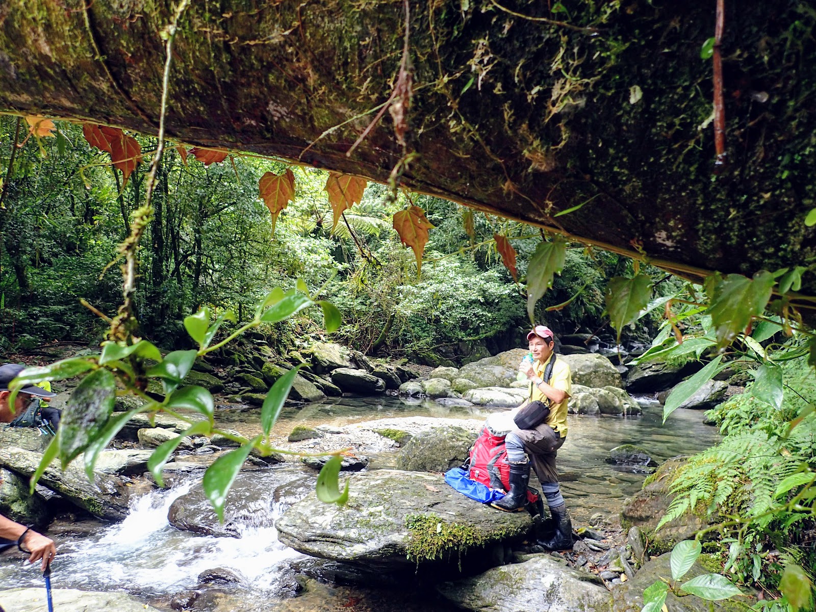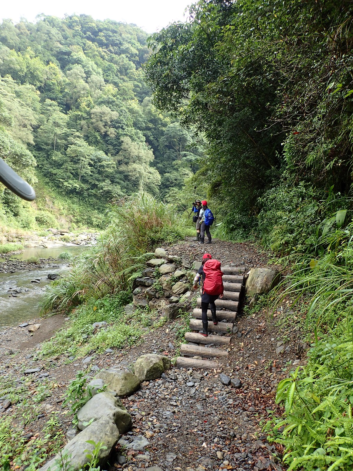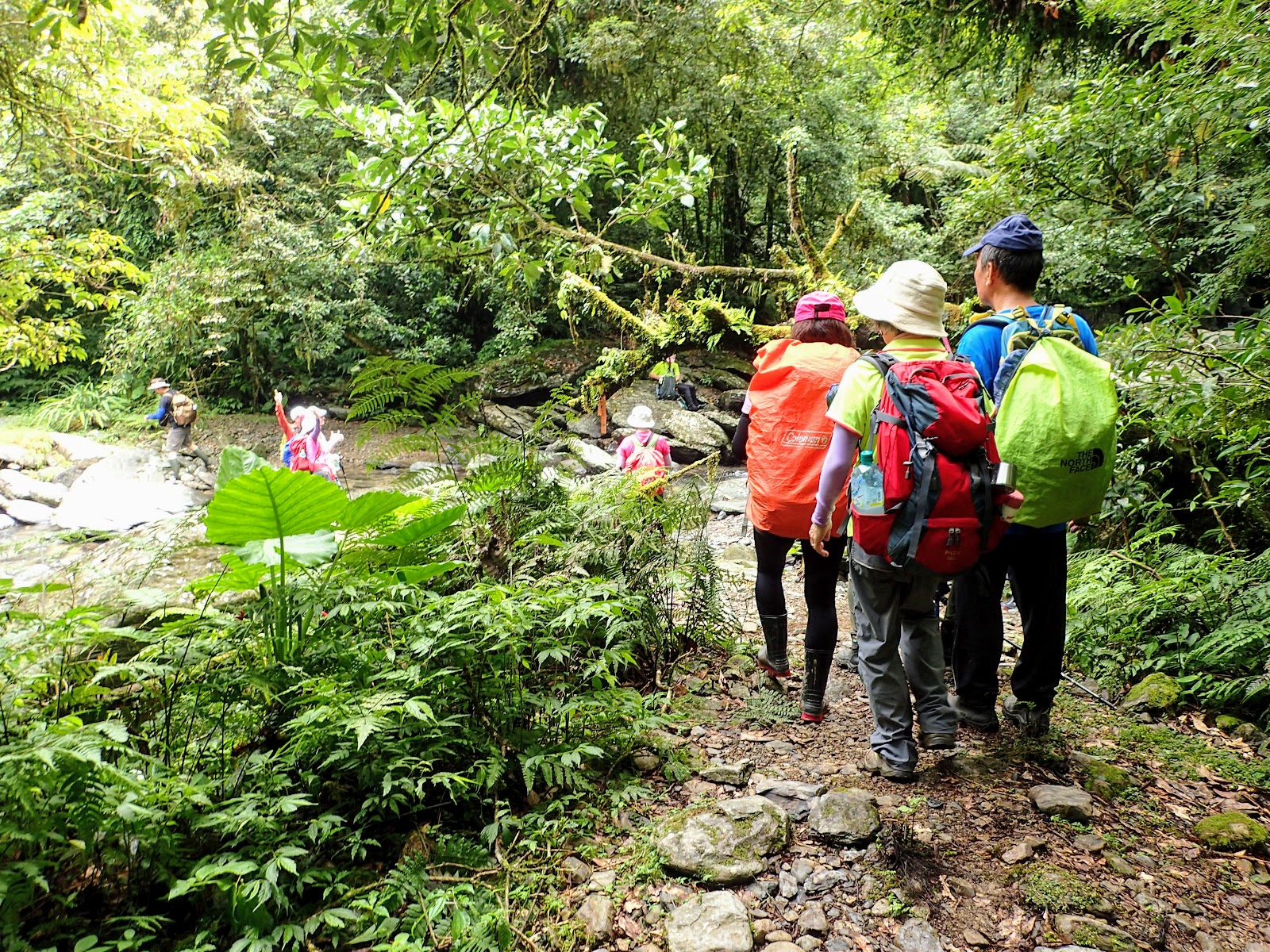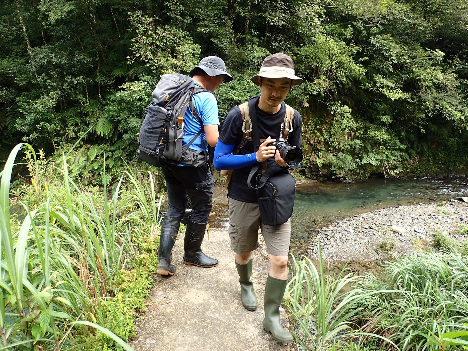 跟兩位休息的山友會合, 下溪邊拍拍照, 吃了好吃的豆乾, 喝了甘甜的茶後, 一起走回停車處, 途中雨漸大