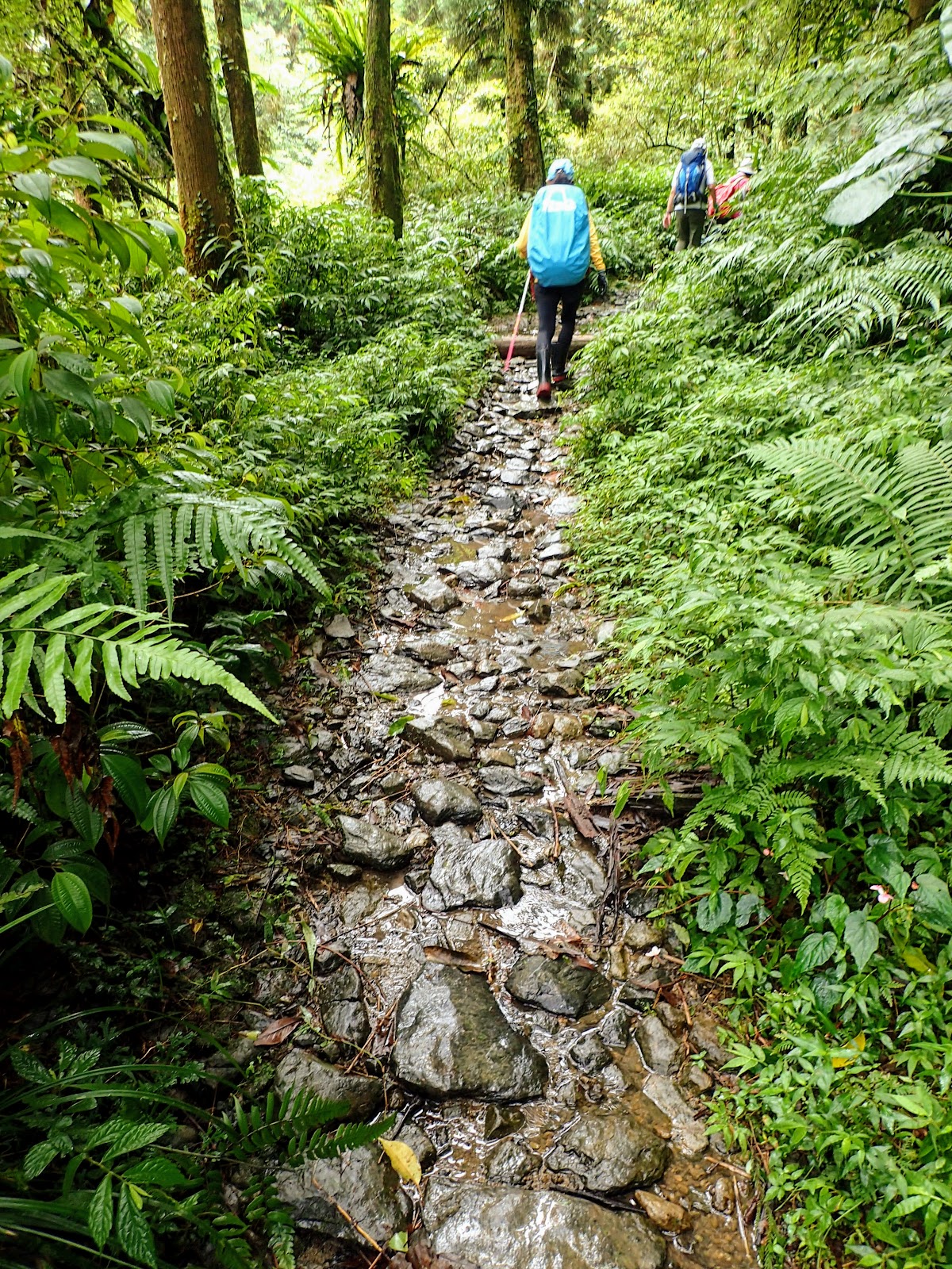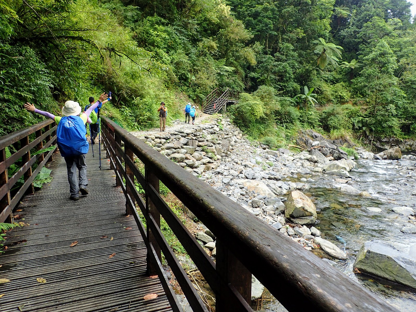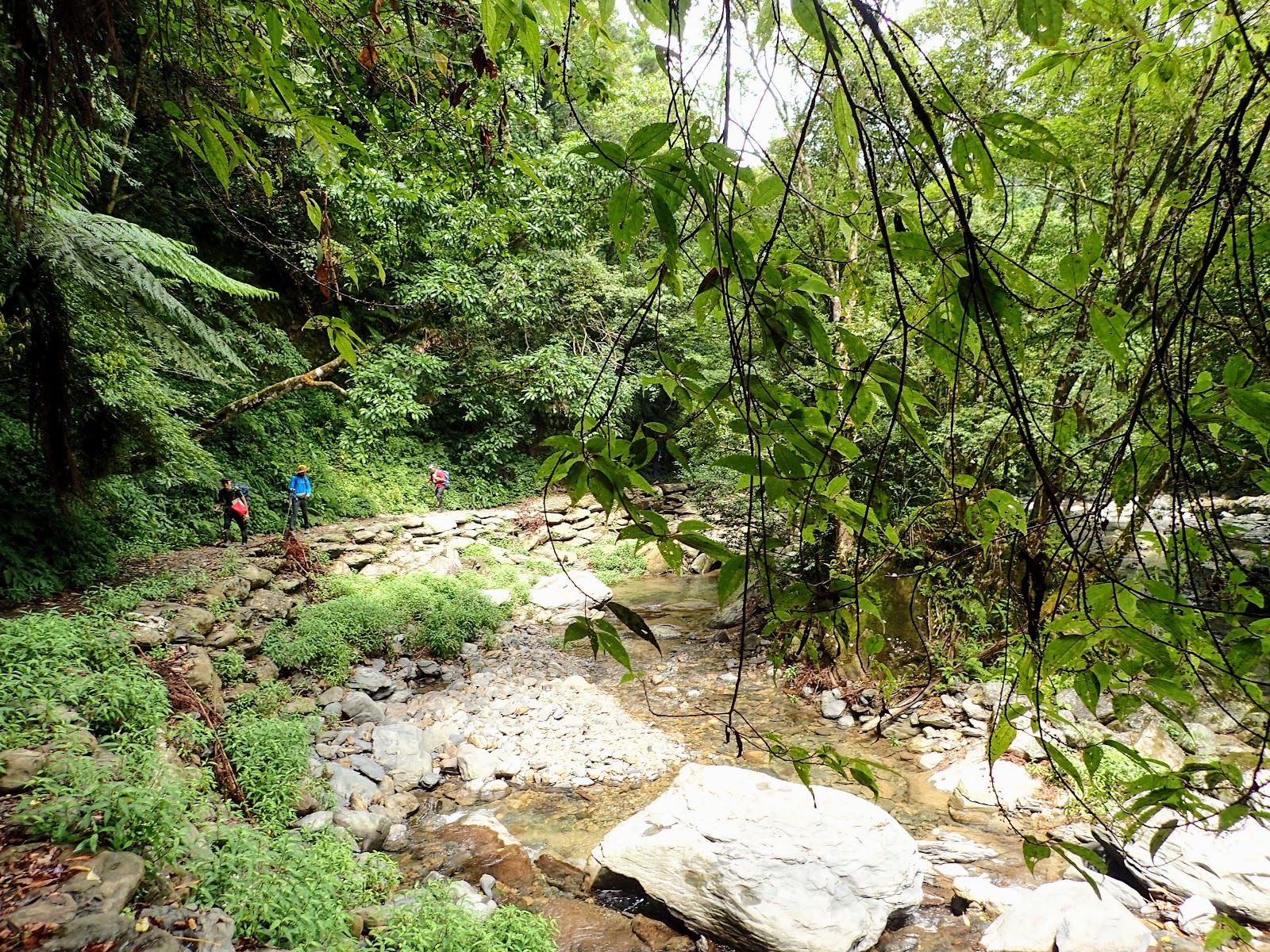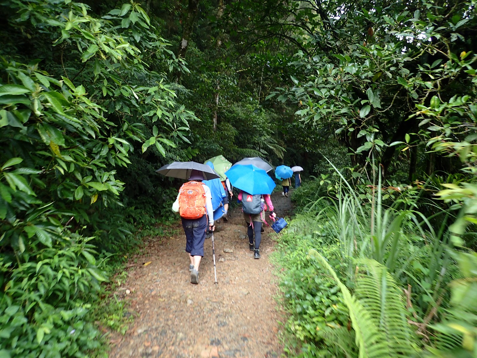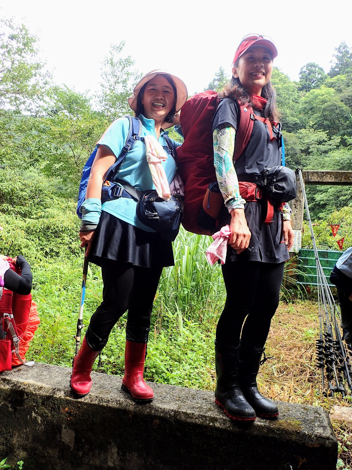 跟兩位休息的山友會合, 下溪邊拍拍照, 吃了好吃的豆乾, 喝了甘甜的茶後, 一起走回停車處, 途中雨漸大