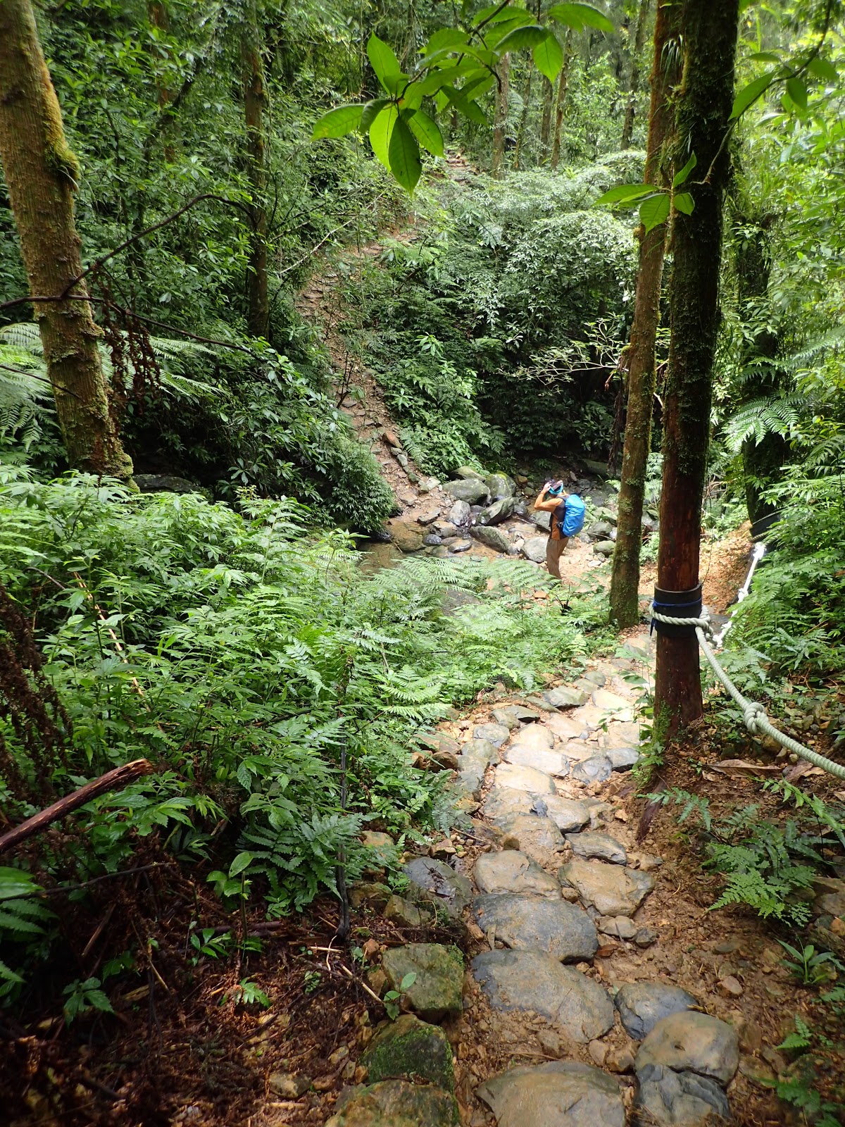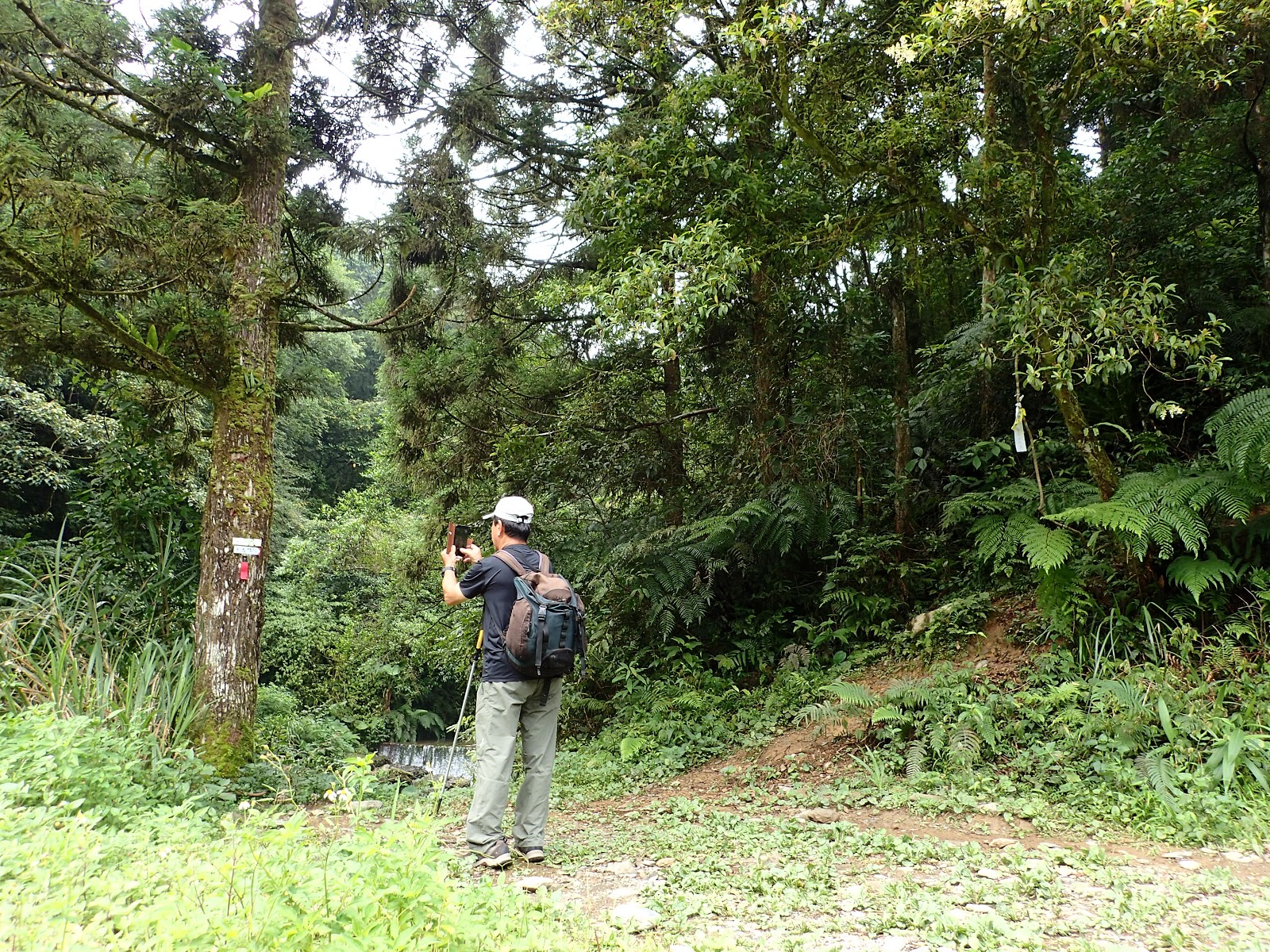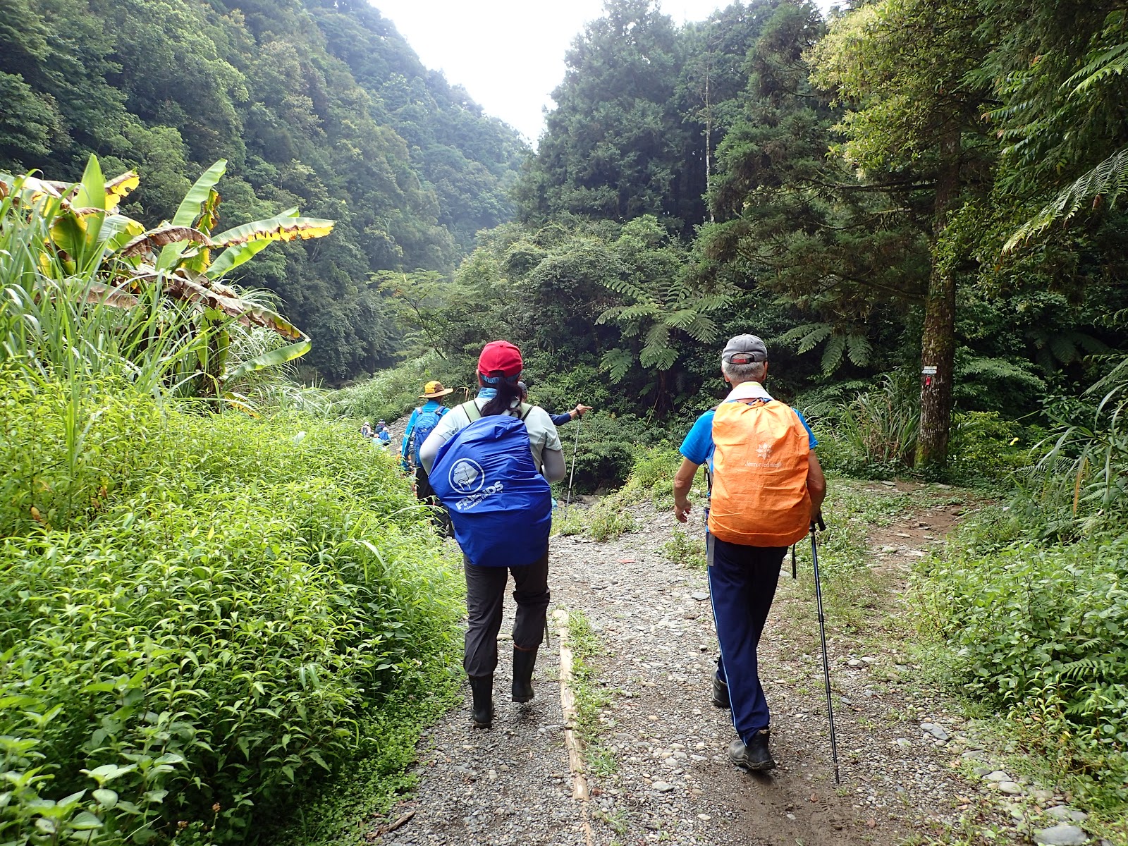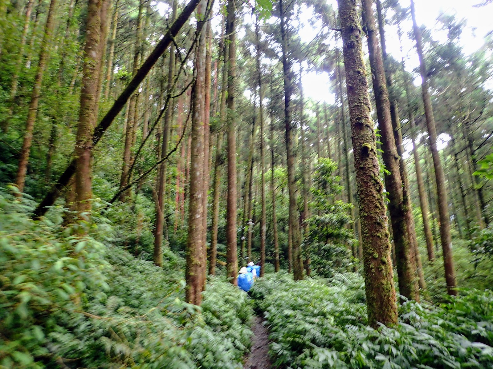 跟兩位休息的山友會合, 下溪邊拍拍照, 吃了好吃的豆乾, 喝了甘甜的茶後, 一起走回停車處, 途中雨漸大