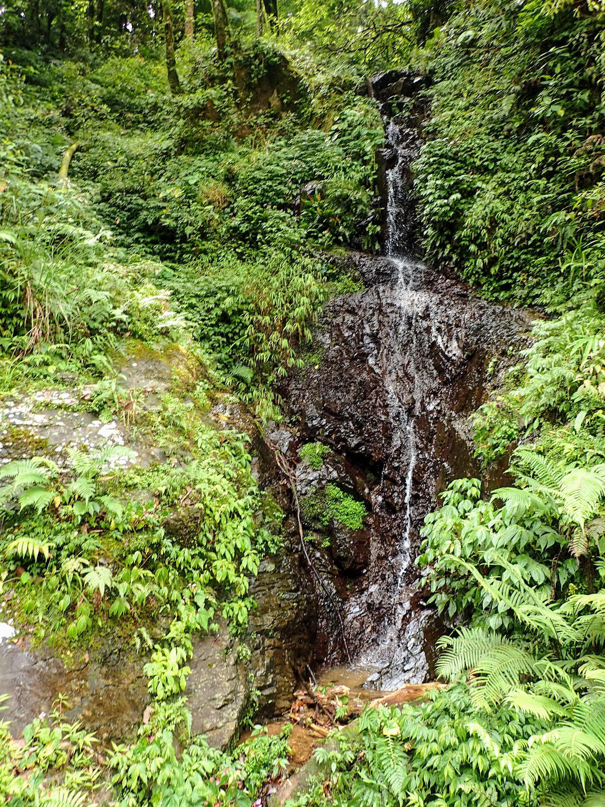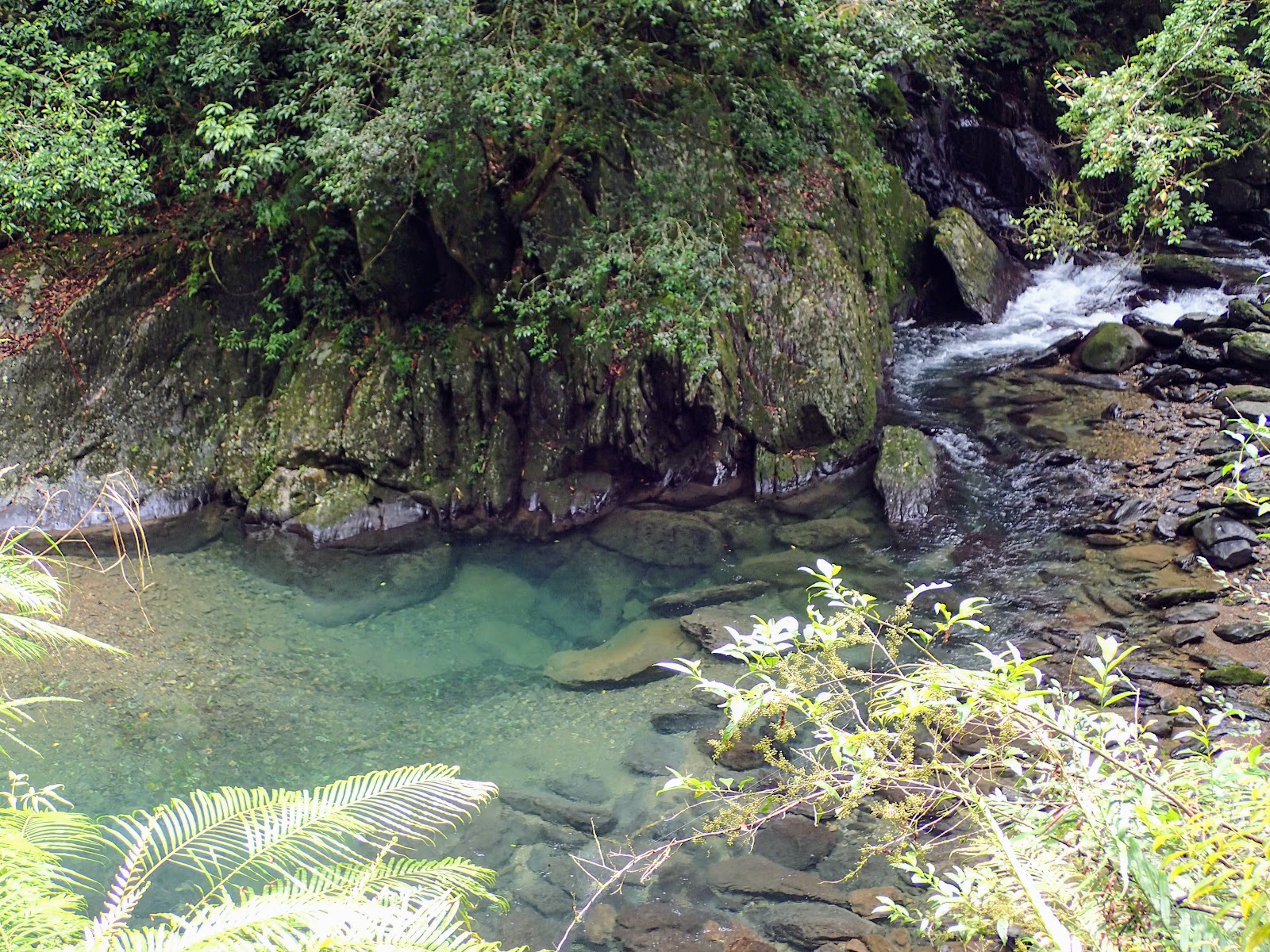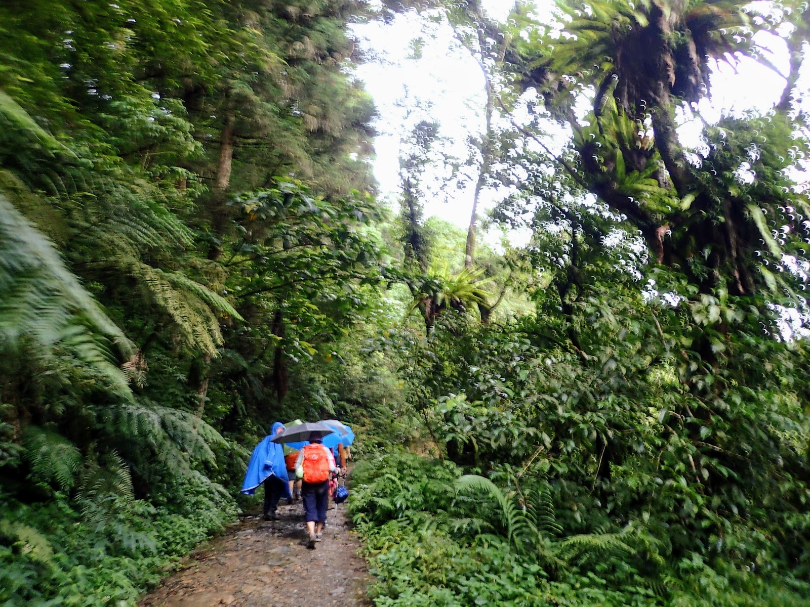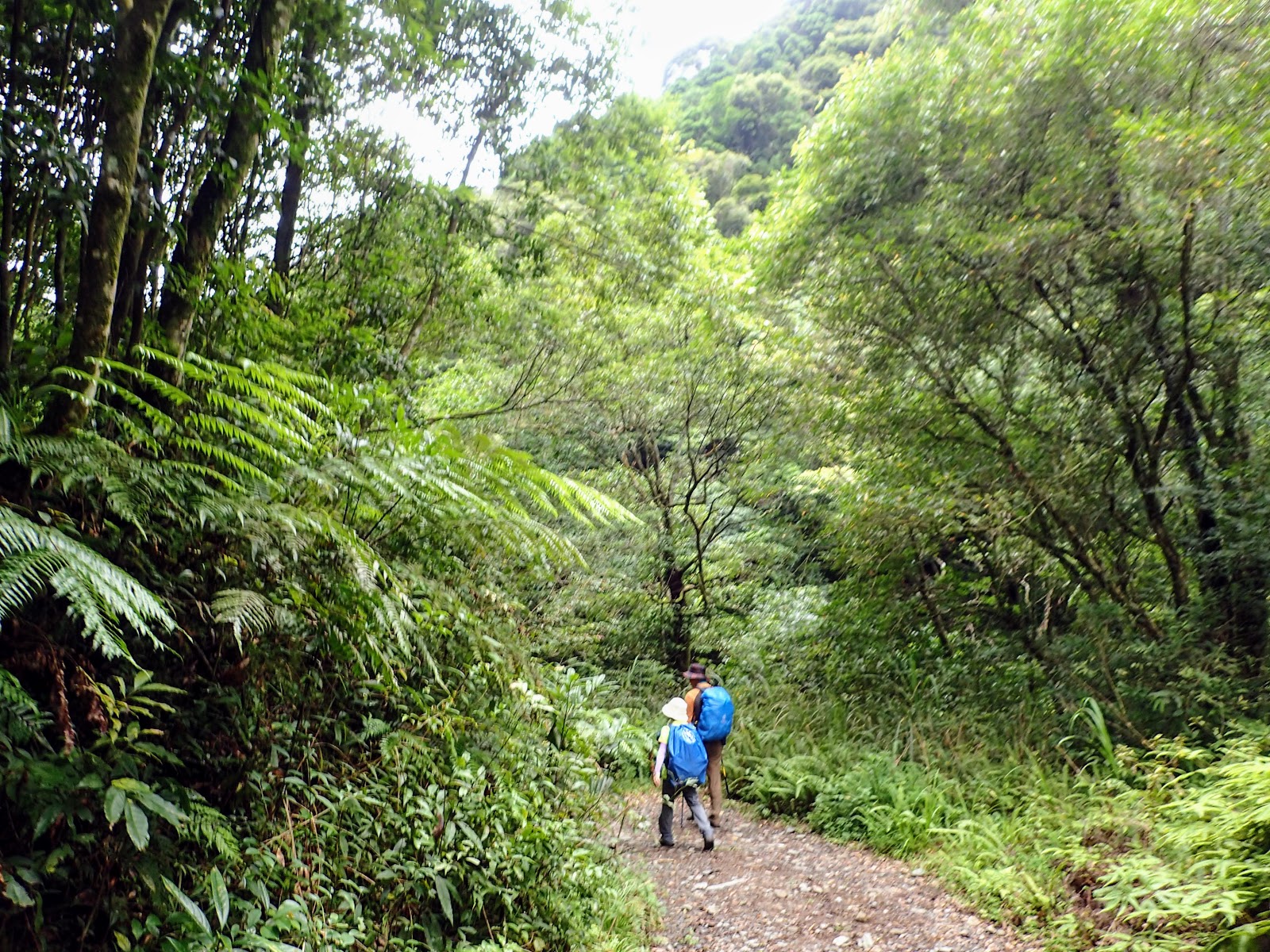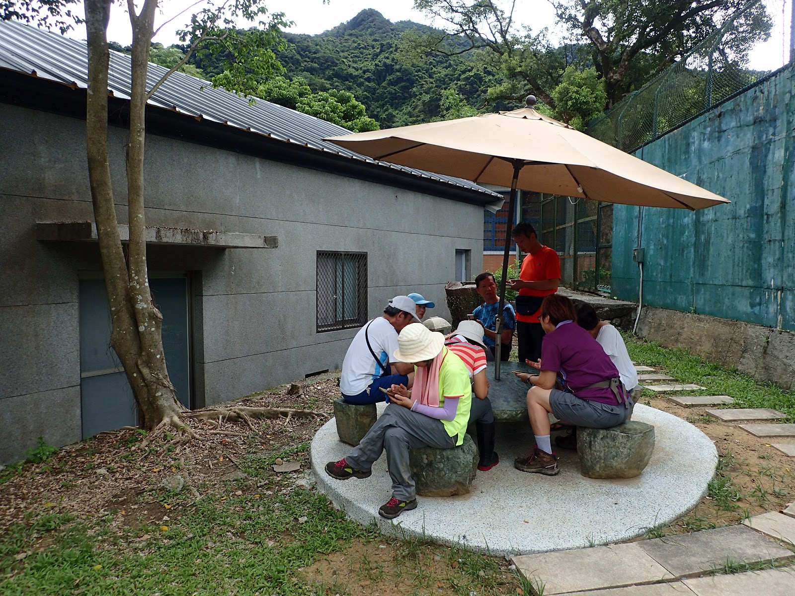 跟兩位休息的山友會合, 下溪邊拍拍照, 吃了好吃的豆乾, 喝了甘甜的茶後, 一起走回停車處, 途中雨漸大