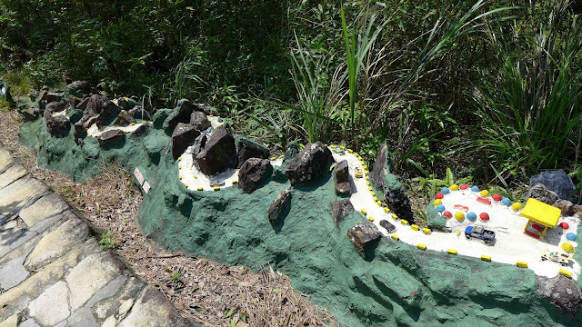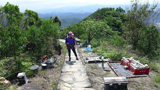 回到步道,續行不用10分鐘就可到鯉魚主峰涼亭,沿途有許多小人國般的造景藝術,雖不精緻但小巧可愛,為劉先生花15年無償製作,請大家觀賞之餘也要愛惜。
