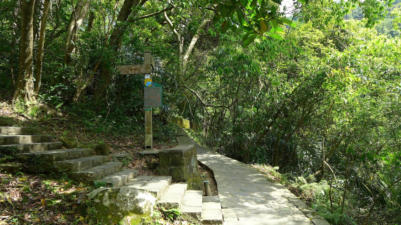 走到底抵達鯉魚山登山口,平緩步道沿大溝溪緩升,至下一處叉路,取左上往鯉魚山,直行可至圓覺瀑布,規劃路線回程時會從另一端經過。