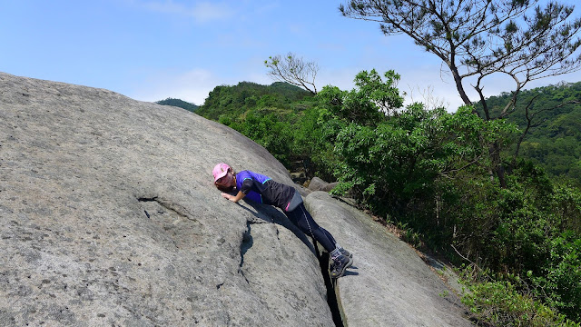 龍船岩為一平整大岩壁,一側45度另一側垂直峭壁,因外型像龍舟而得此稱呼,上去小心即可,難度並不高,景觀視野很棒,先把我們2個背包拿到下山方向那的空地擺著。