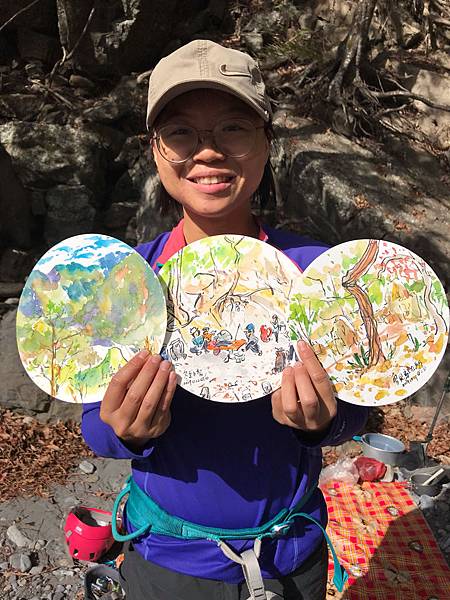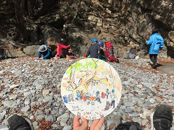 也初次見識隊友強大的速寫,共畫了3幅:雪見駐在所、被蜜蜂包圍時仍能作畫出的龜山島、大安溪河床午餐時的7人畫。