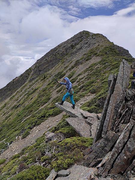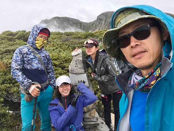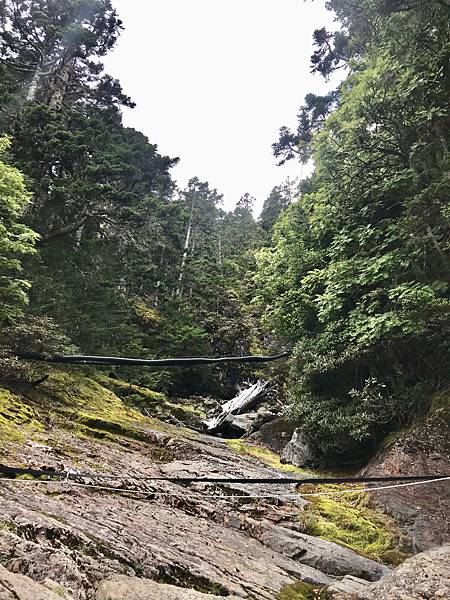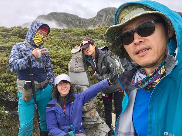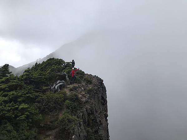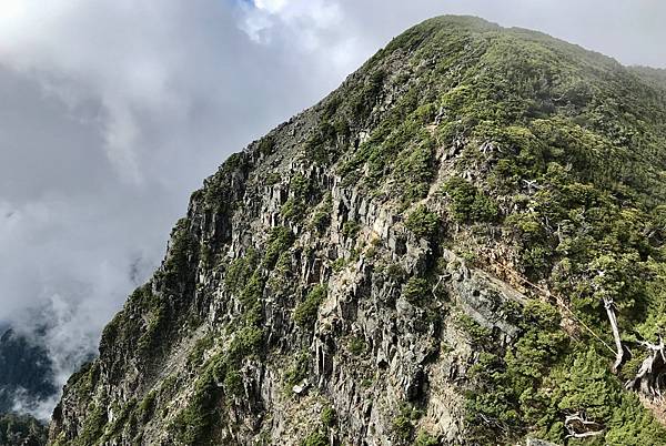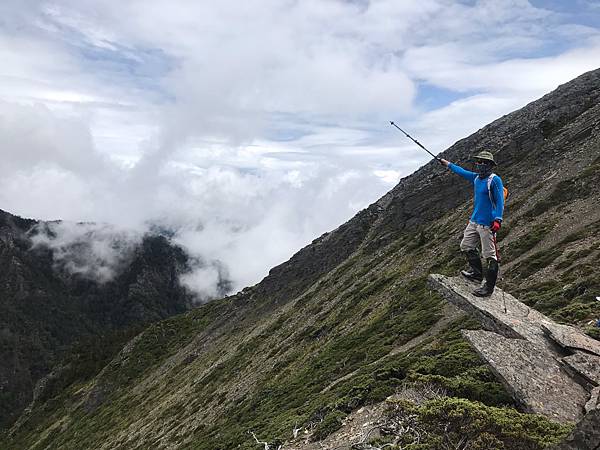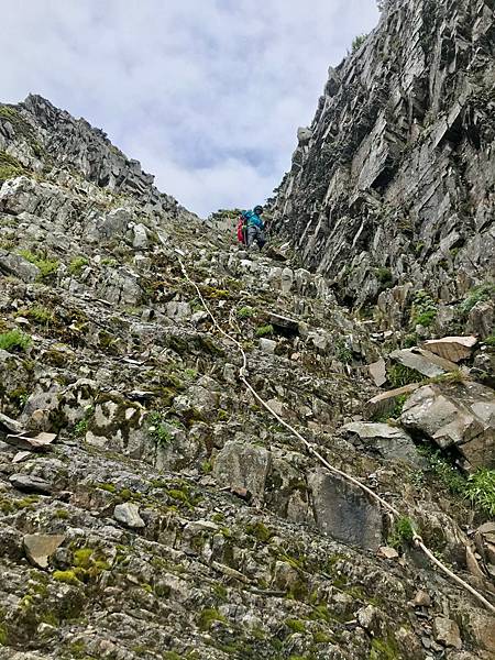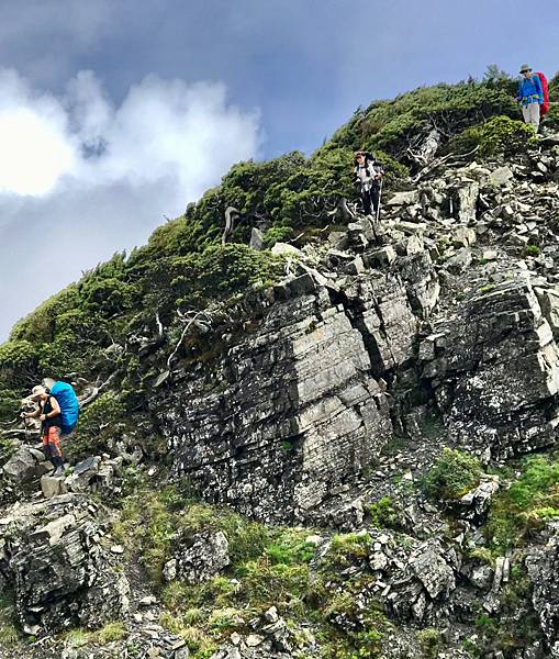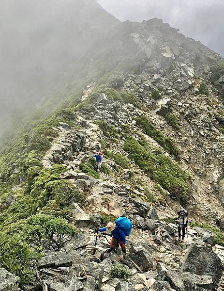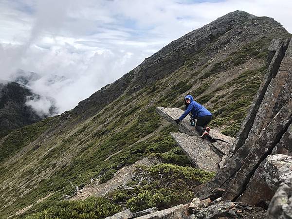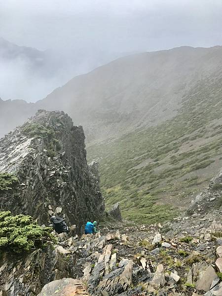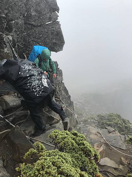 ?13:00 回到山屋之前雖沒有下雨,但天氣變化無常,時大太陽時起大霧,也好像約17:00就下雨了,如果我們當時續走到林專山,回程攀這段峭壁時就是在雨中狀態進行了; 1310出發回程往雪北