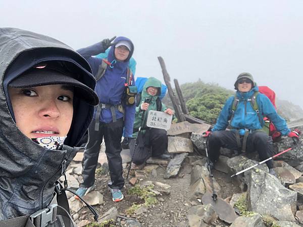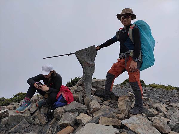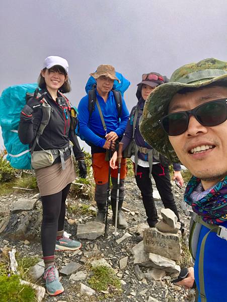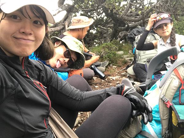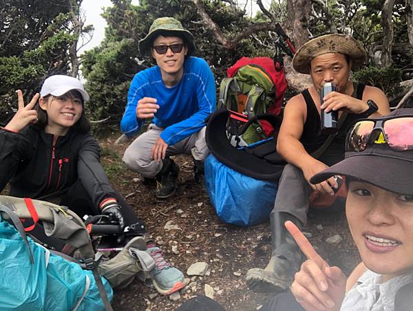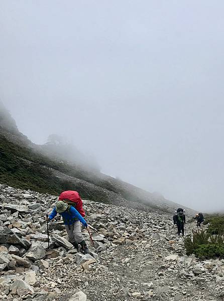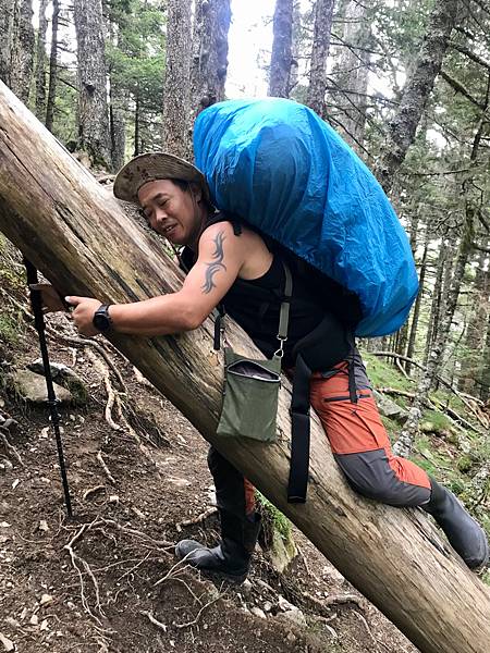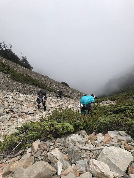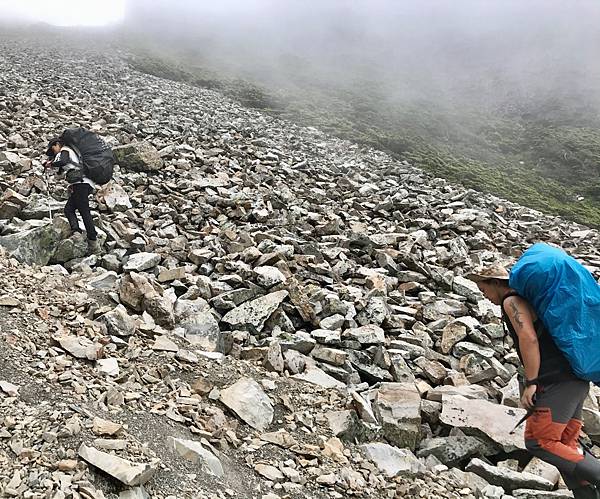 ?虎哥的包包可能整裝時重量分配不均、或帶子長度不一而產生包包傾斜問題,但人也很有問題......因為他不知道他包包的腰帶是要扣起來的?! 13kg? 便全部在肩膀上,直到上了雪北鞍部碎石坡後才知道要扣起來,這是真的! 超膩害(蝦)的! 我們也沒在注意的QQ