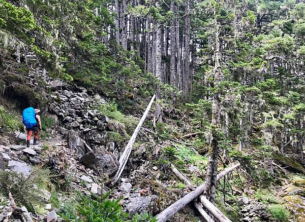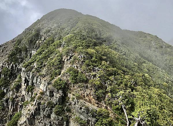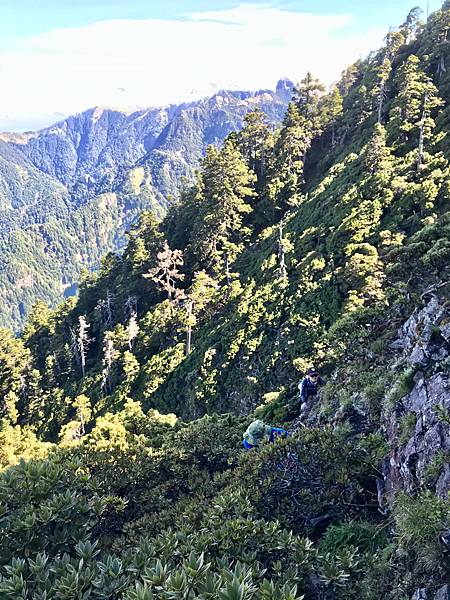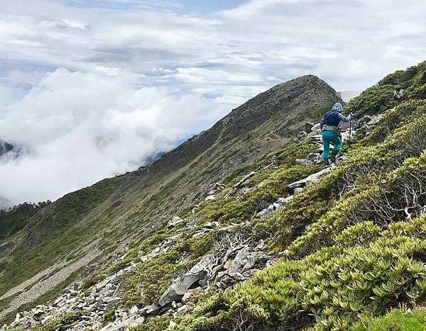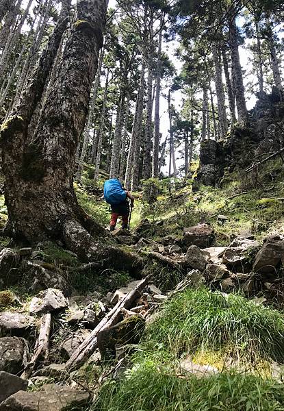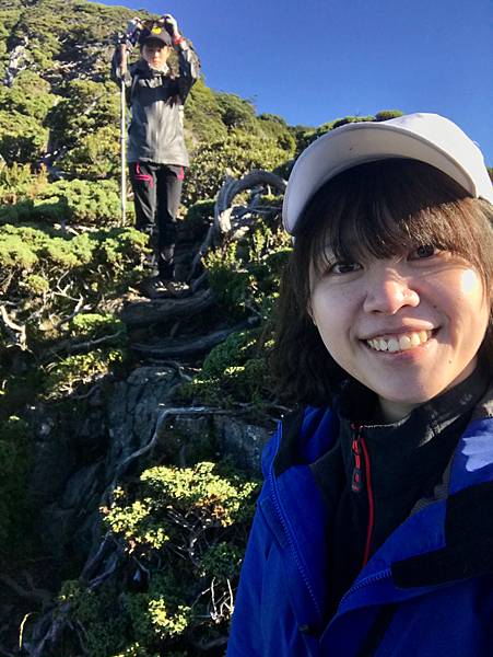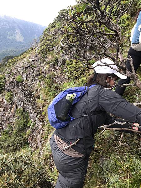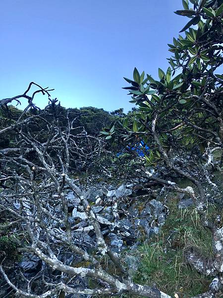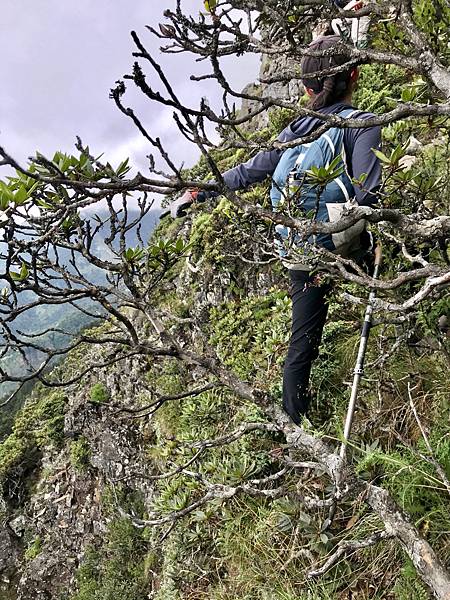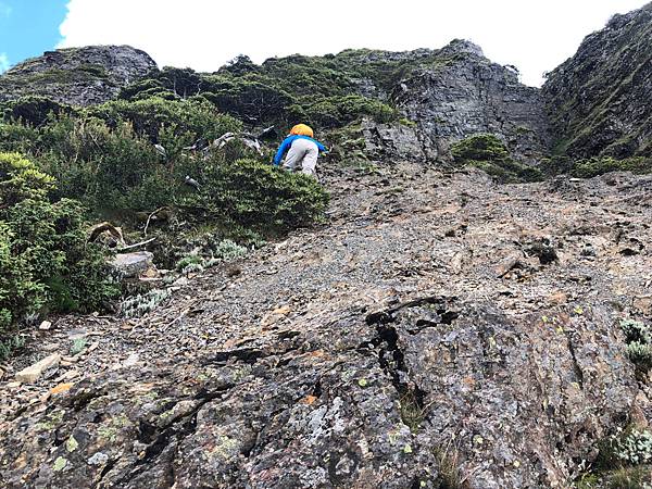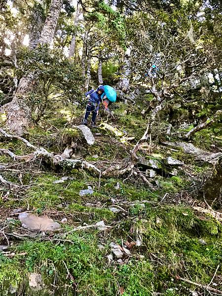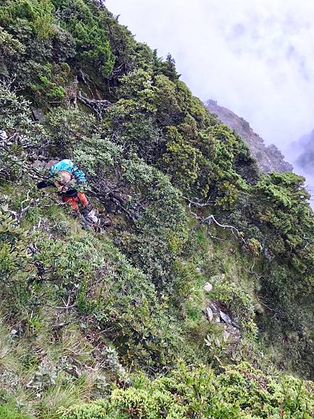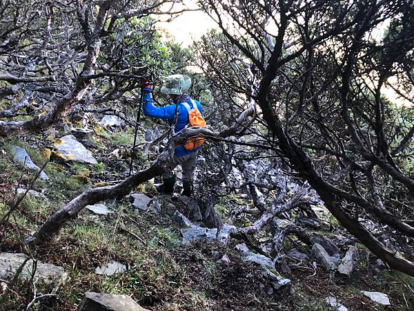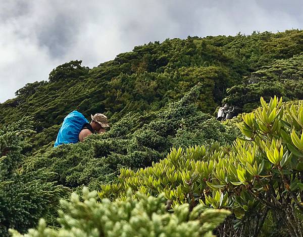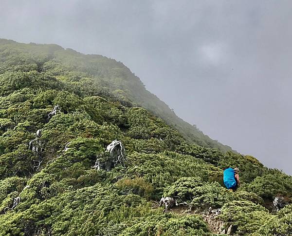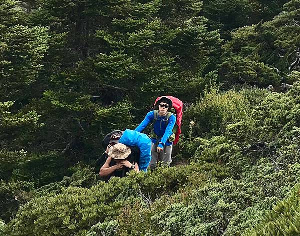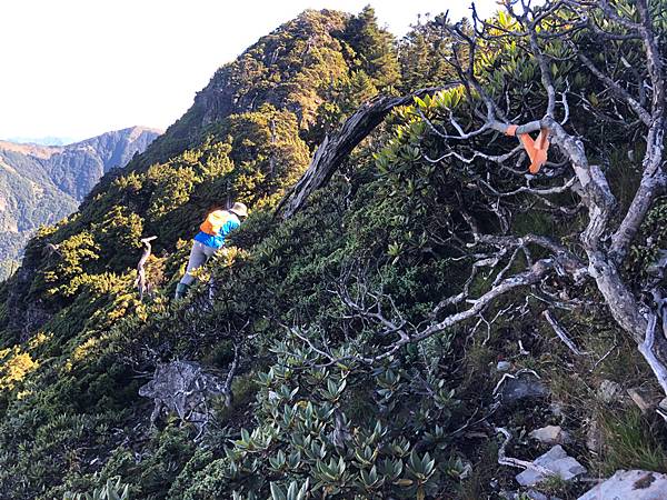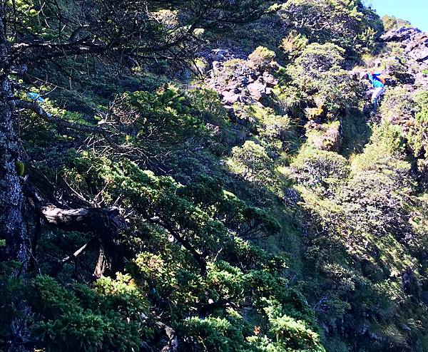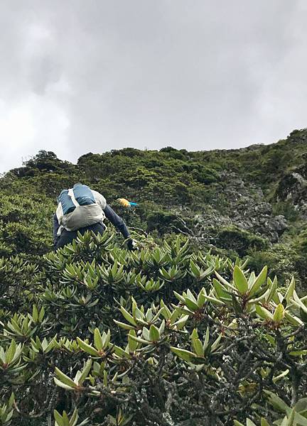 ?上攀地形陡峭度60-90度皆有,路程也是要鑽過刺柏、小蘗、杜鵑林等植物,所以記得走這段時穿厚一點、戴手套or穿上雨褲等方式(刺痛總比摔下去好)。