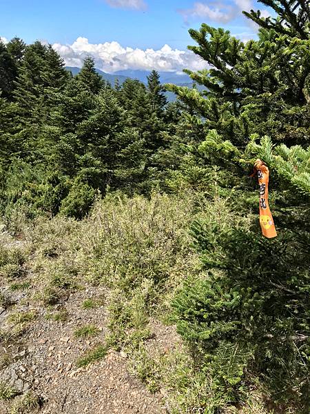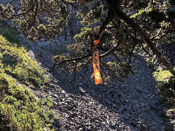 ?9:25 腰繞到稜線後,上方就是雲達卡山,旁邊就是碎石坡,不用太下去碎石坡,便可看到姐們所綁的明顯橘色布條,進入稜線。