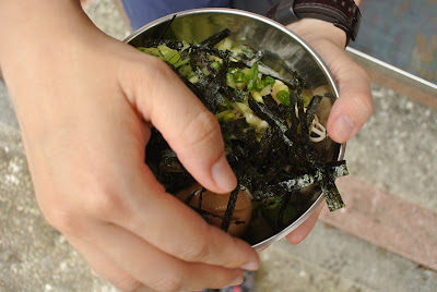 1. 把蔥(越細越好)、小黃瓜(開心就好)、紫菜(用剪得比較好)切成細絲