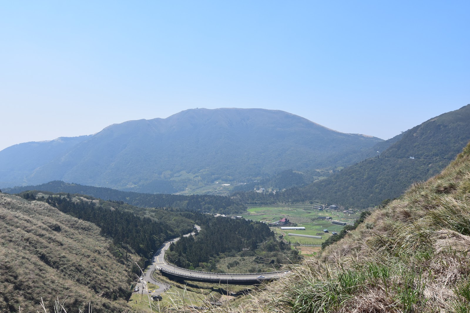 -翻越主峰後看到另一面的景象,左方的山陵是接下來的路線,大屯山亞群,下方的公路則是台二甲線,陽金公路。