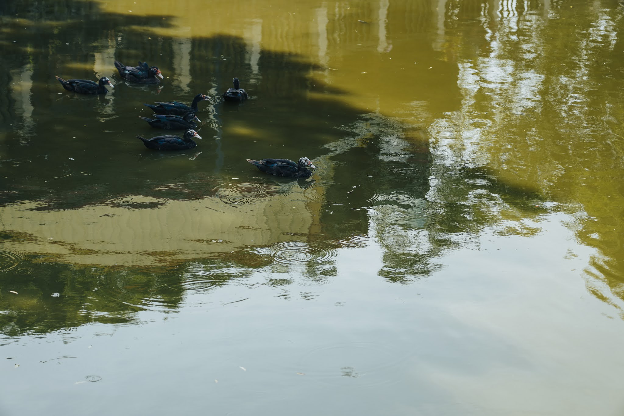 月眉池裡的鴨子。有騎機車的人,應該都可以明白停紅燈時,要找一塊陰影的道理吧?